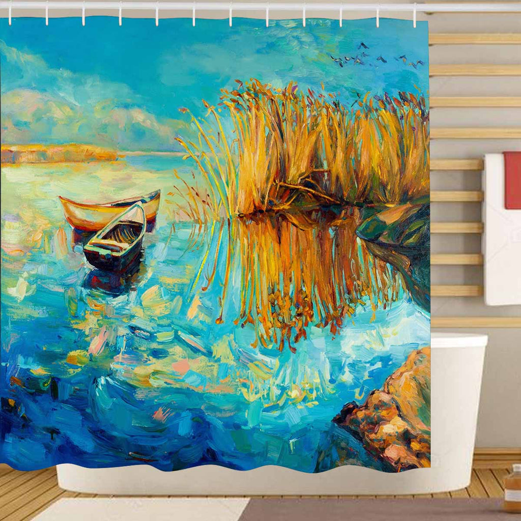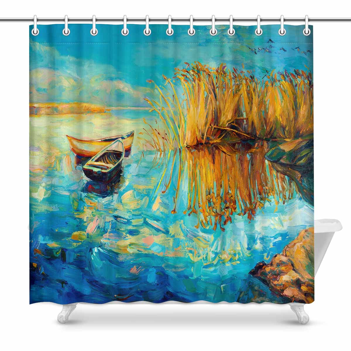 Arts themed shower curtains print with Original oil painting of boats,beautiful lake and Fern on canvas