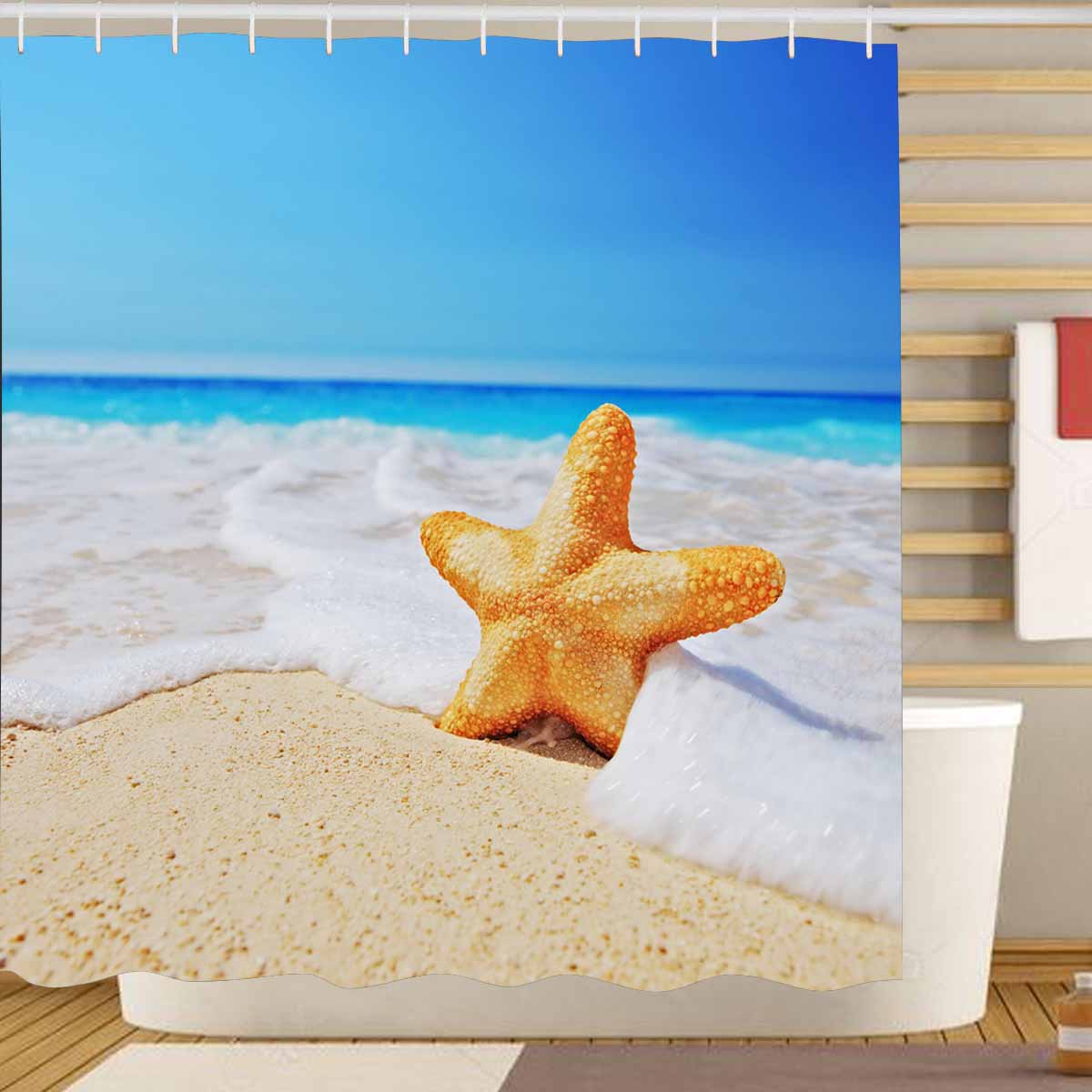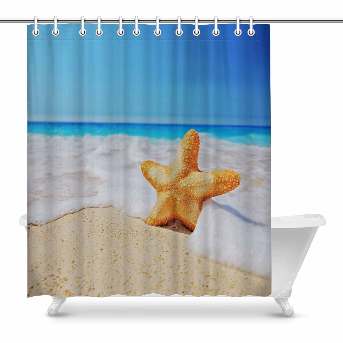 Shower Curtains print graphic with Starfish on beach