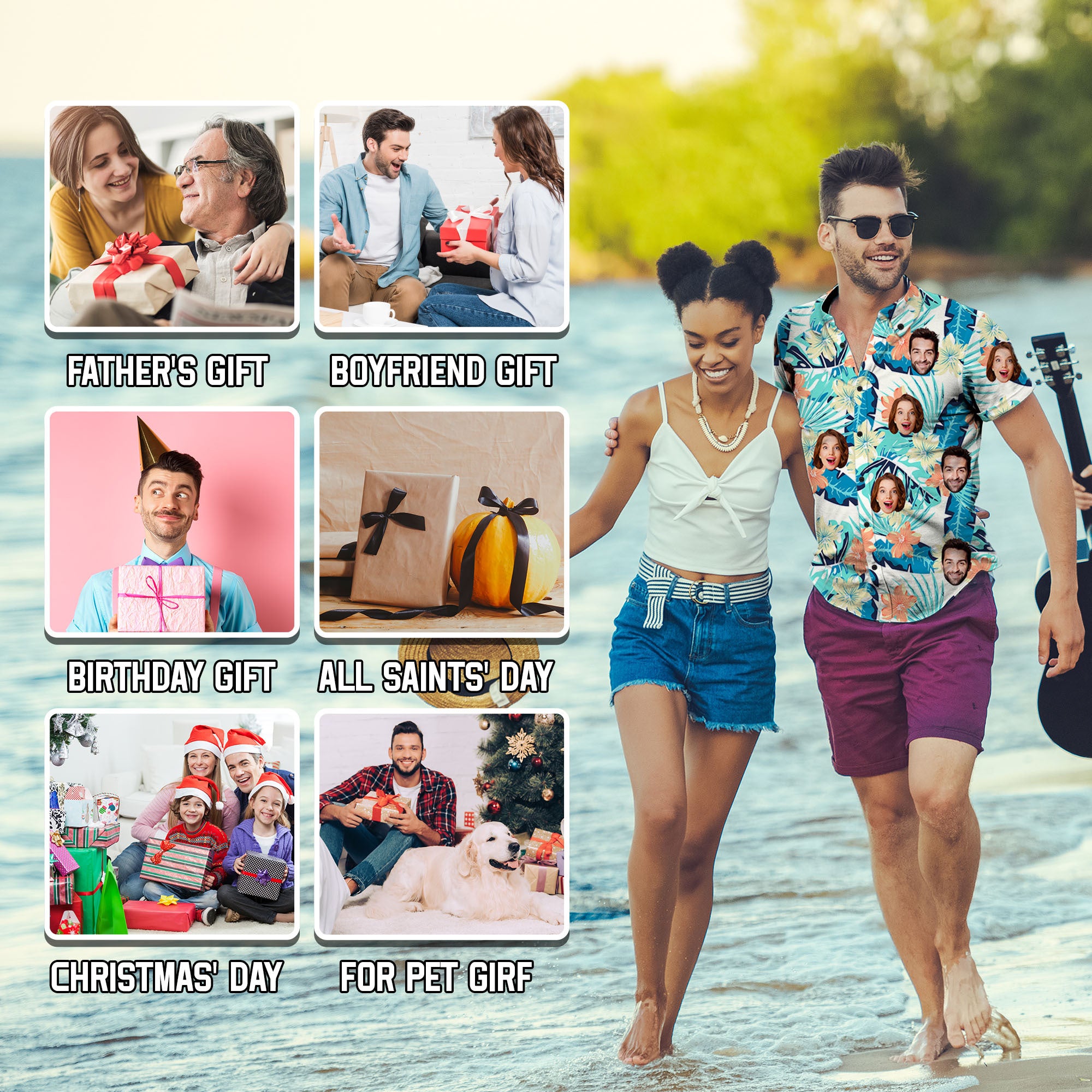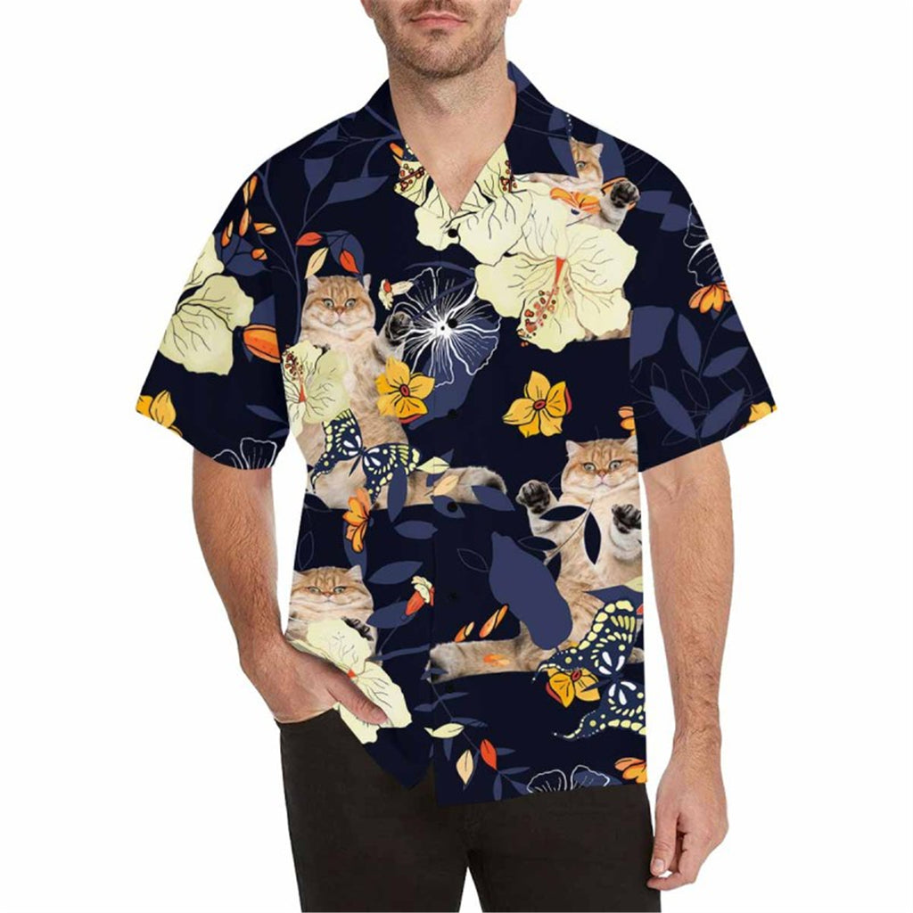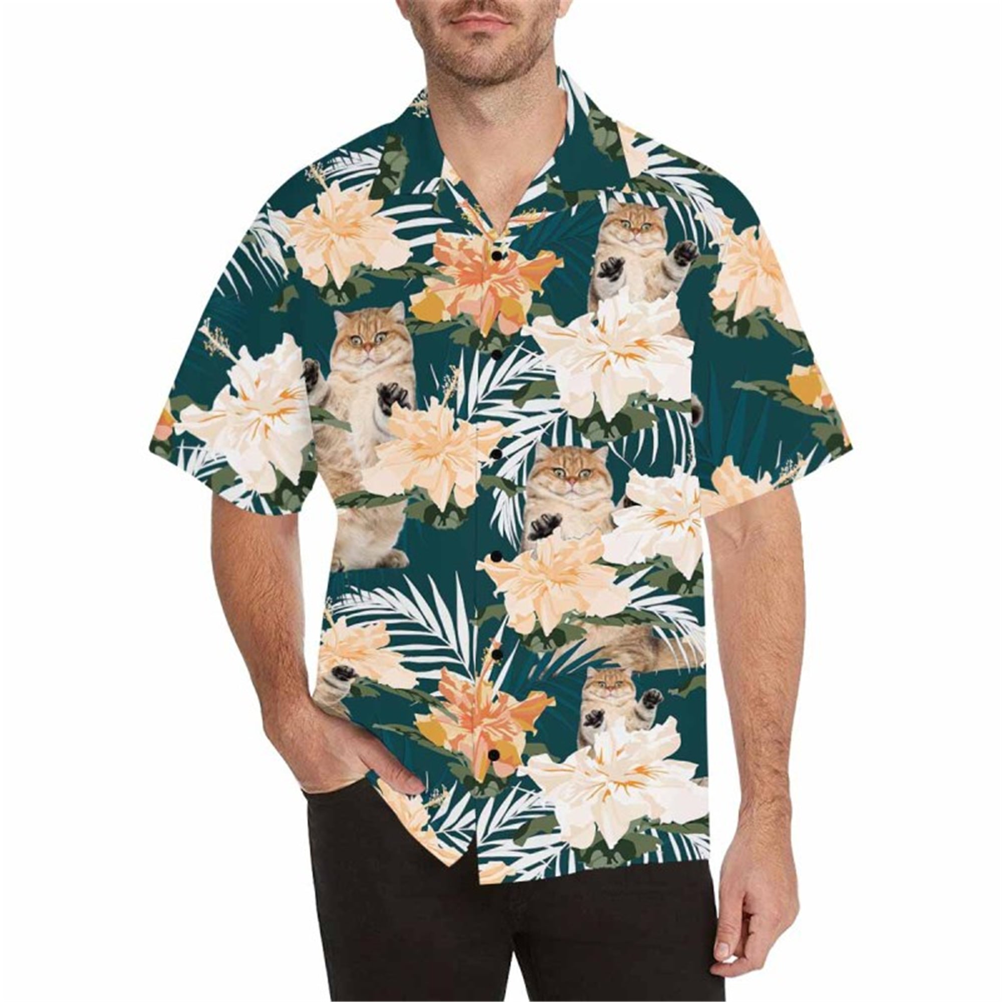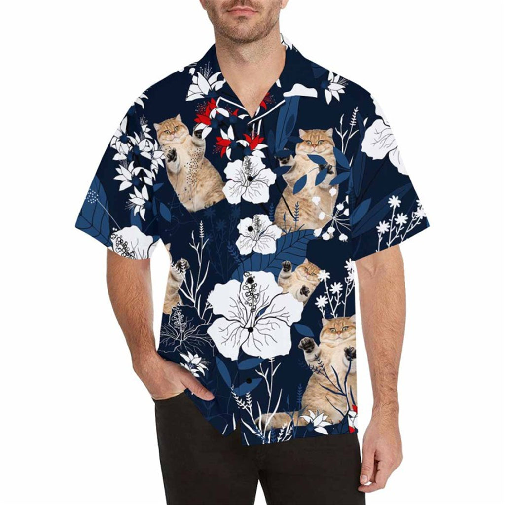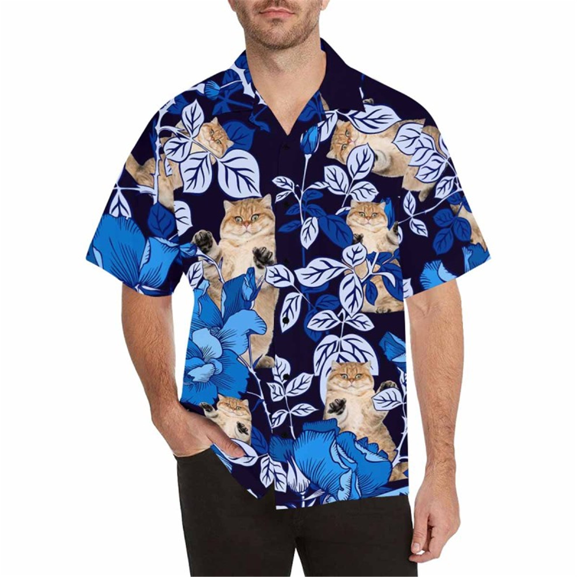 Custom 3D Print Hawaiian Shirt with Cat for Men Personalized Blue Leaves Aloha Beach Shirt Tropical Flower Photo Short Sleeve