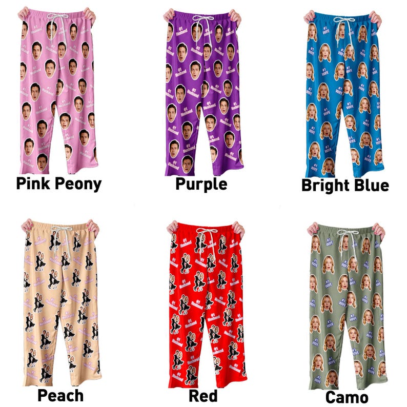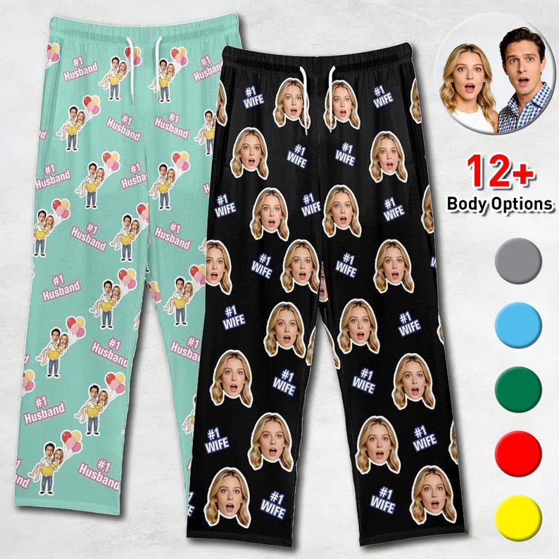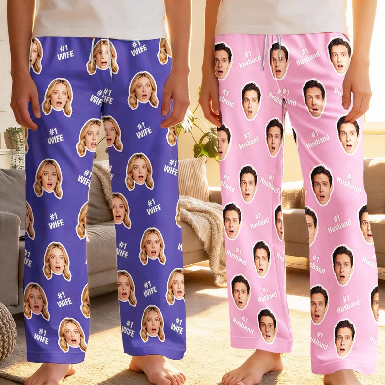 Custom Couple Face Pajama Pants, Photo Gift for Wife Husband, Text on Pajama Bottoms