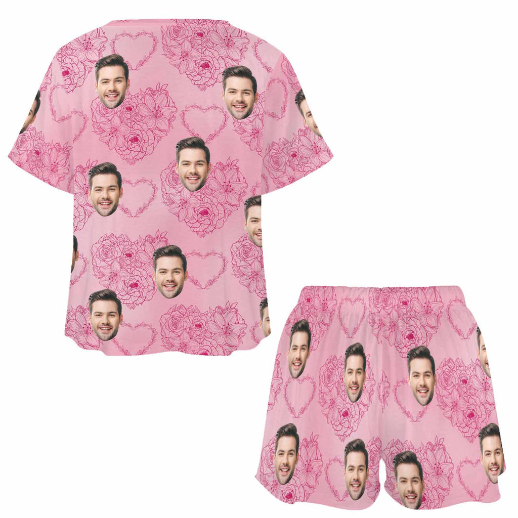 Custom Valentine round neck Pajamas Set Photo for women Personalized Short Sleepwear with Face for GF Wife Mom Gift