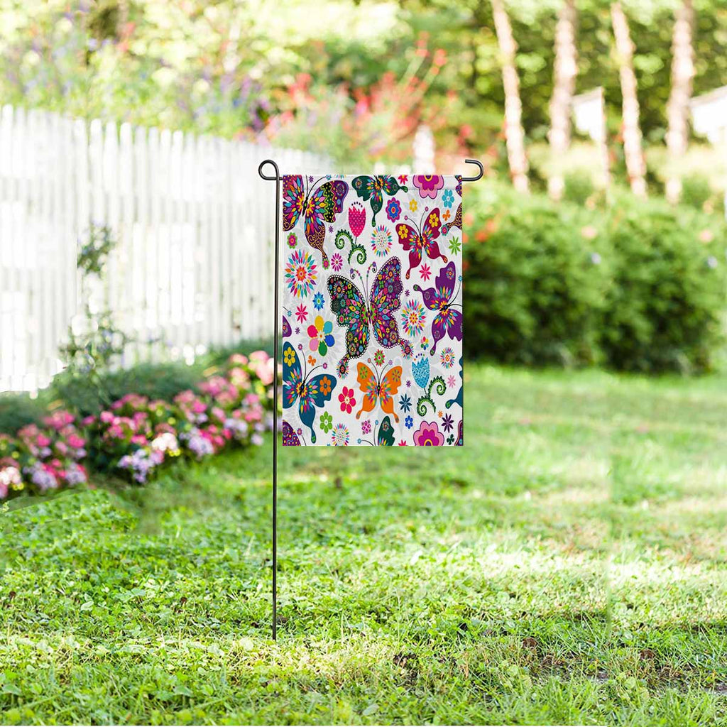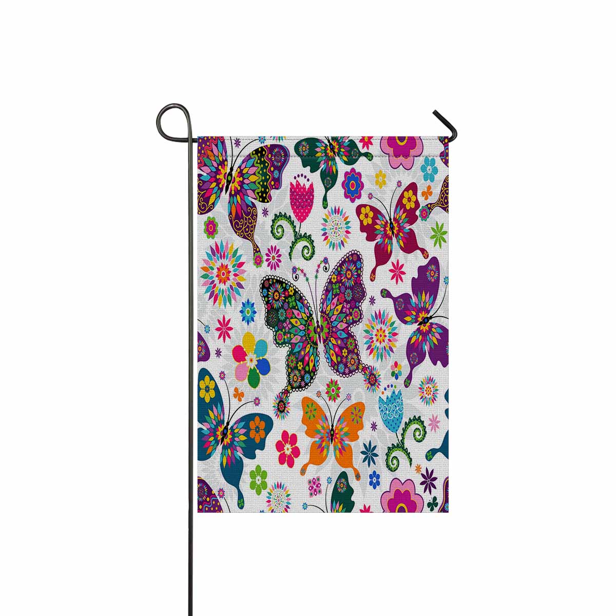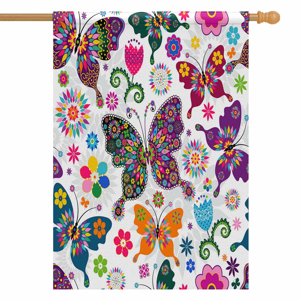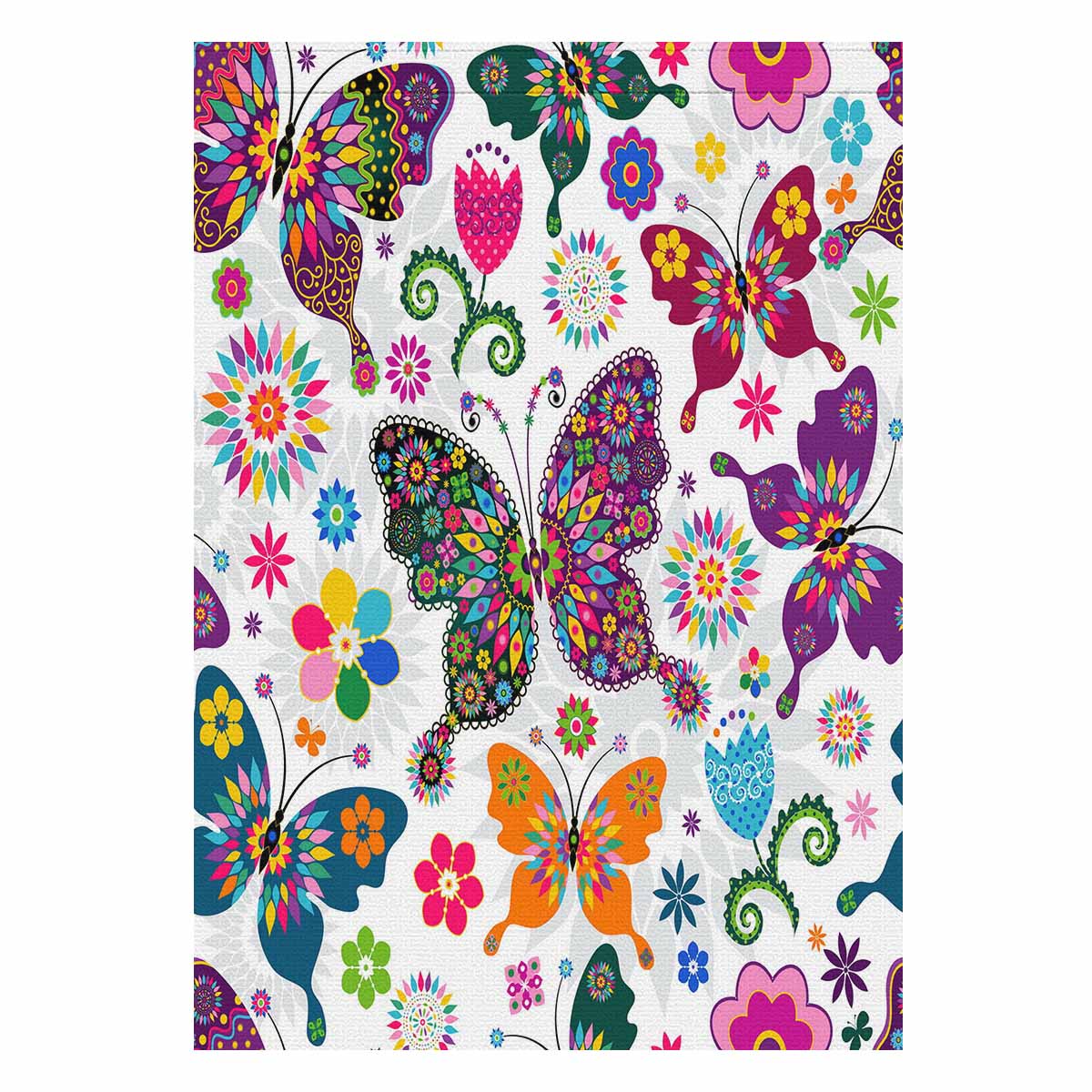 Garden Flags printed Butterfly and Birds themed with White floral pattern with flowers and butterflies