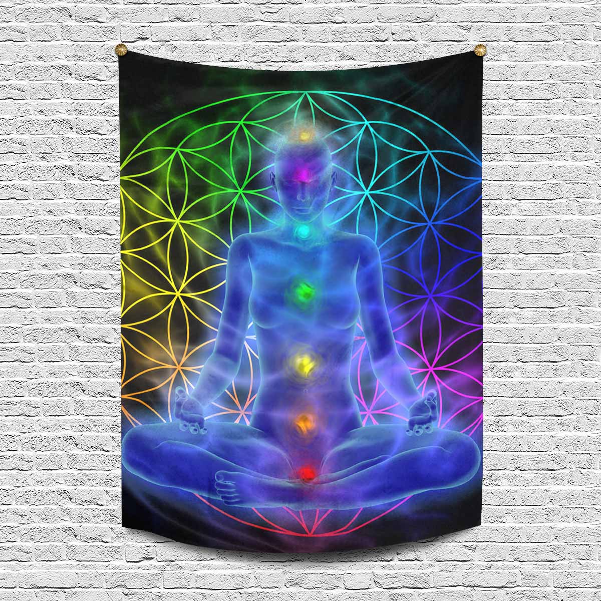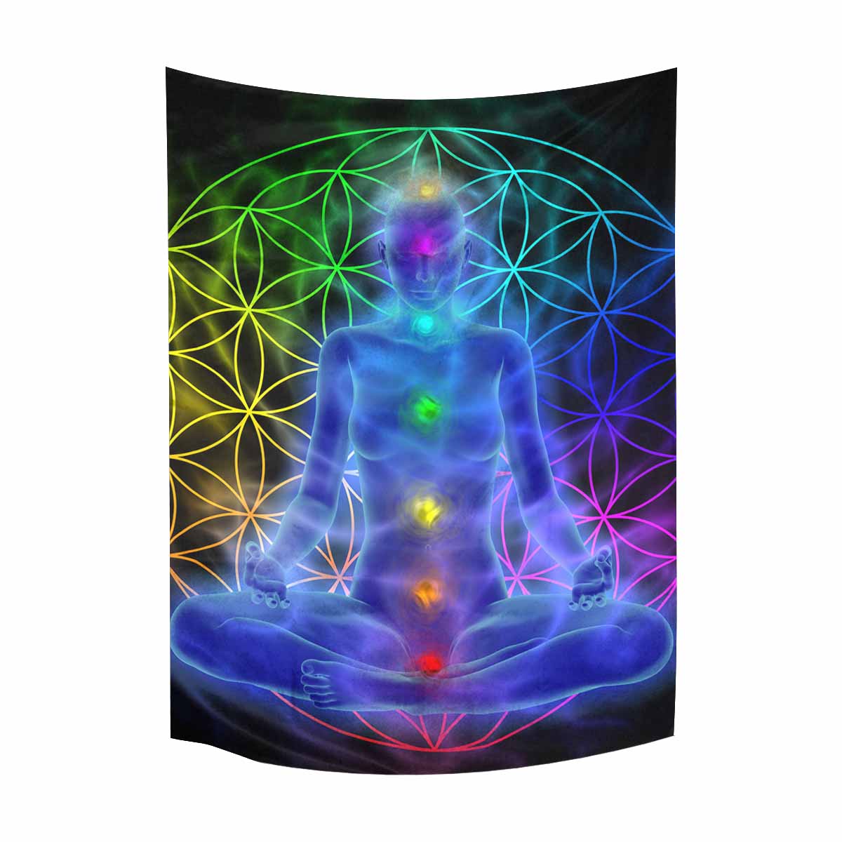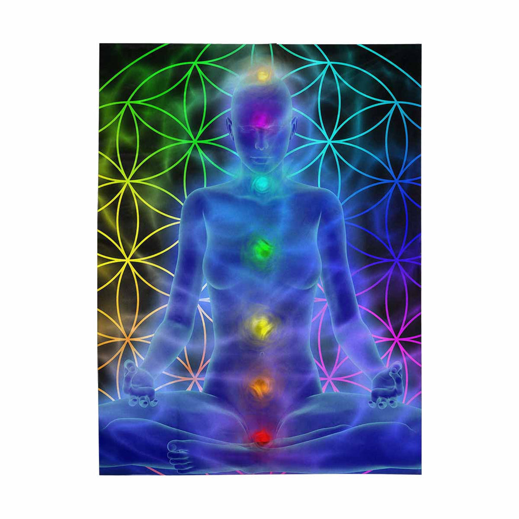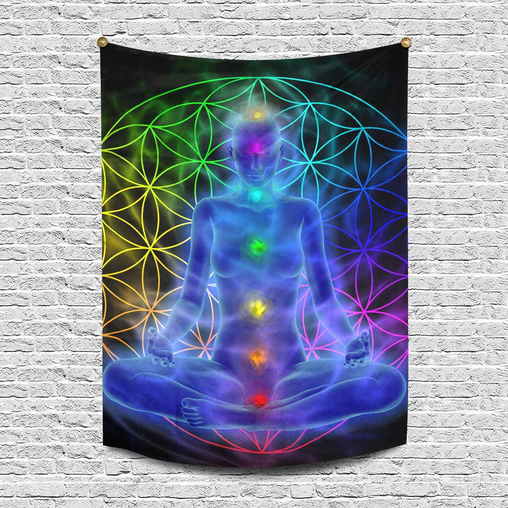 Mandala themed Wall Tapestries Illustration of woman meditating, symbol flower of life