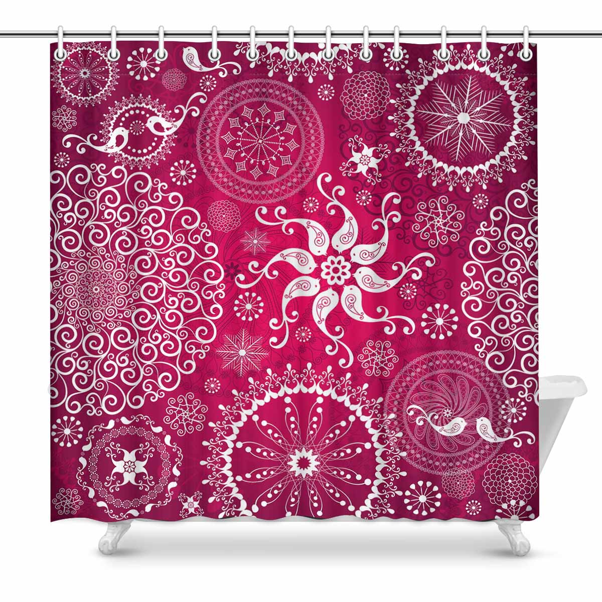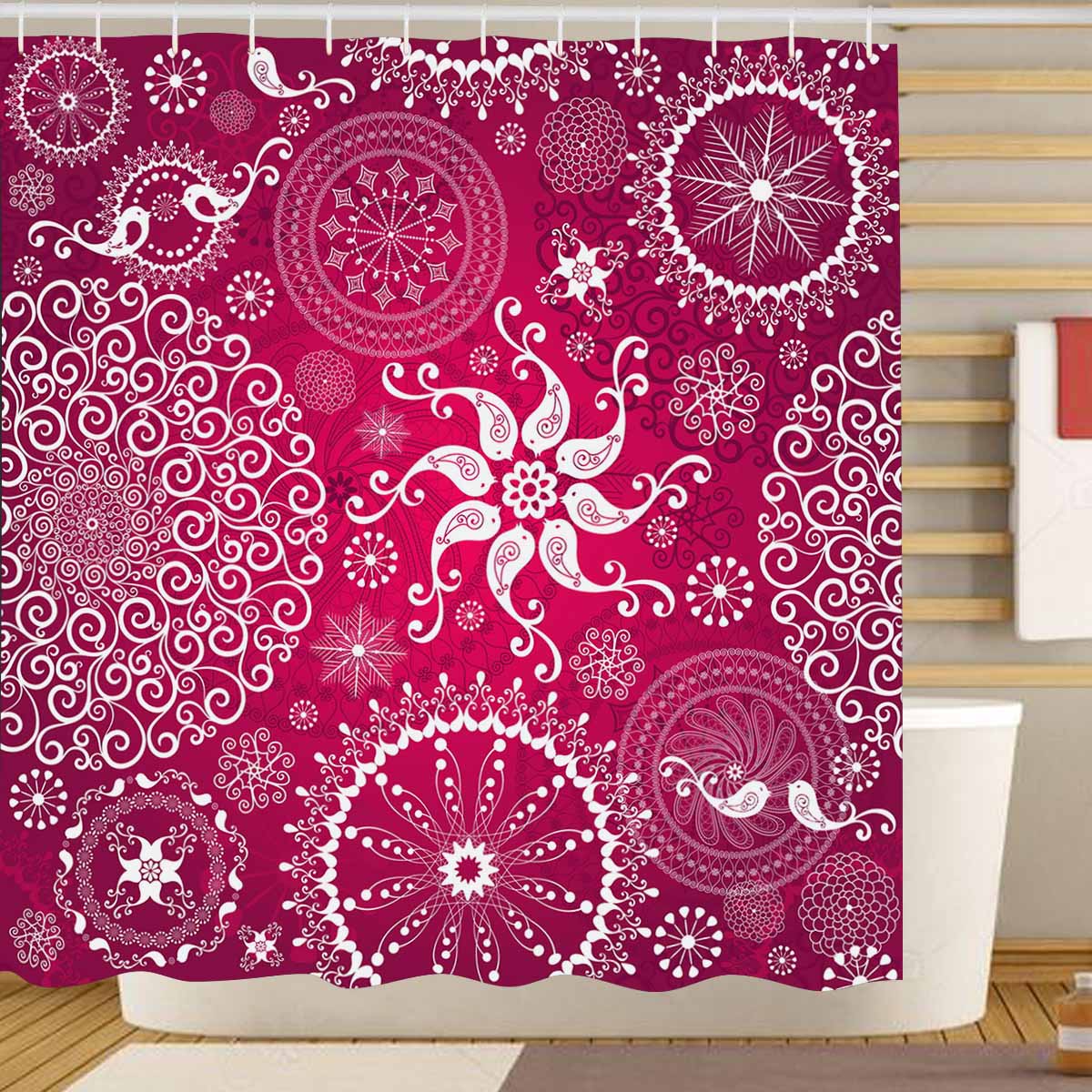 Mandala themed Shower Curtains print with red repeating pattern with white stylized birds and vintage snowflakes