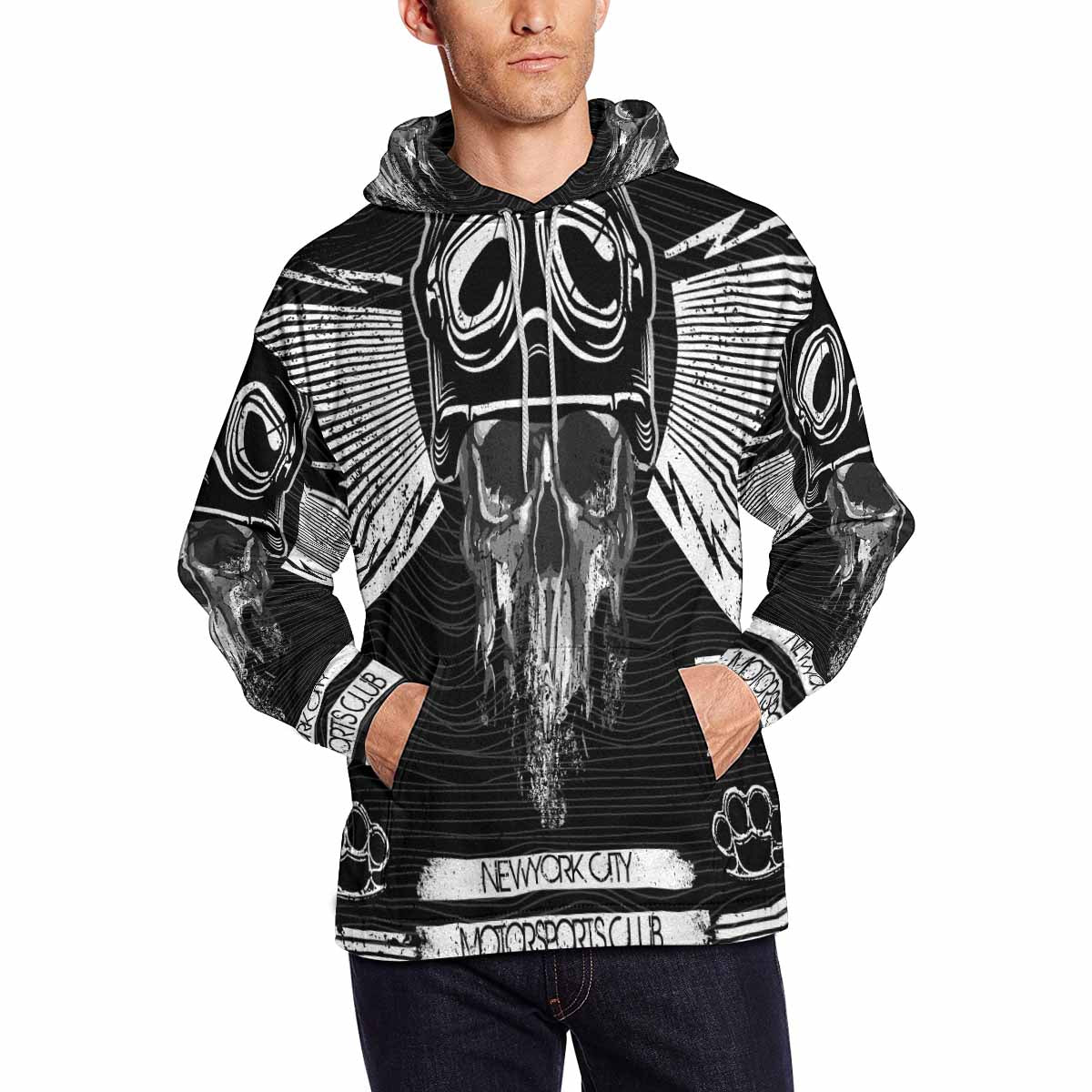 - Dye-sublimation printing, Personalized all-over print hoodie for men.