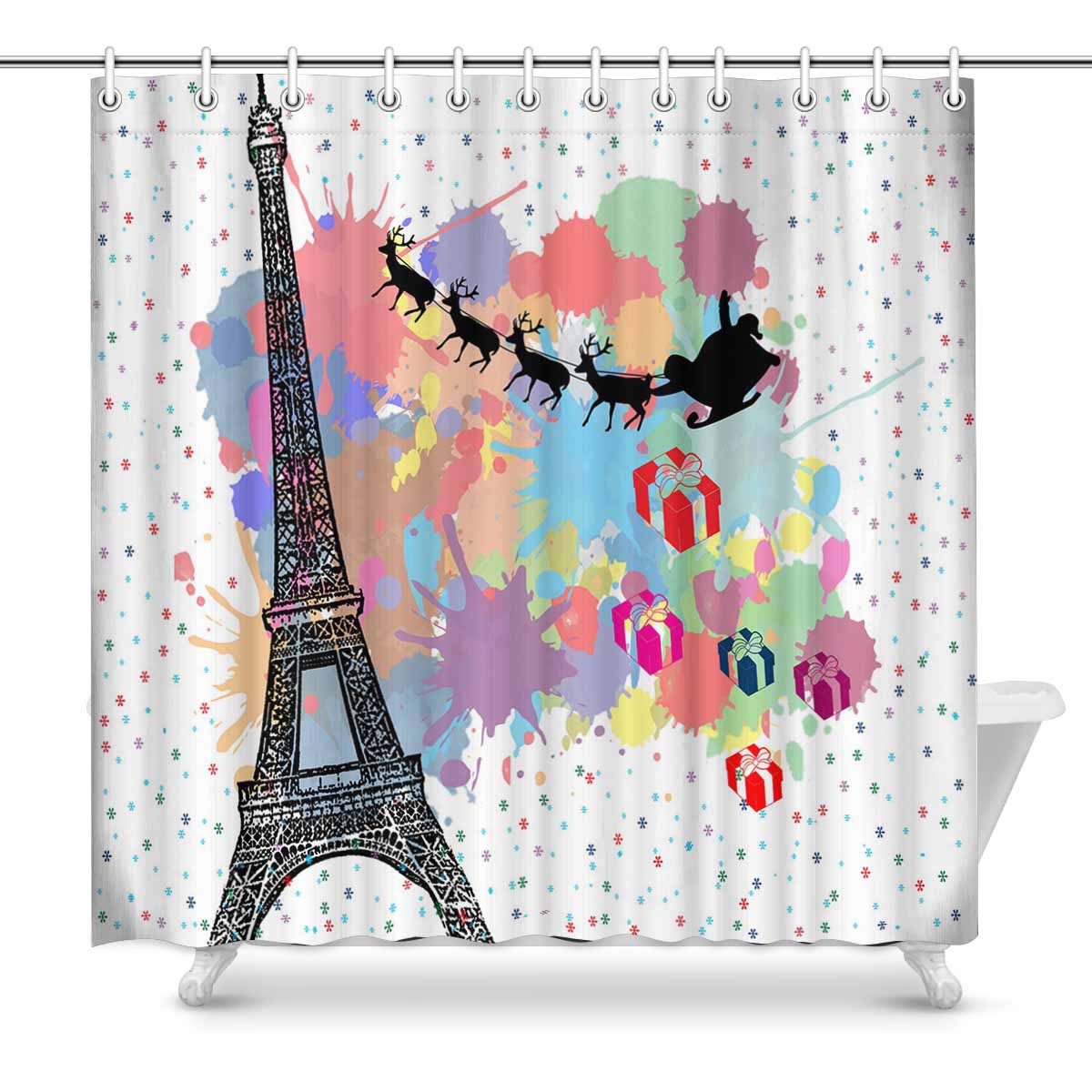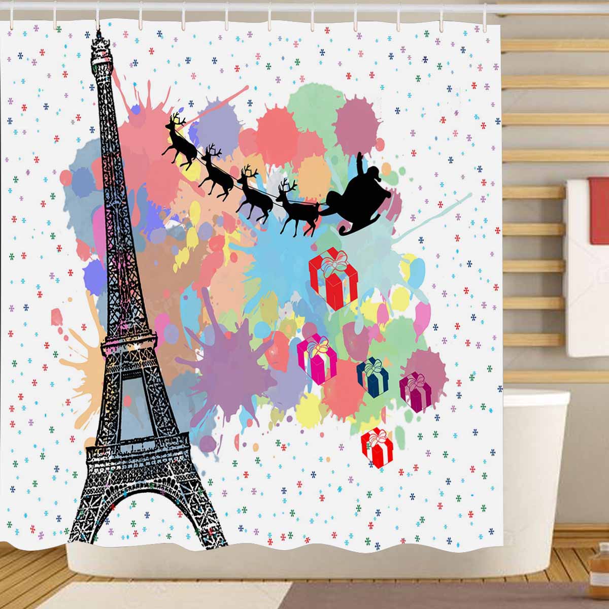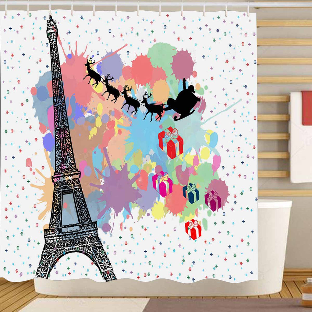 Mordern And Coutry themed Shower Curtains print Santa's sleigh flying over Paris with clolored splash background