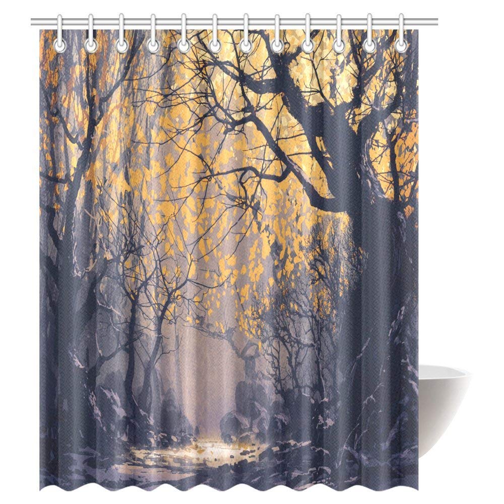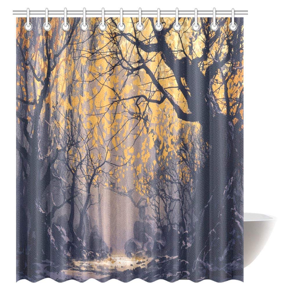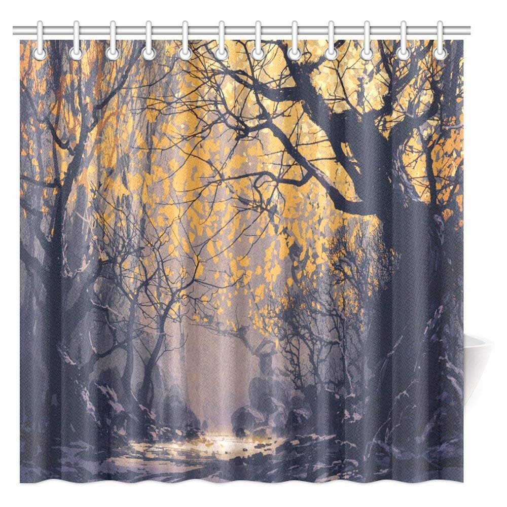 Landscape Painting Shower Curtain, Night Scene of Autumn Forest Fabric Bathroom Shower Curtain with Hooks