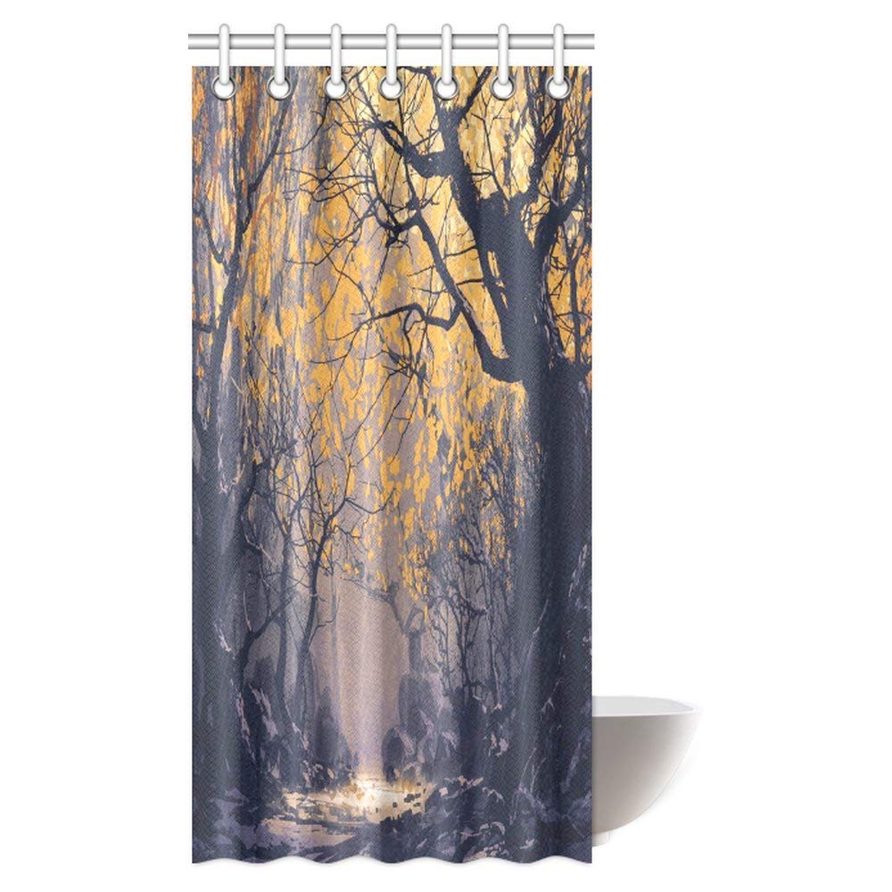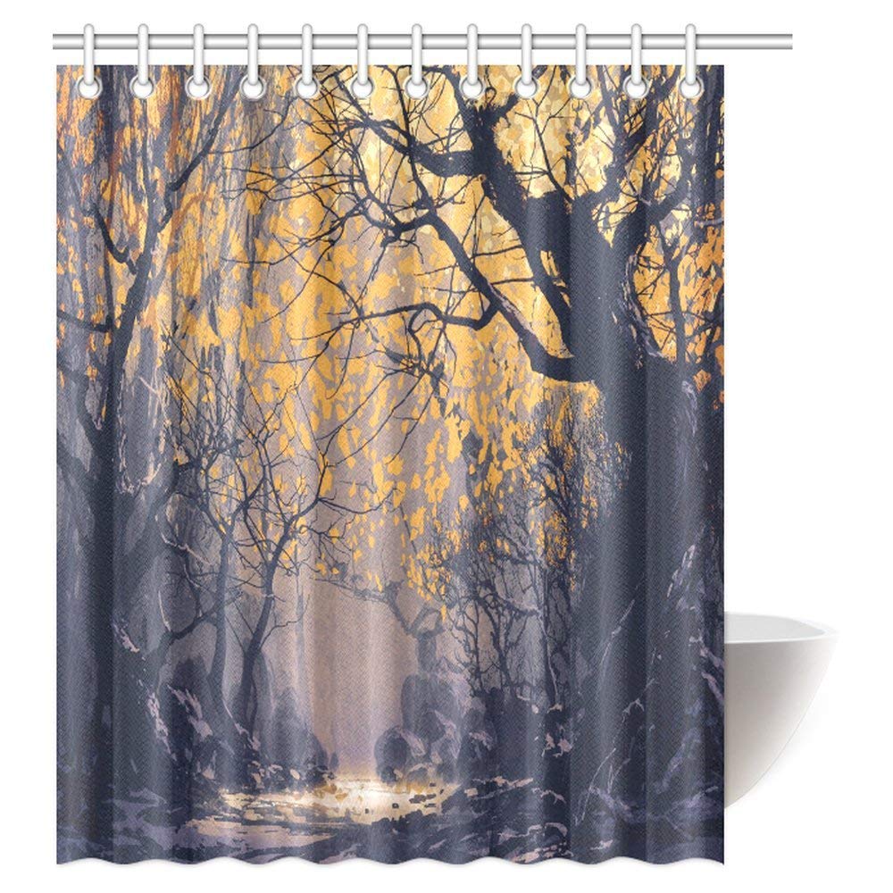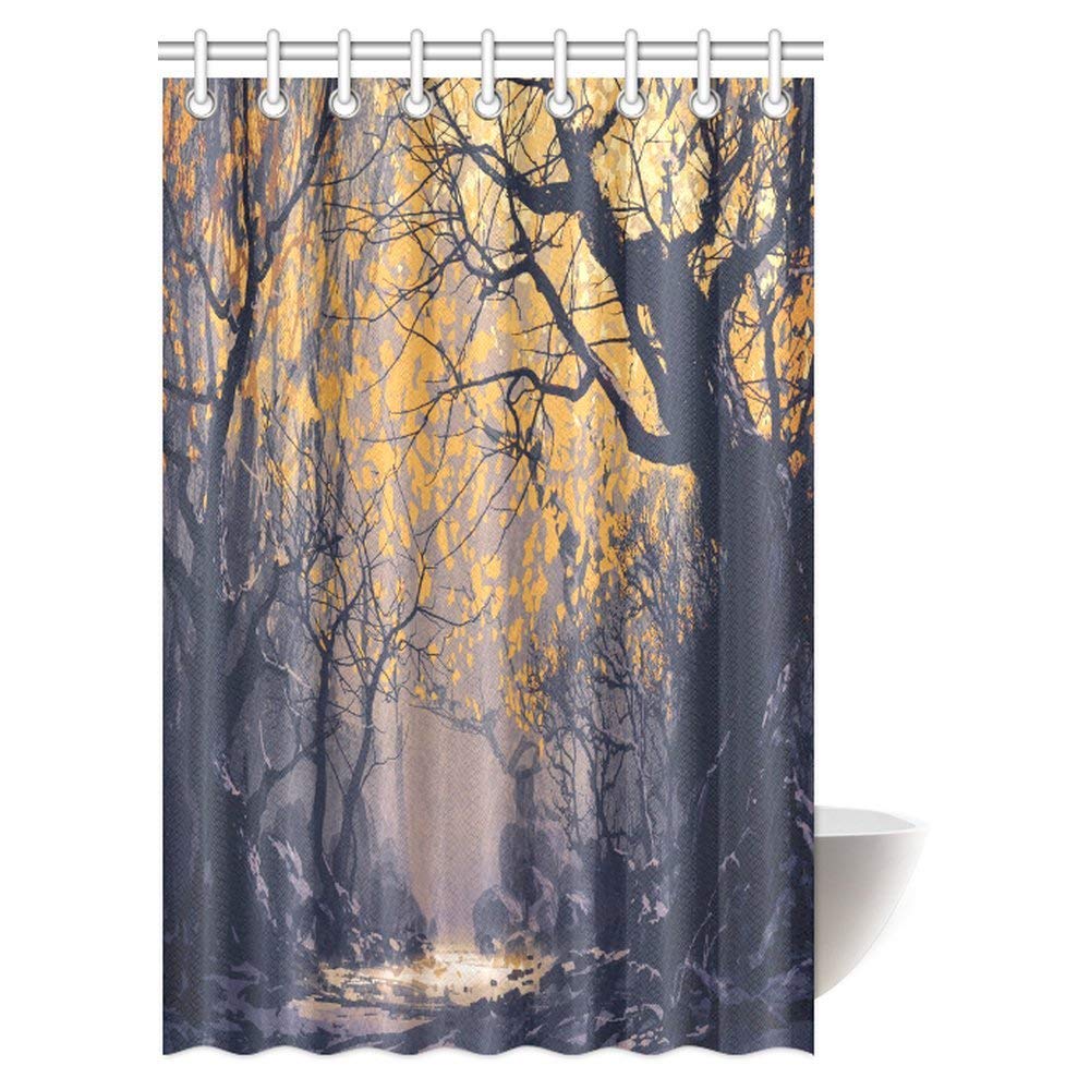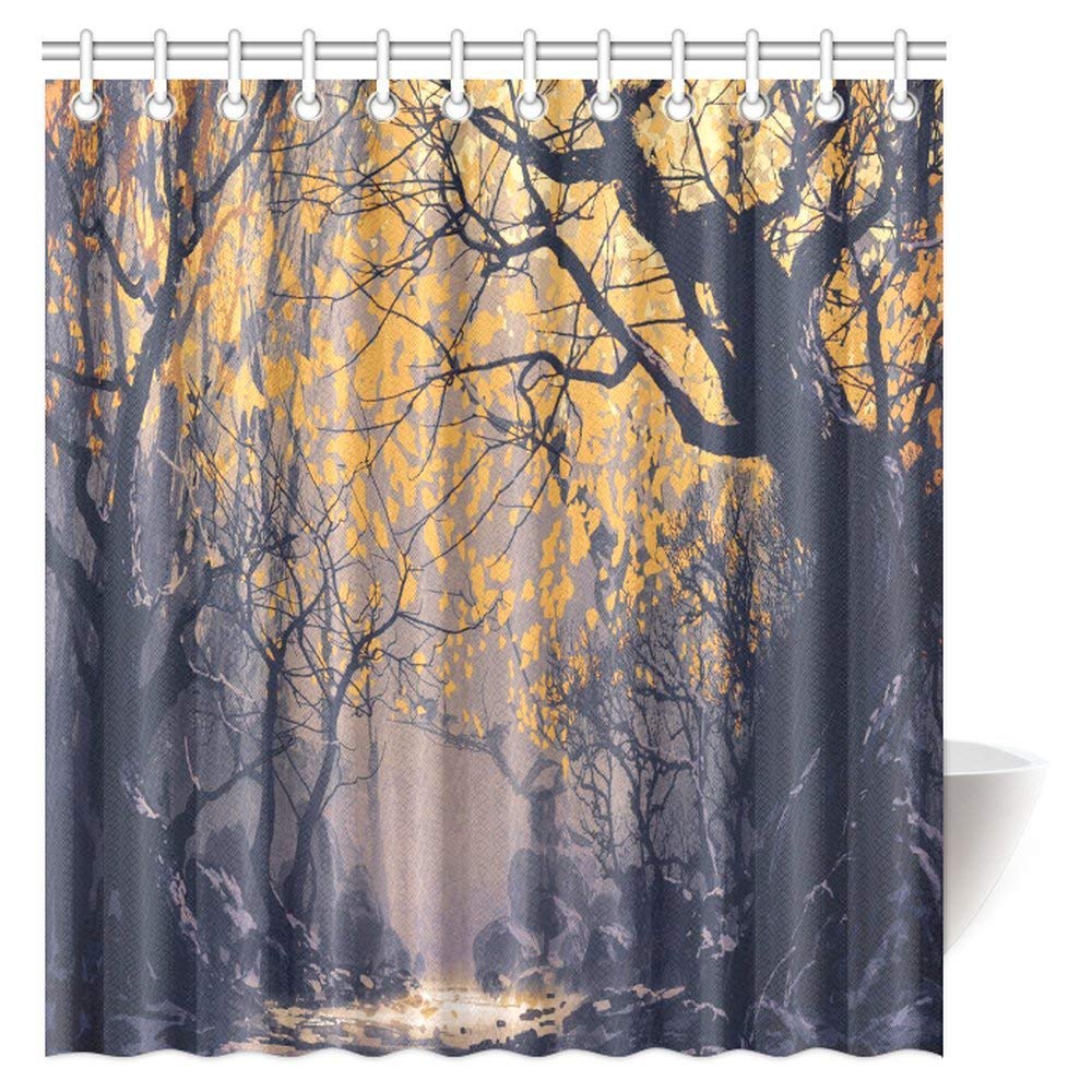 Landscape Painting Shower Curtain, Night Scene of Autumn Forest Fabric Bathroom Shower Curtain with Hooks