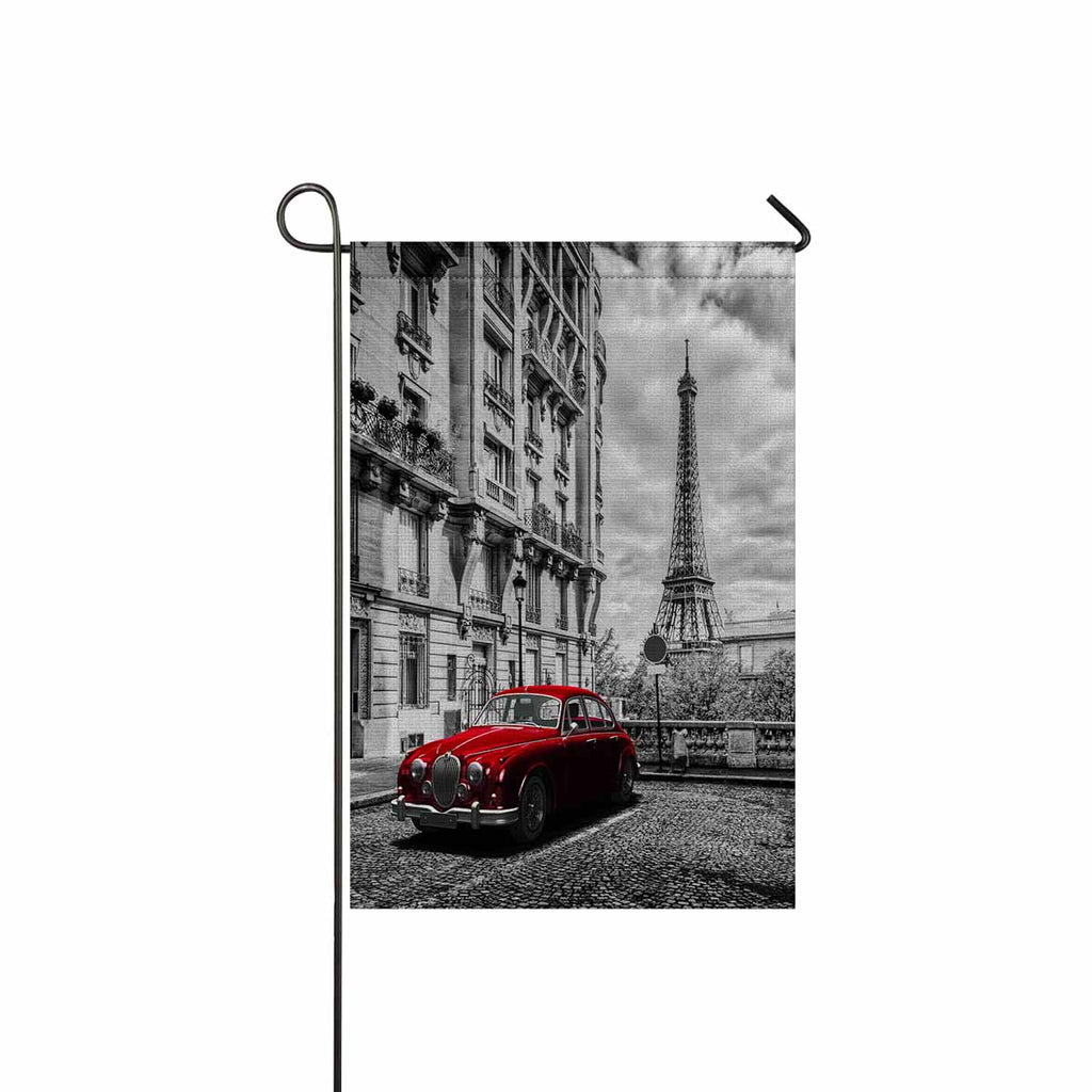 Garden Flags printed Nature Landscape themed with Eiffel Tower seen from the street with red retro limousine car
