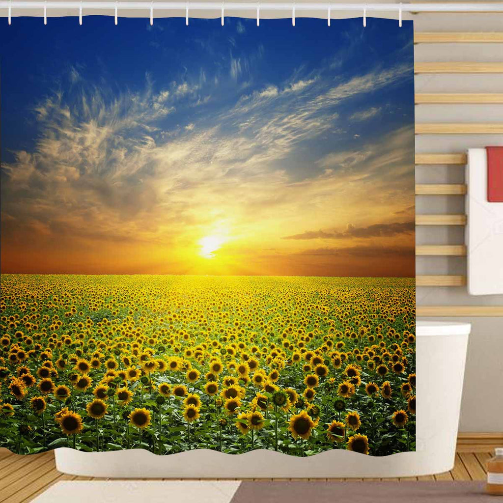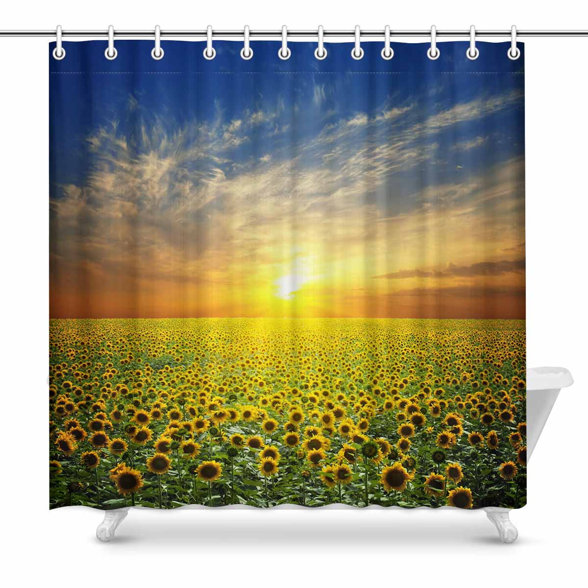 Nature Landscape themed Shower Curtains print beauty sunset over sunflowers field