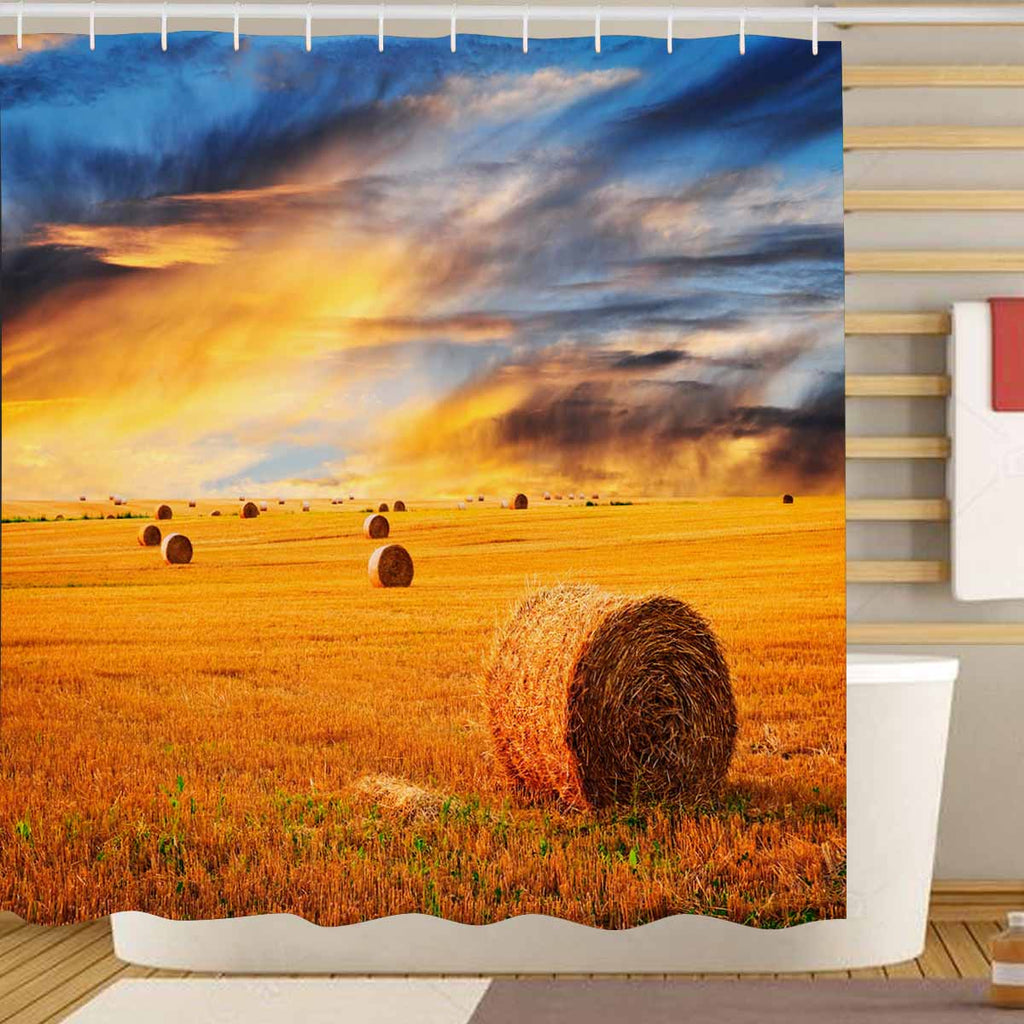 Nature Landscape themed Shower Curtains print Golden sunset over farm field with hay bales