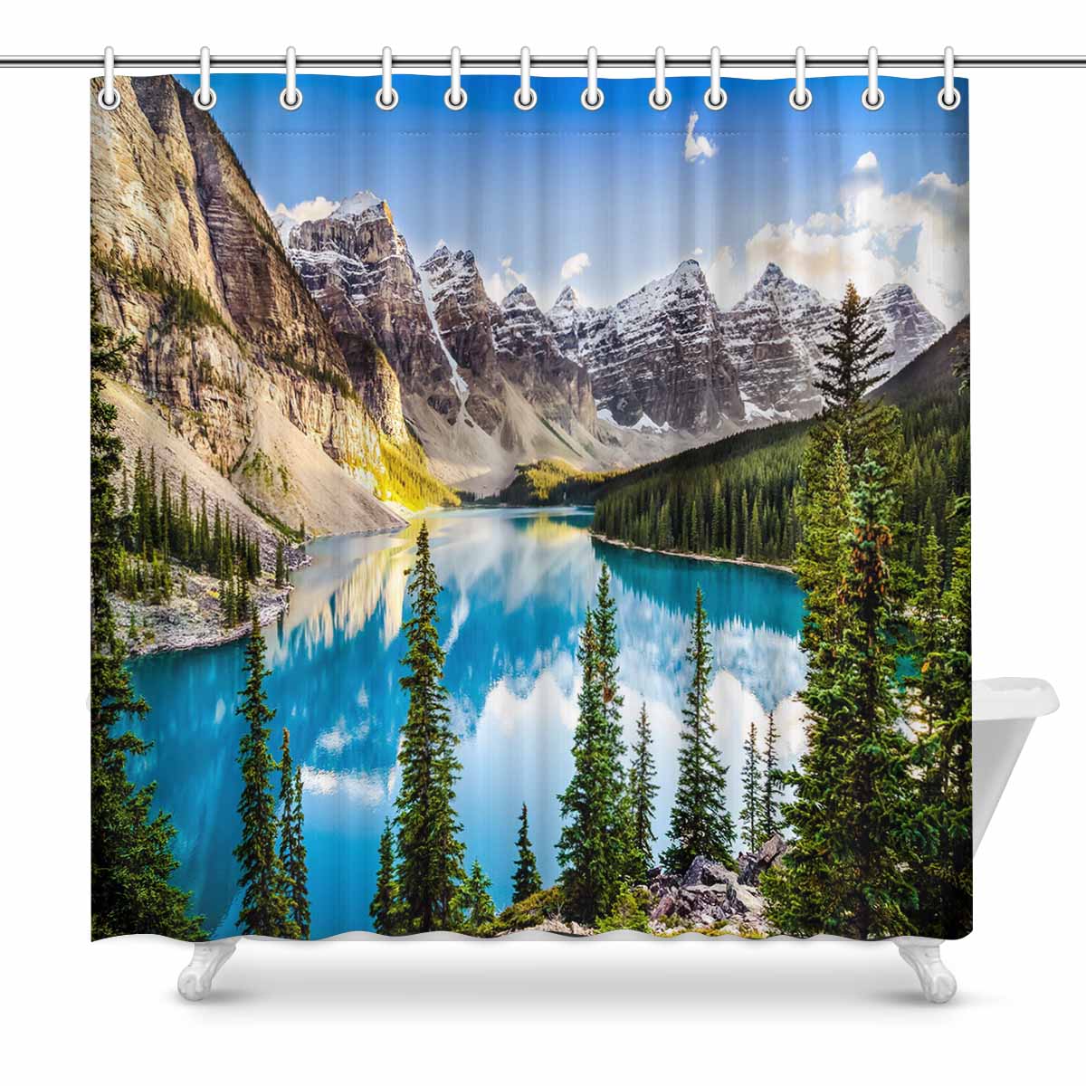 Nature Landscape themed Shower Curtains print Landscape view of Moraine lake and mountain range at sunset in Rocky Mountains