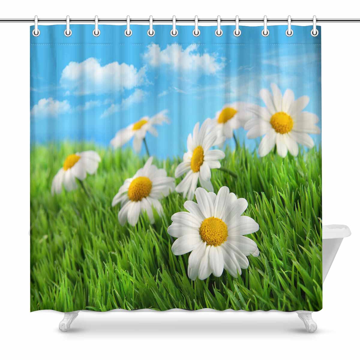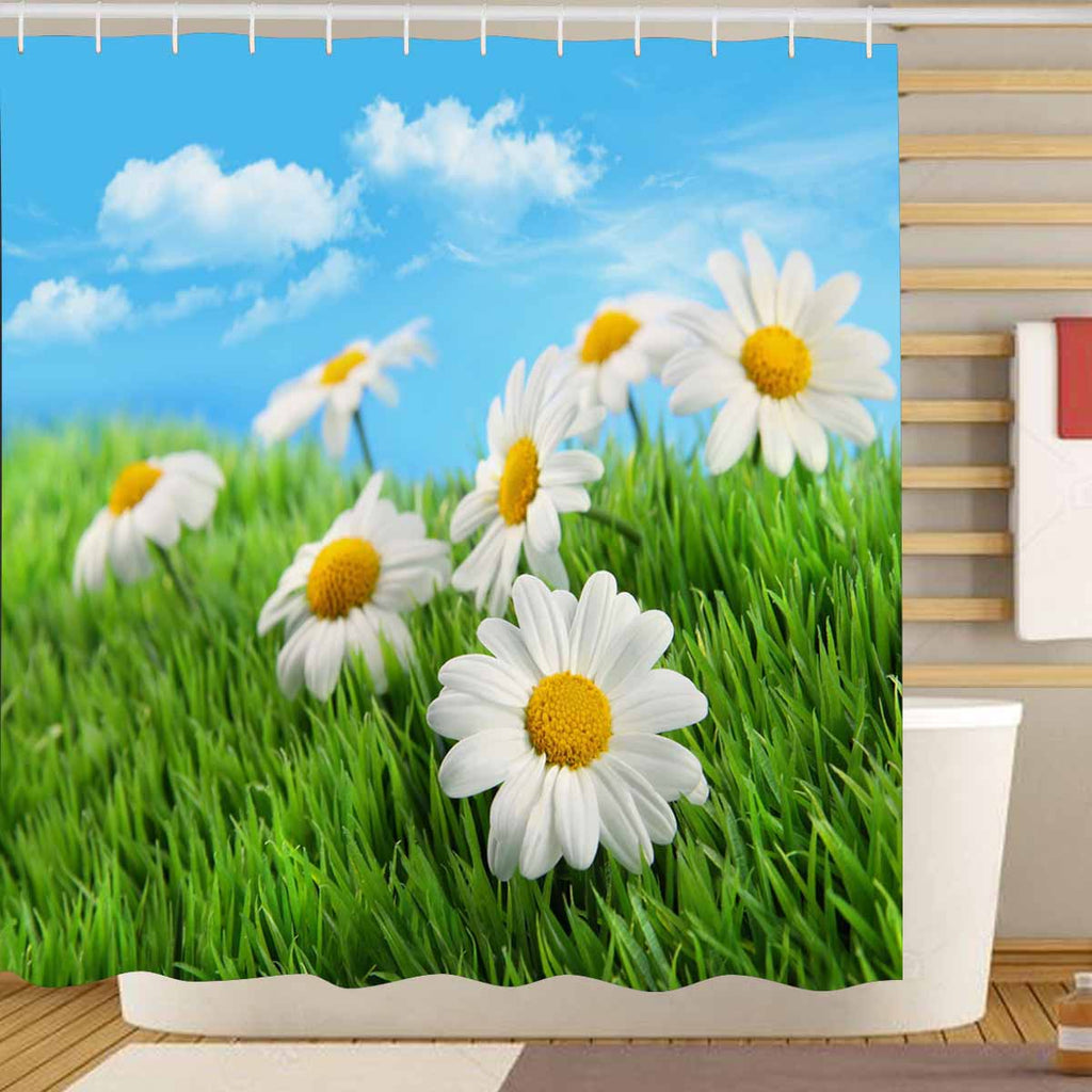 Nature Landscape themed Shower Curtains print Little daisies in grass against a blue sky