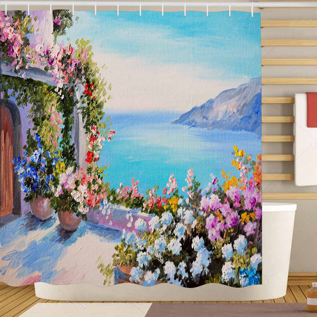 Nature Landscape themed Shower Curtains print Oil painting house near sea