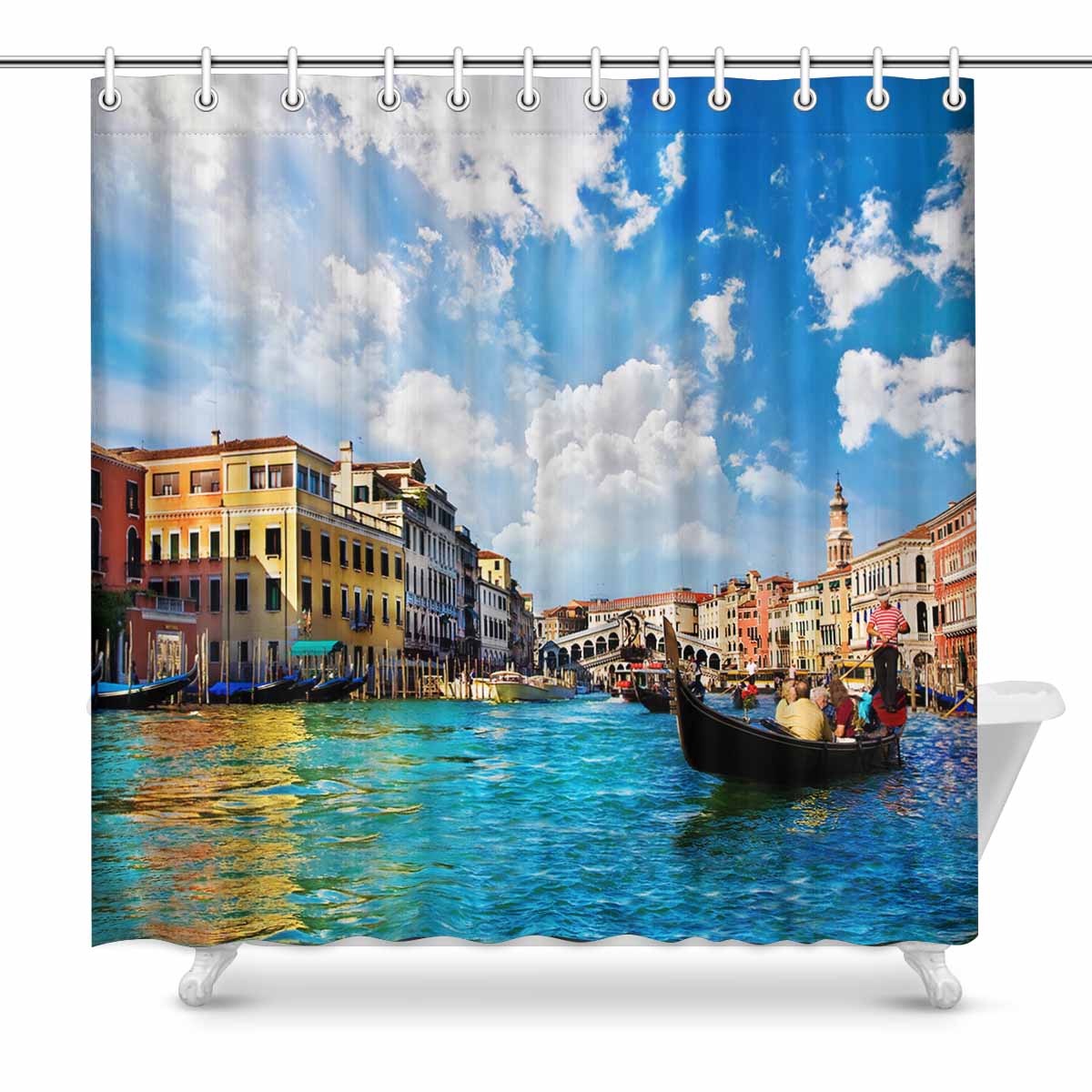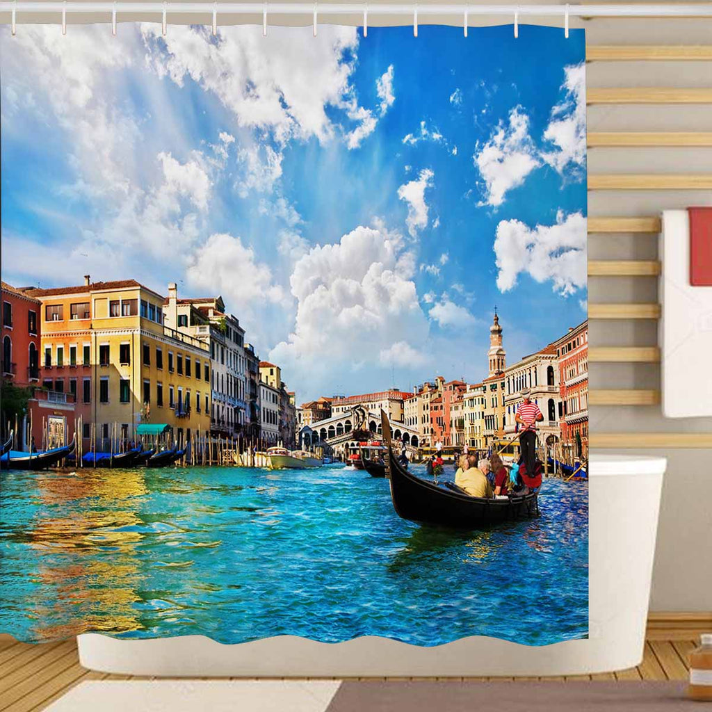 Nature Landscape themed Shower Curtains print Venice Grand canal with gondolas and Rialto Bridge, Italy in summer bright day