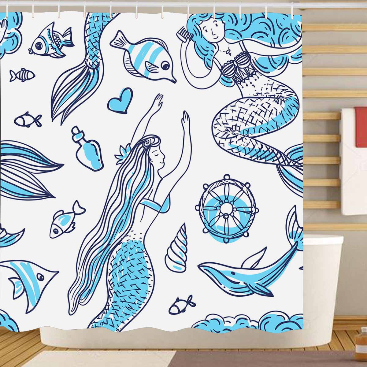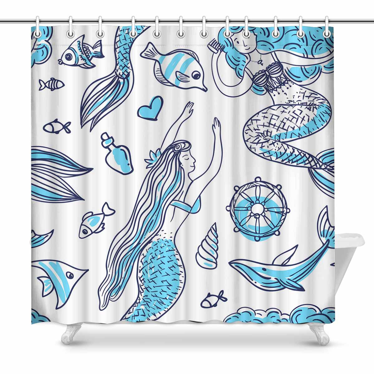 Nautical and Mermaid themed Shower Curtains print Hand drawn illustration mermaid.