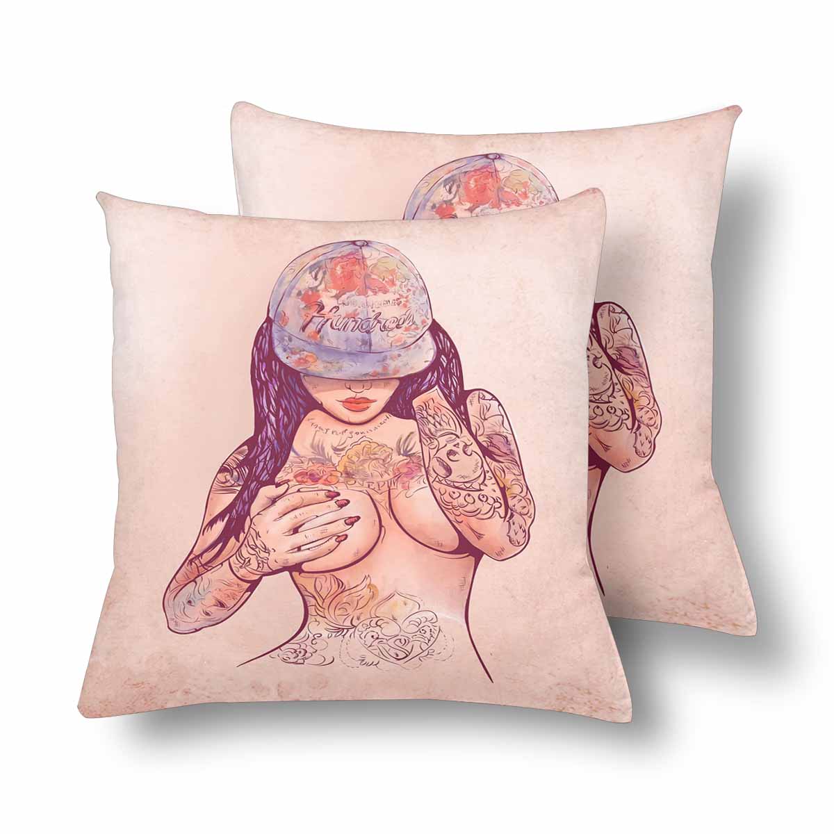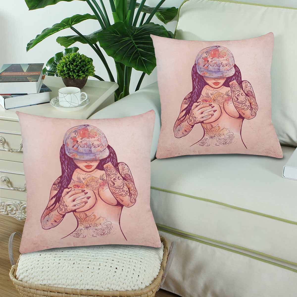 Vintage themed Pillow Cases printed with Casual girl in a cap and tattoos
