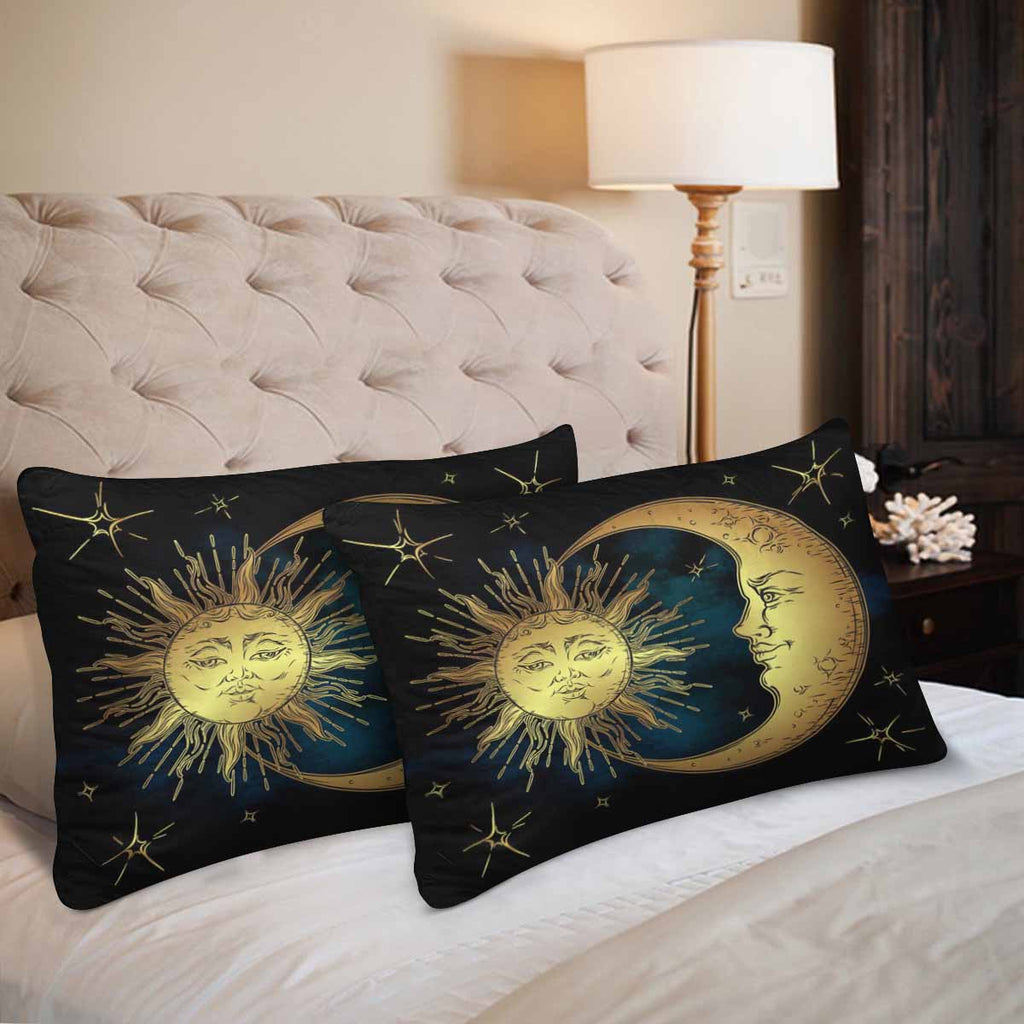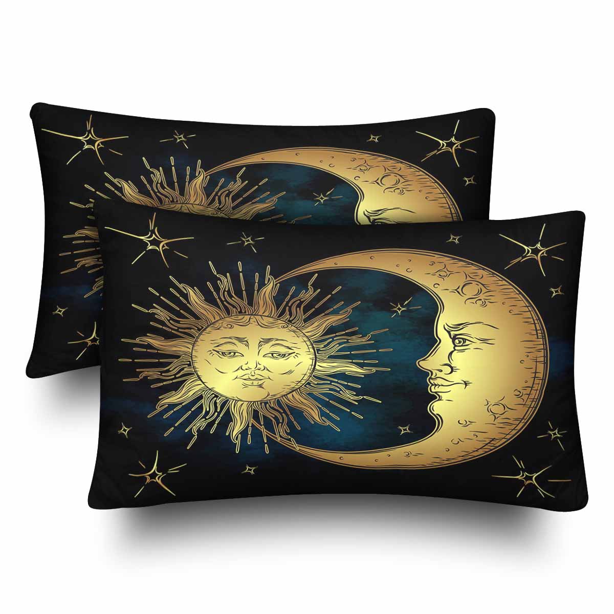 Vintage themed Rectangle Pillow Cases printed Antique style hand drawn art golden sun, crescent moon and stars over blue black sky