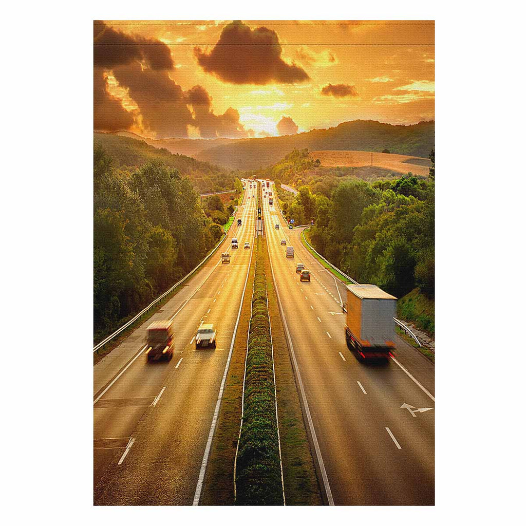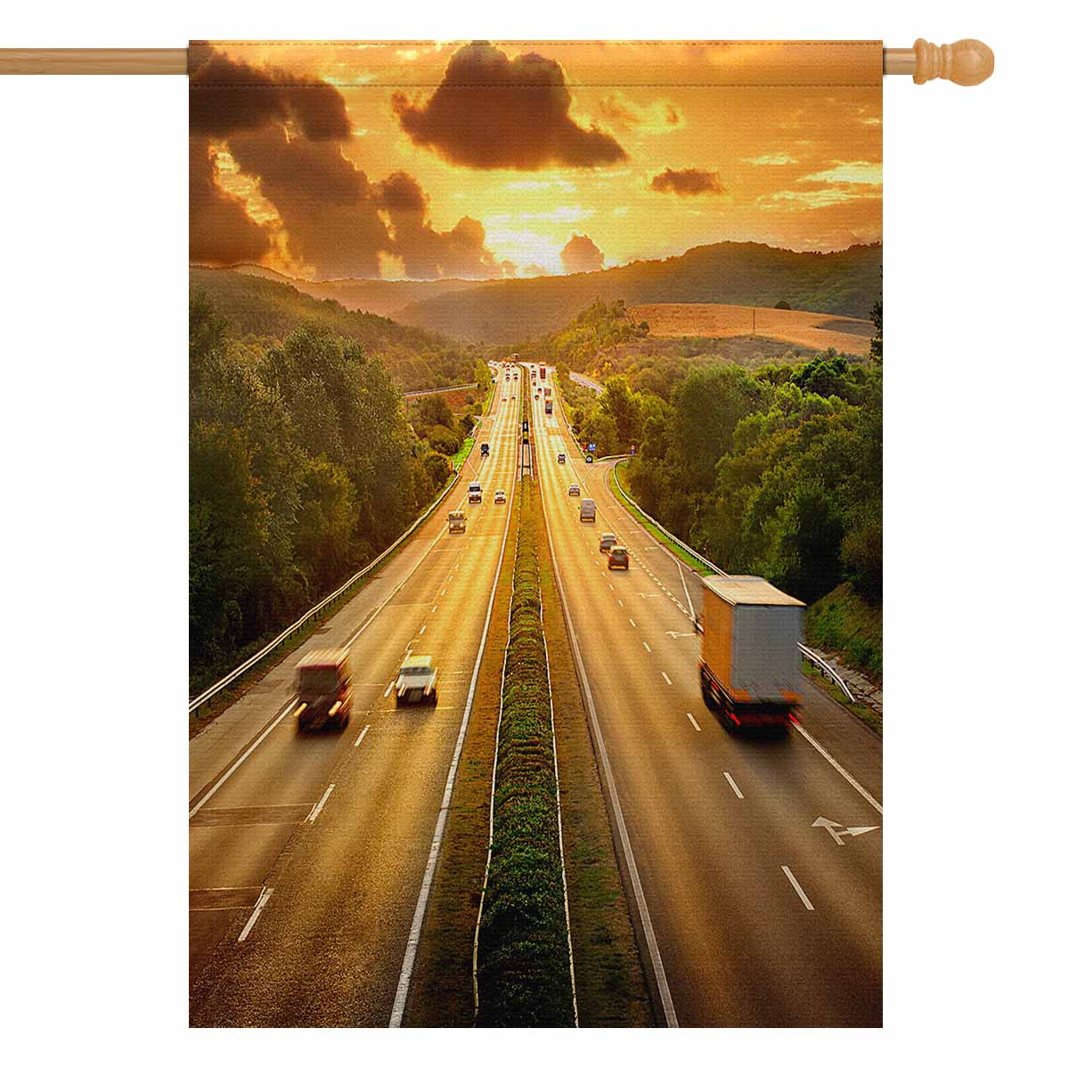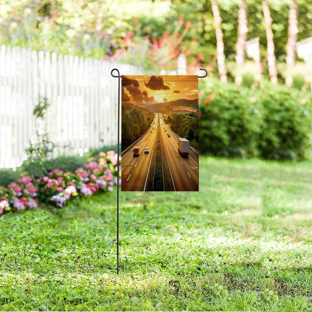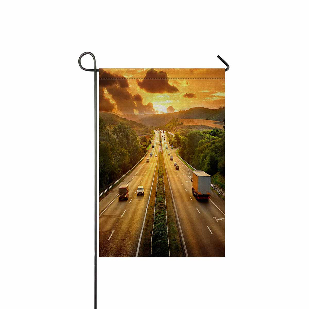 Garden Flags printed retro themed with Highway Traffic in Sunset