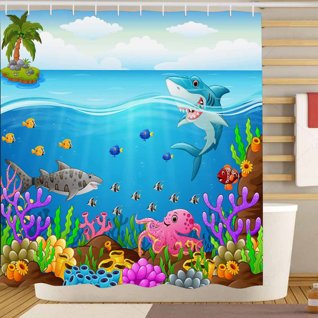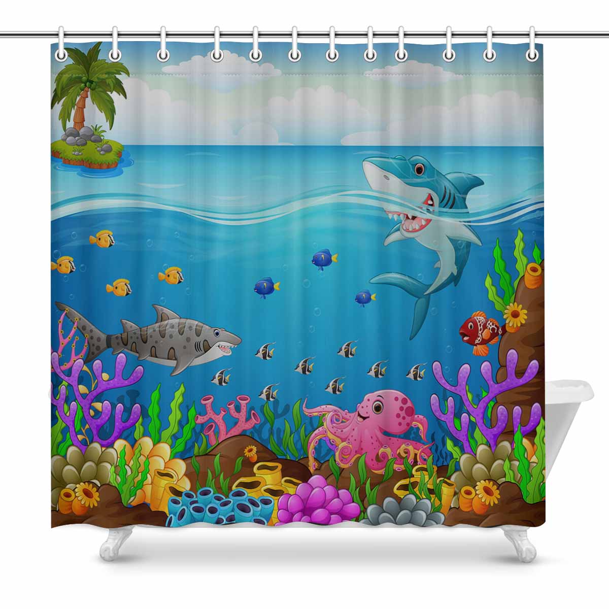 Seaworld Shower Curtains print themed with Cartoon shark under the sea
