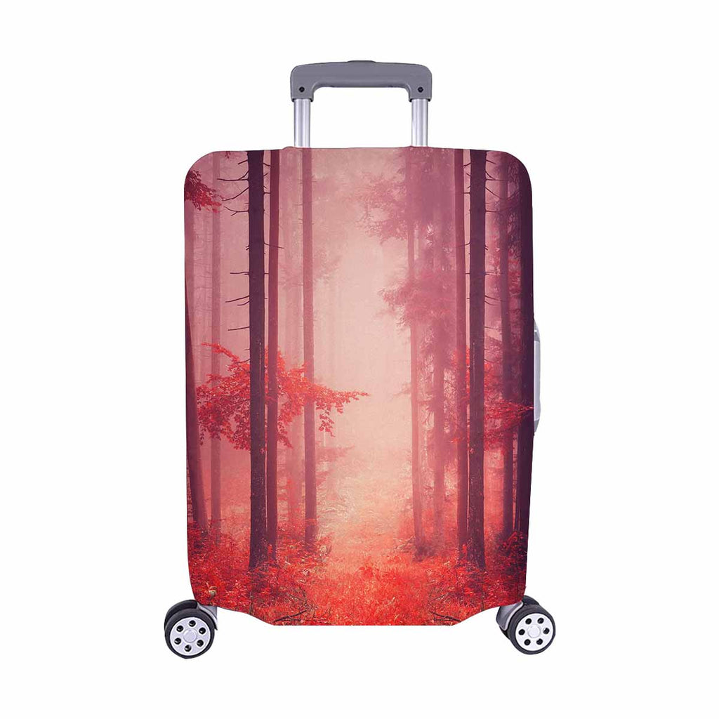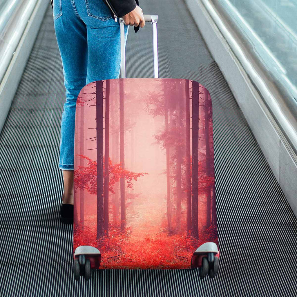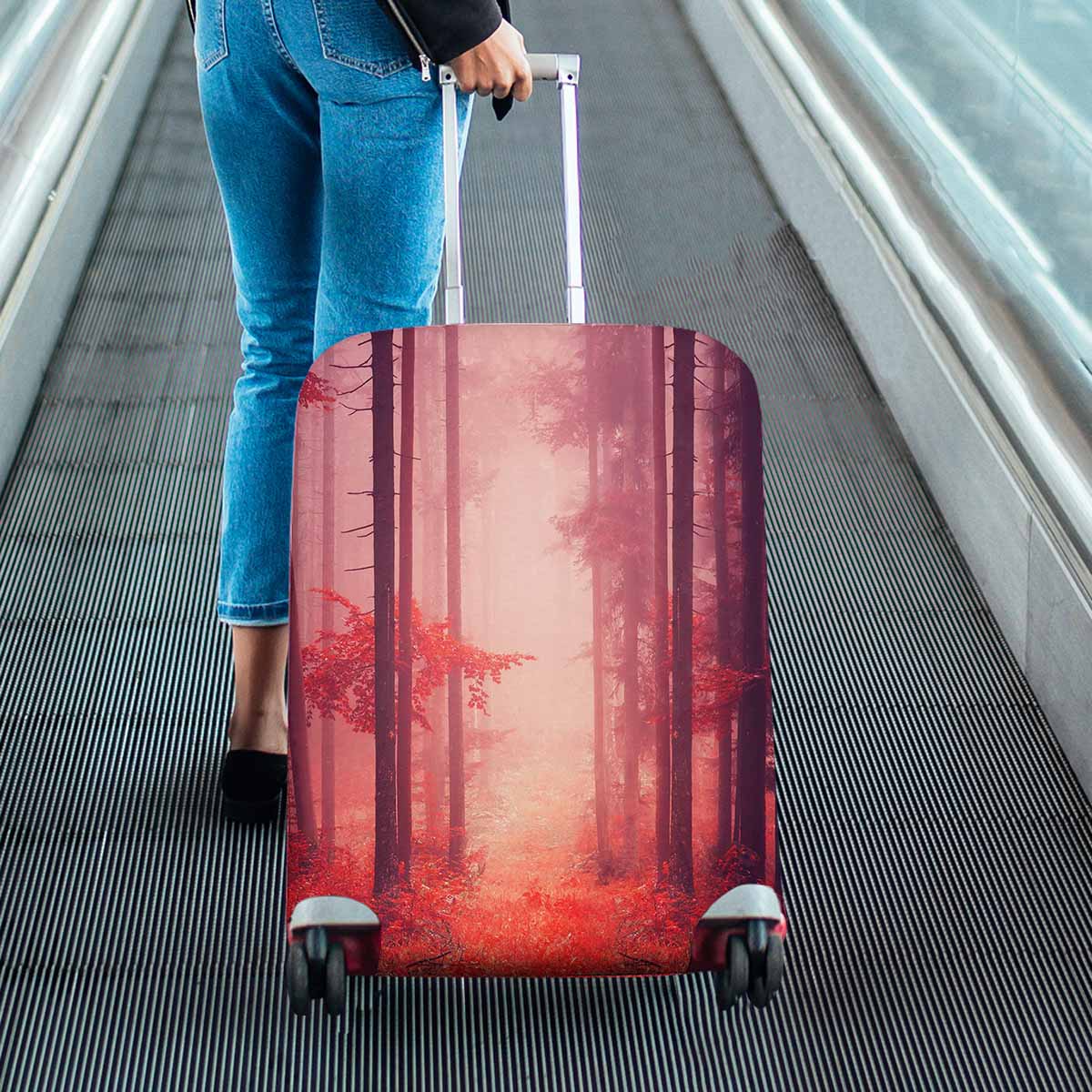 Tree Mountains themed Cover for Luggage suitcase printed Red color saturated foggy fantasy forest scene with path