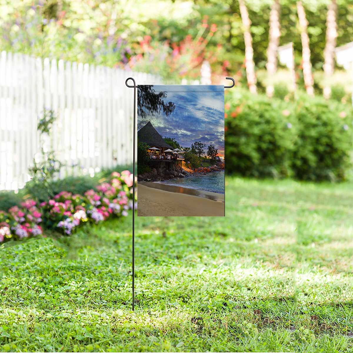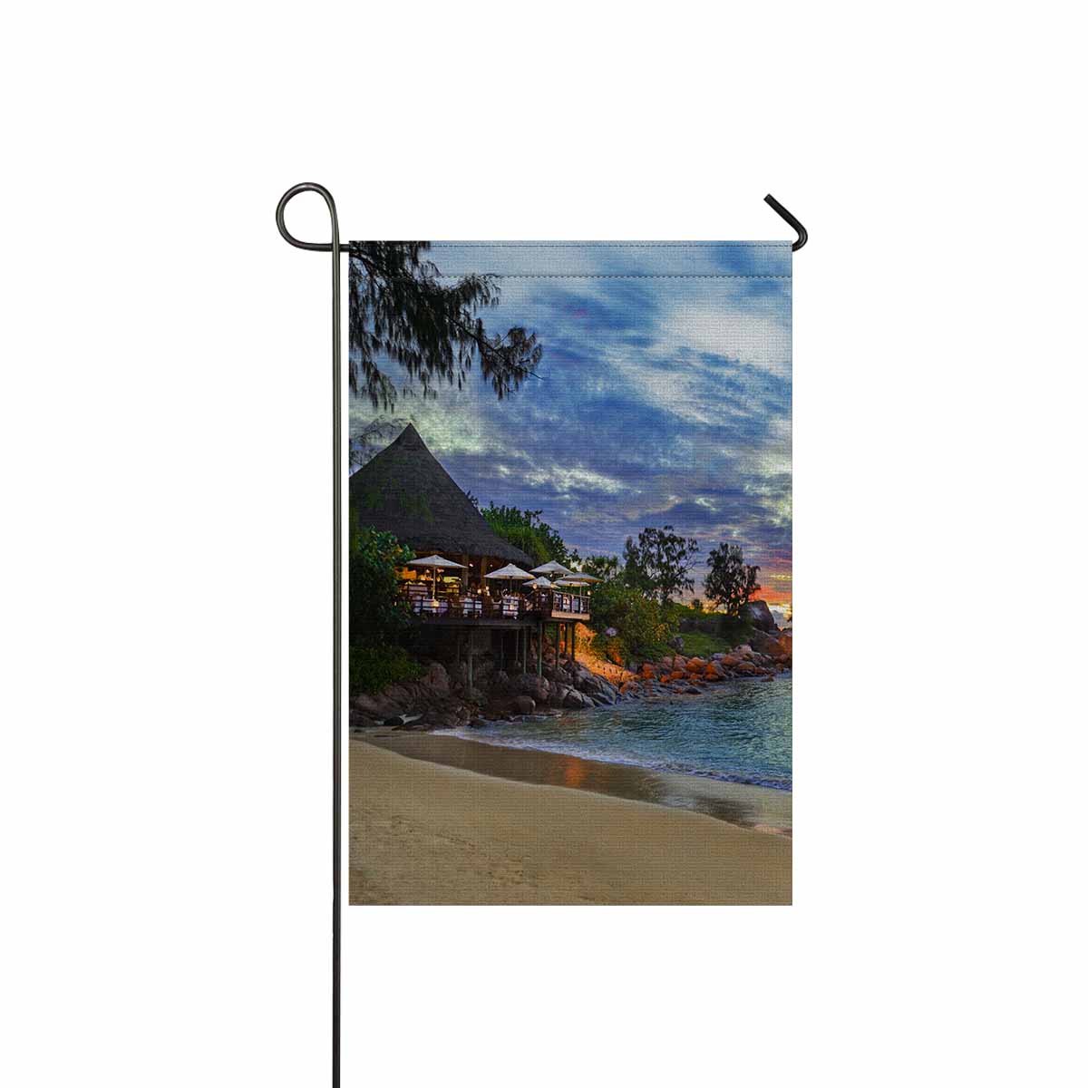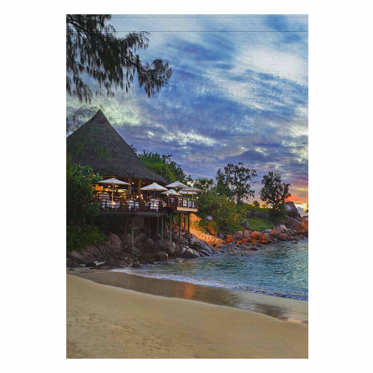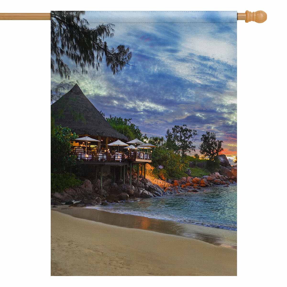 Garden Flags printed tropical themed with Cafe on tropical beach at sunset