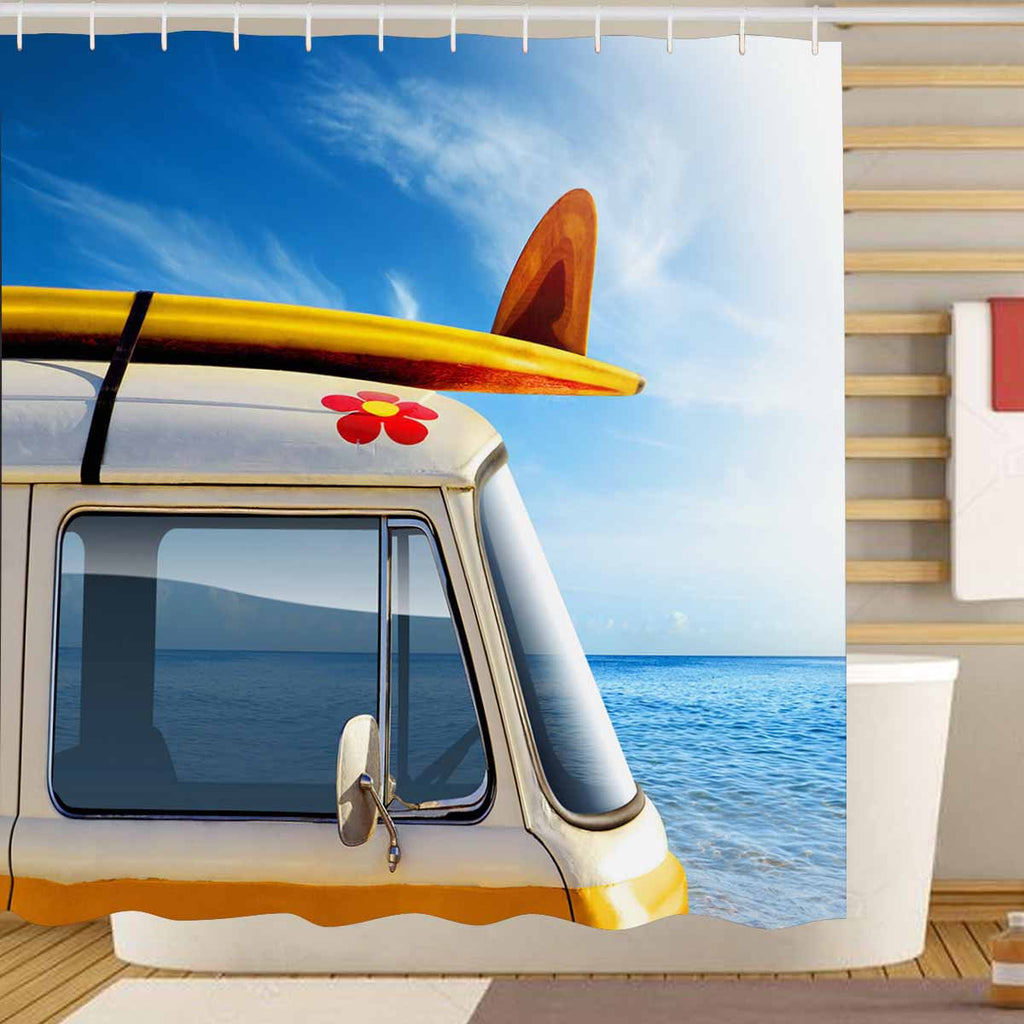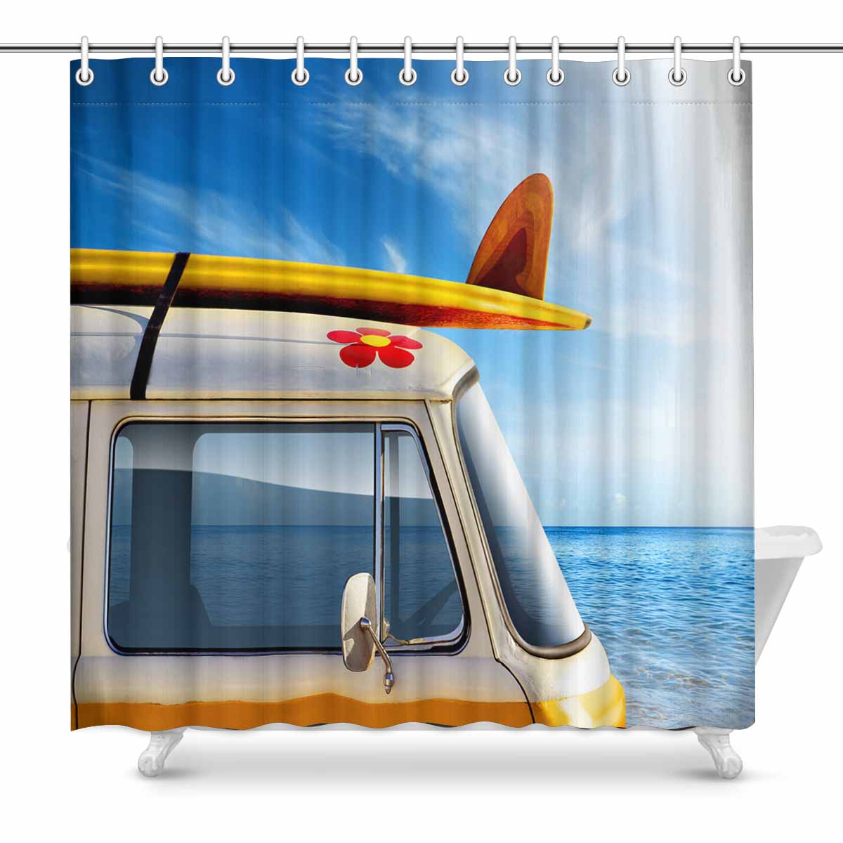 Tropical themed Shower Curtains vintage van in the beach, with a surfboard on the roof
