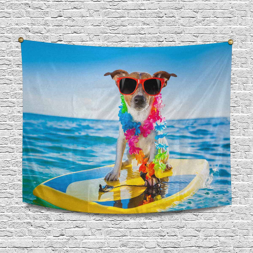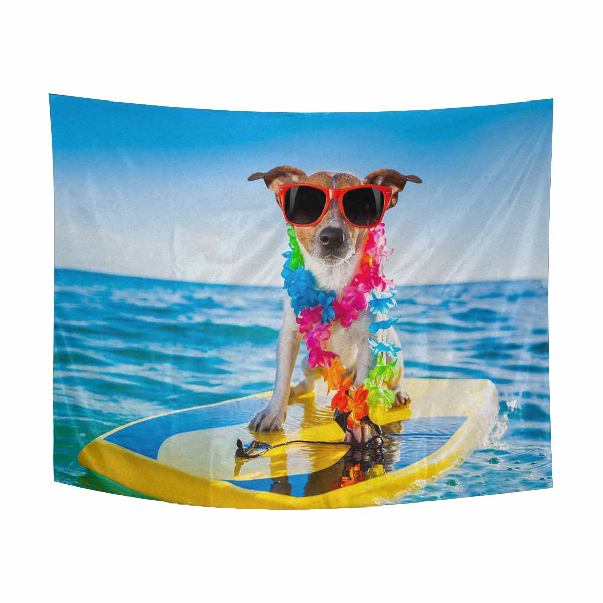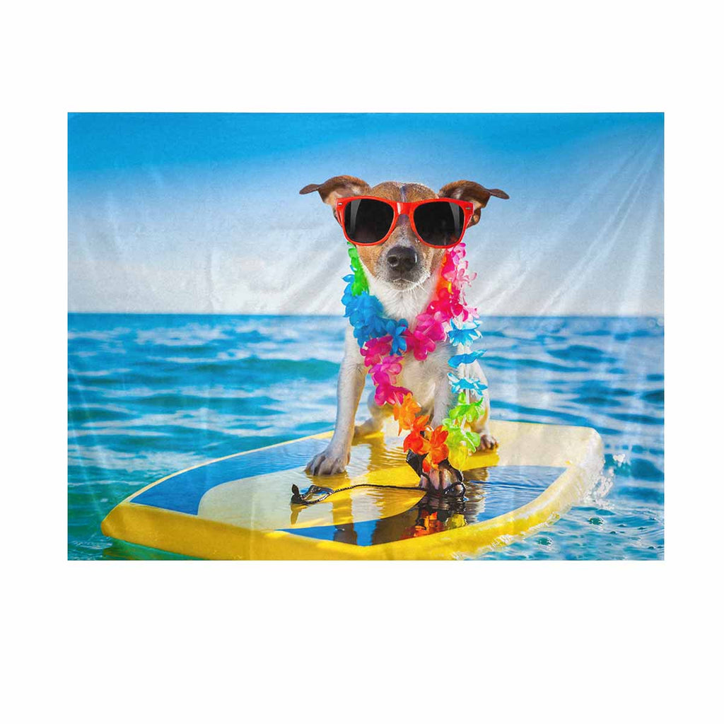 Tropical themed Wall Tapestries printed dog surfing on a surfboard wearing a flower chain and sunglasses