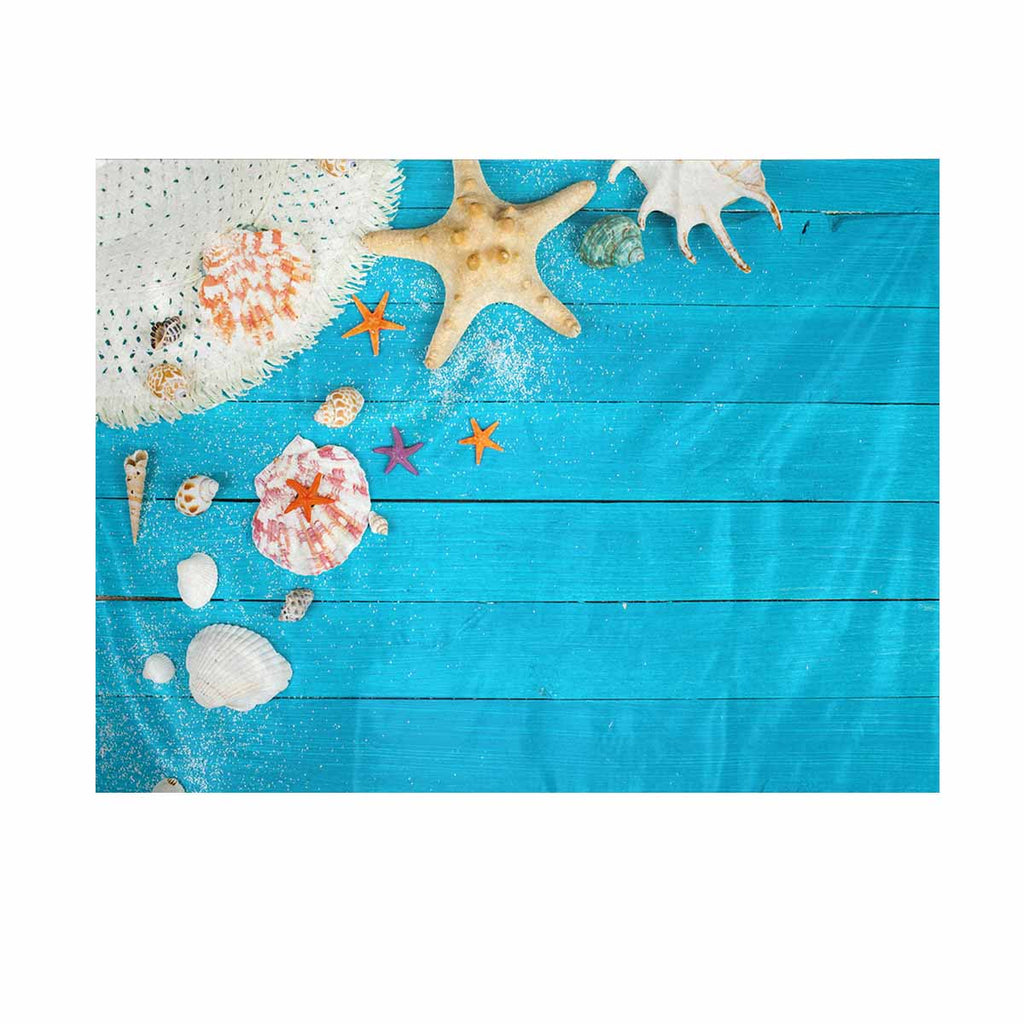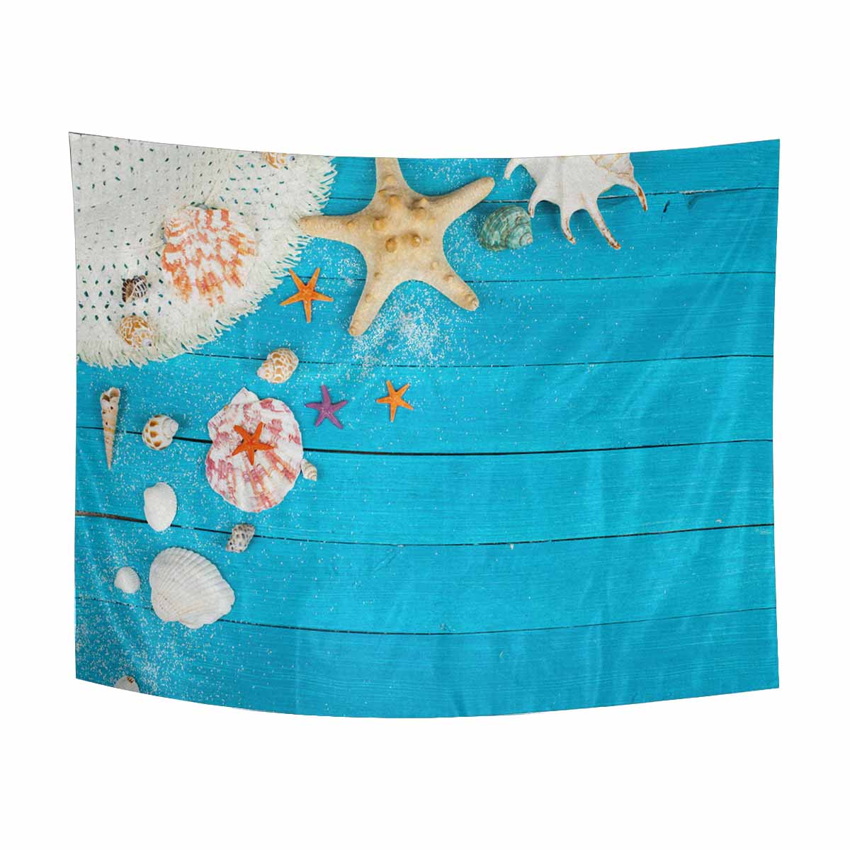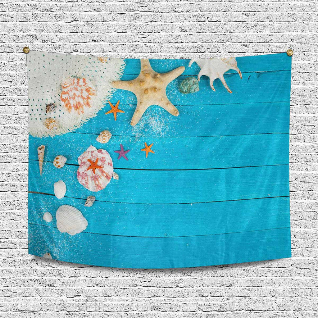 Tropical themed Wall Tapestries printed shells on blue wooden background