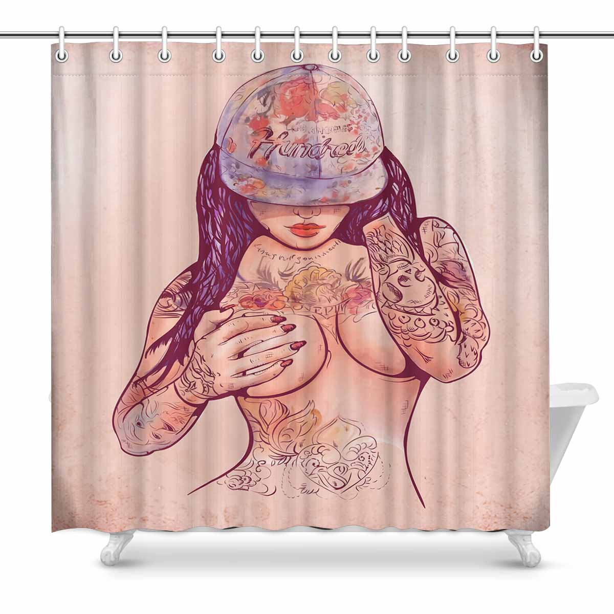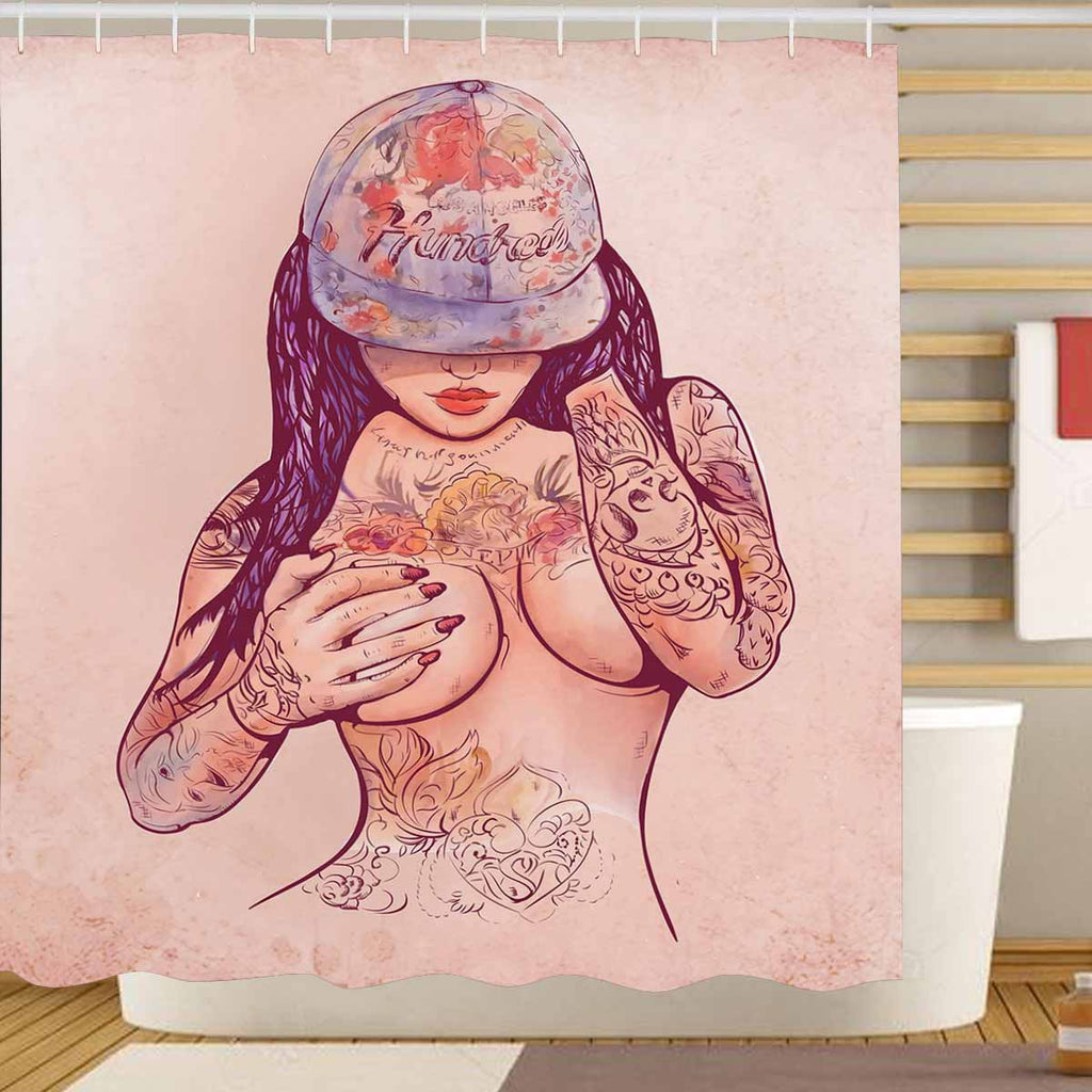 Vintage themed Shower Curtains print with Casual girl in a cap and tattoos