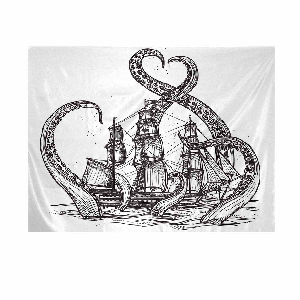 Animals themed Wall Tapestries print with Giant octopus catches old style sail ship vector illustration