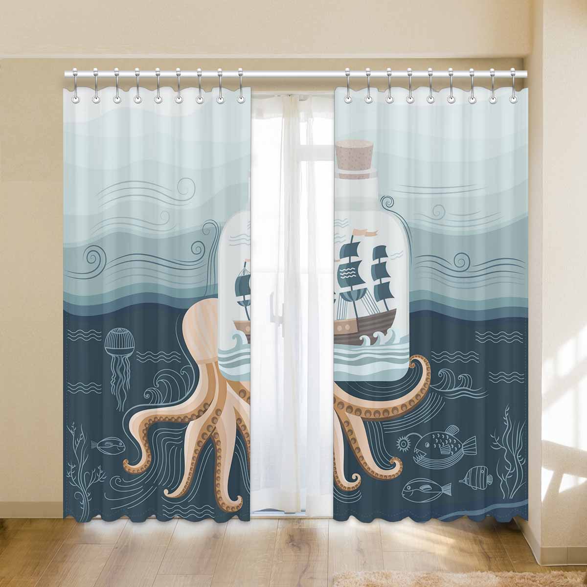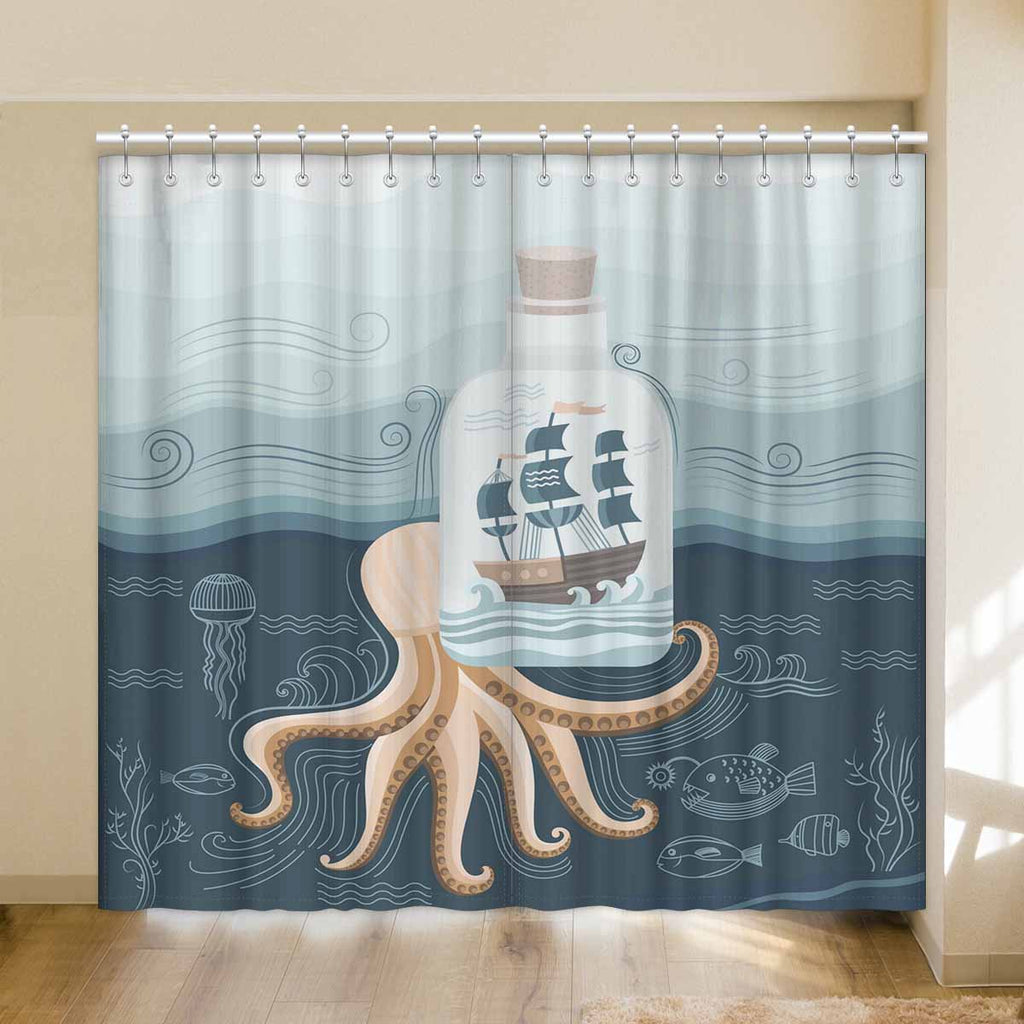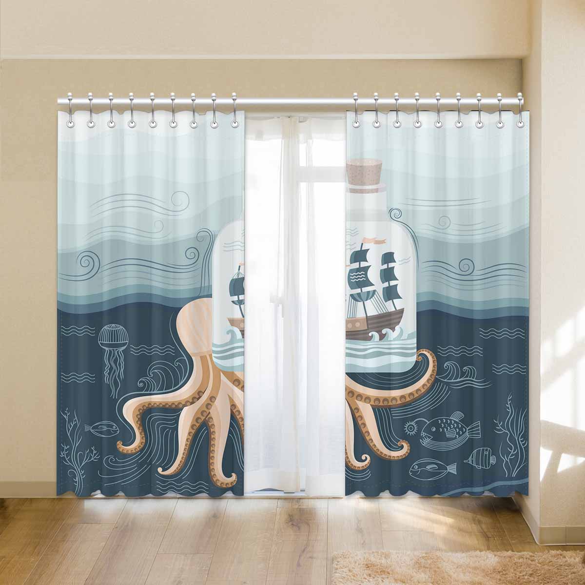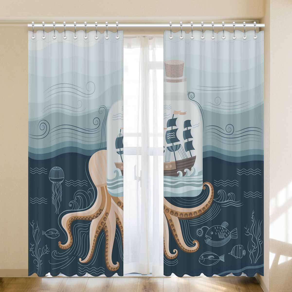 Seaworld Window Curtains print octopus and Ship in Bottle