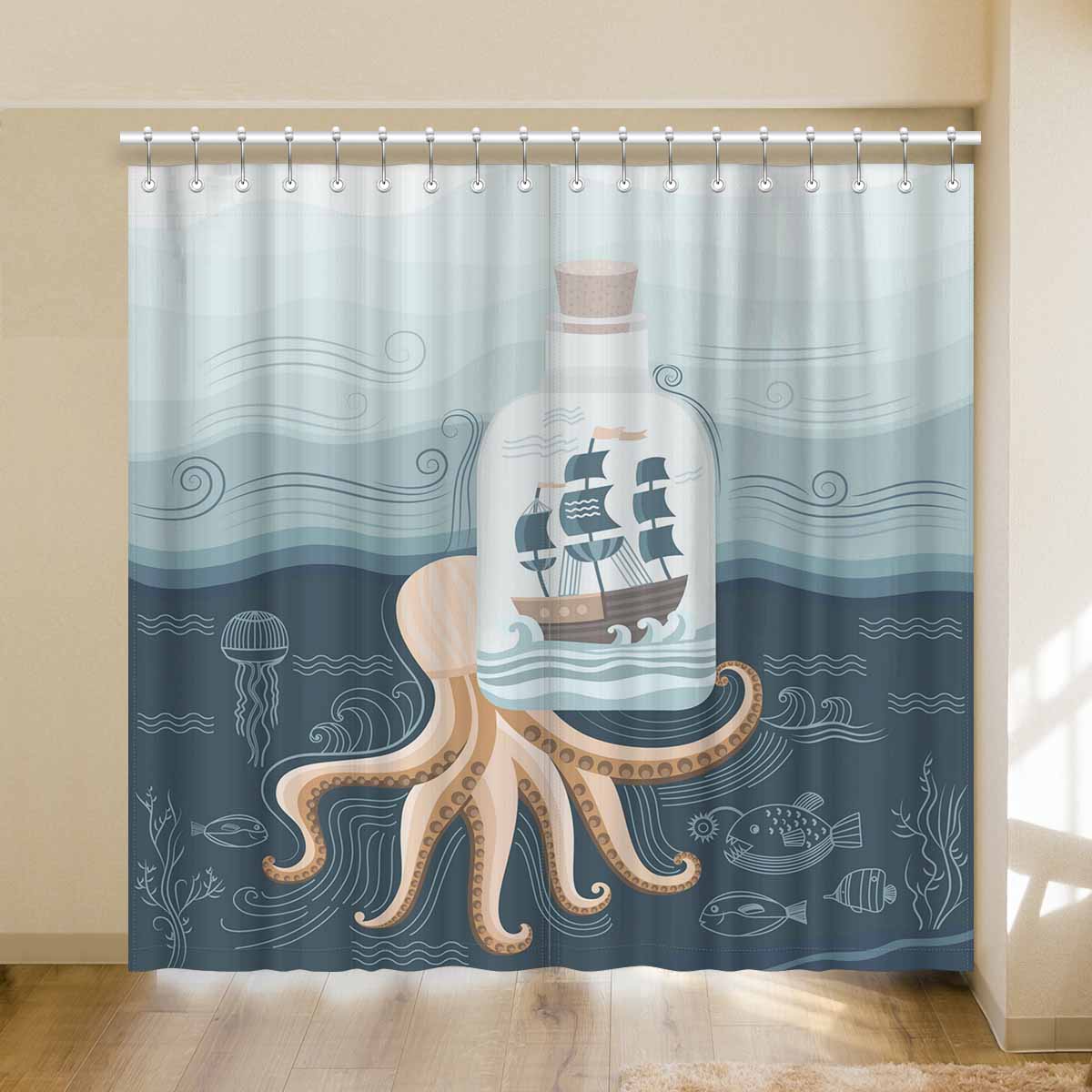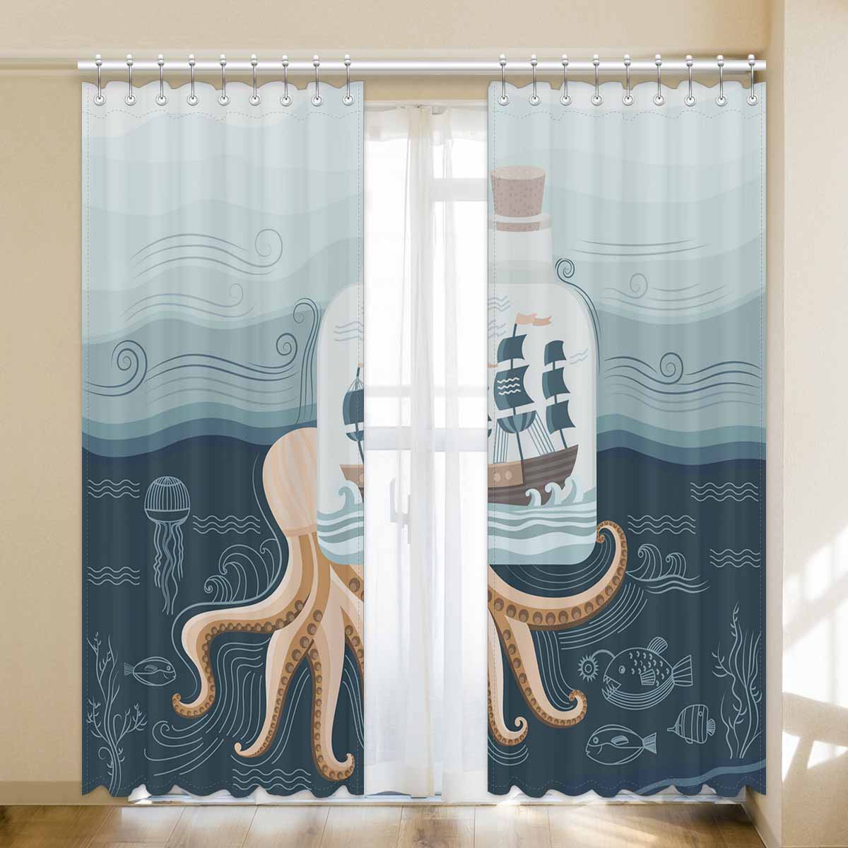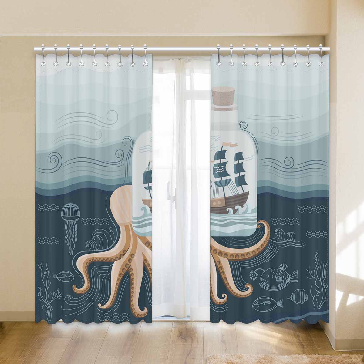 Seaworld Window Curtains print octopus and Ship in Bottle