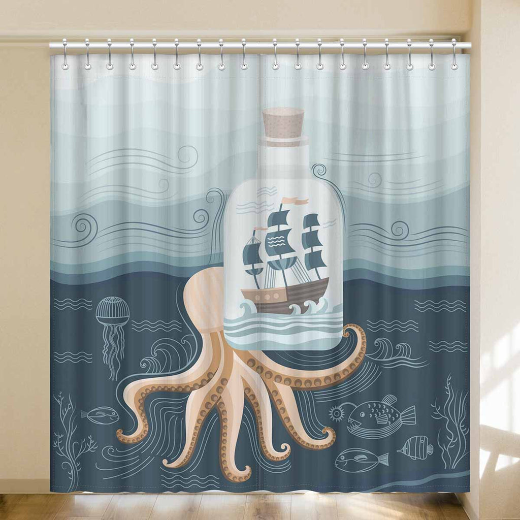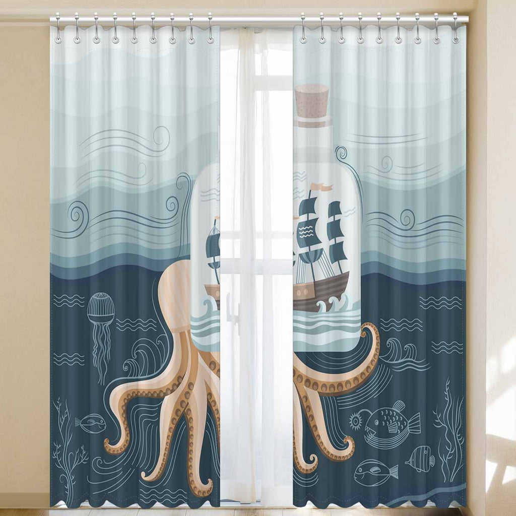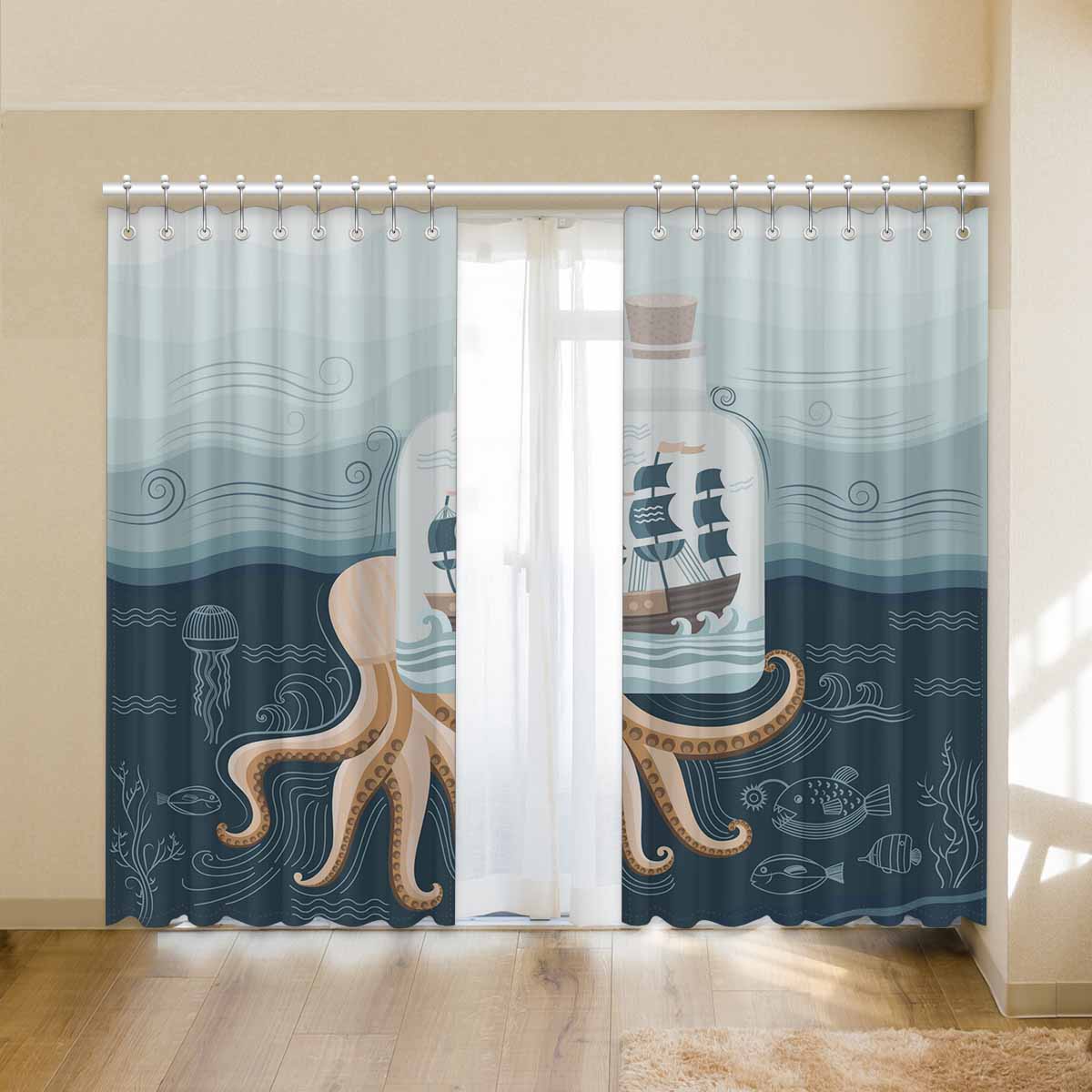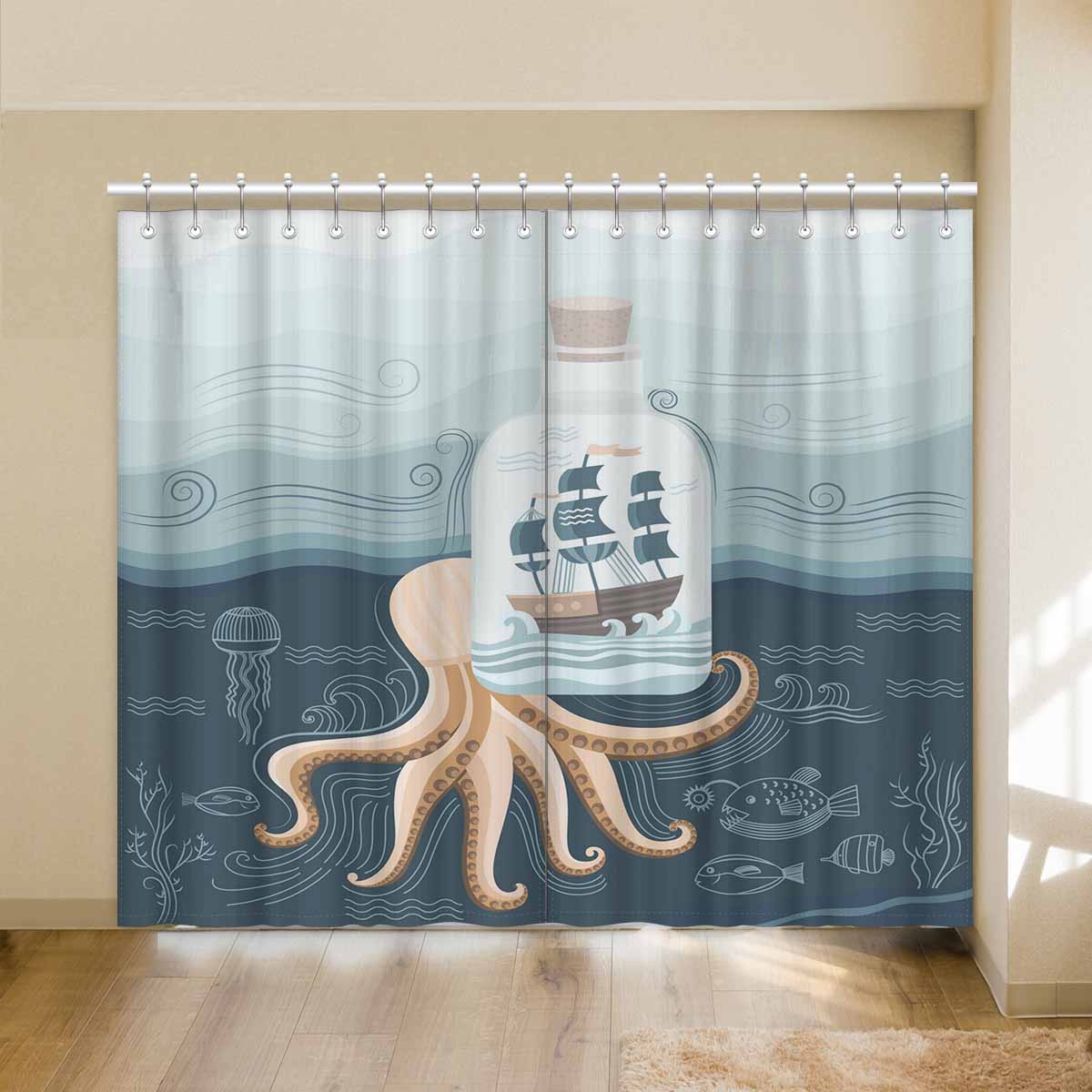 Seaworld Window Curtains print octopus and Ship in Bottle