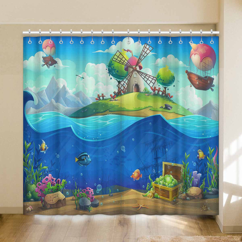 Seaworld Window Curtains print Undersea world with airship on the island