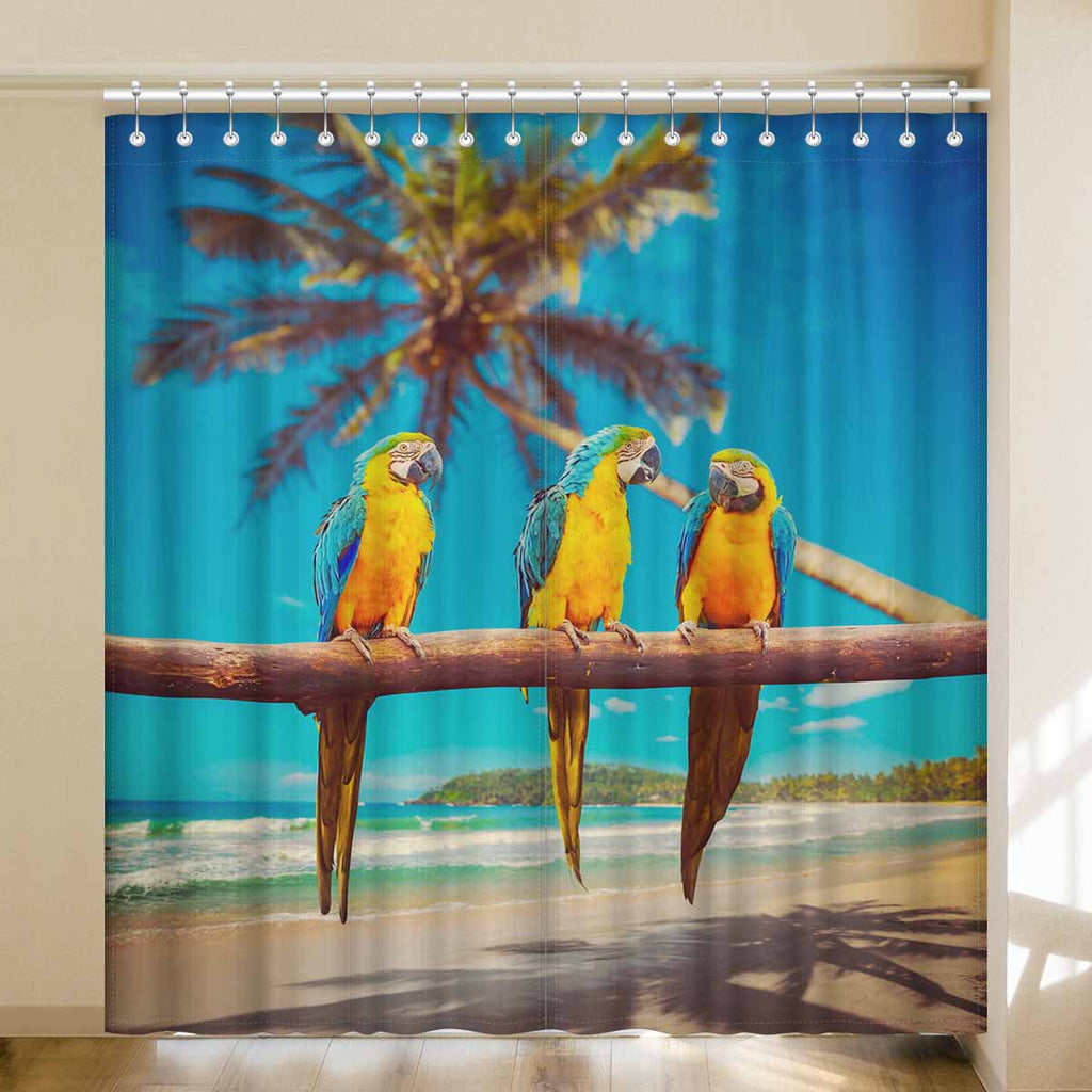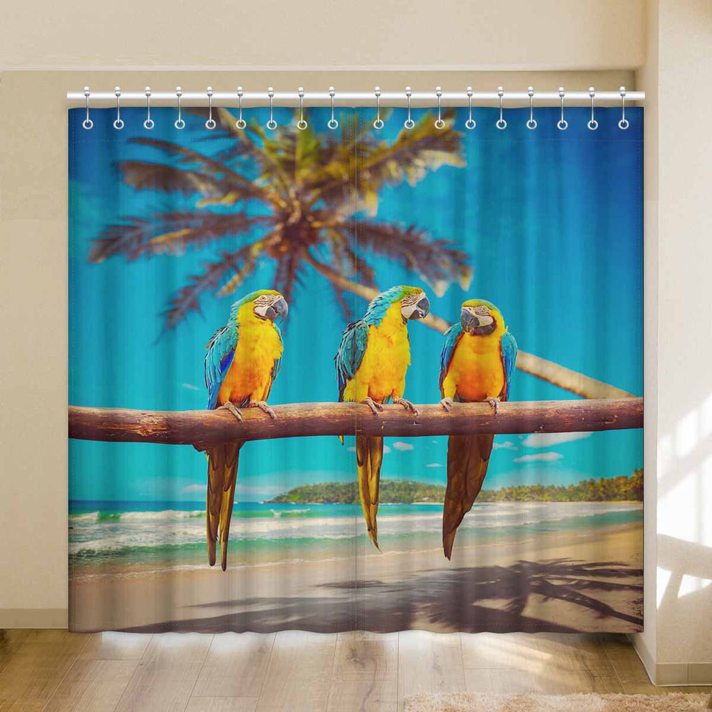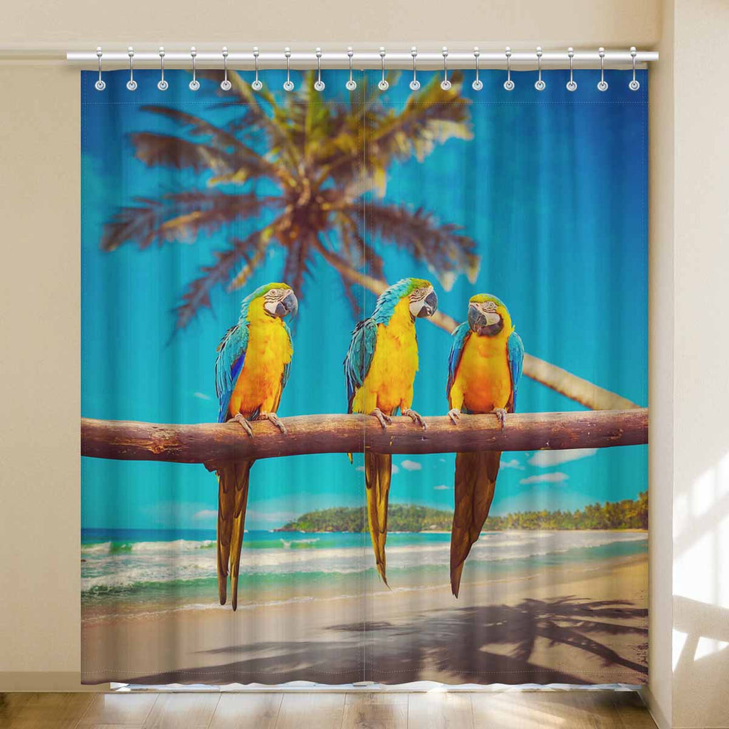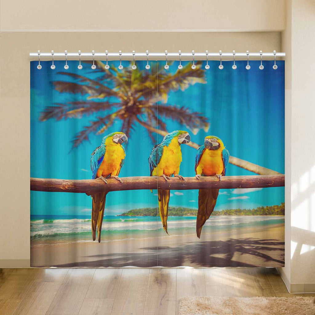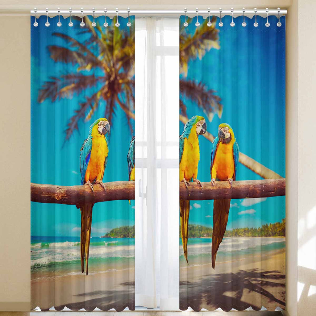 Window Curtains print Blue and Yellow Parrots on beach