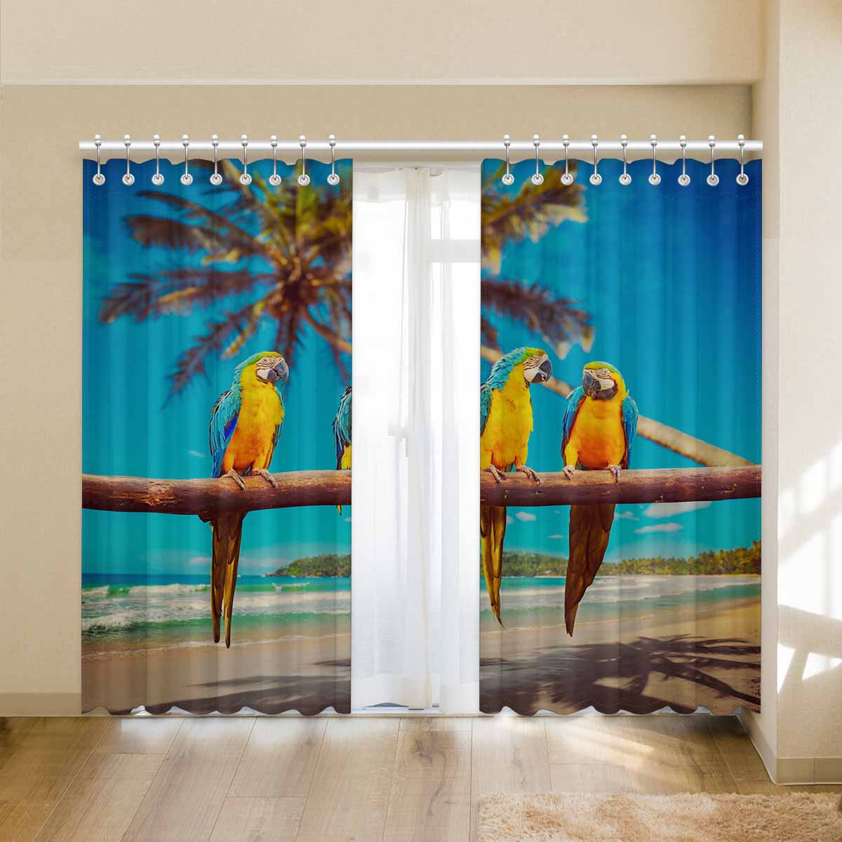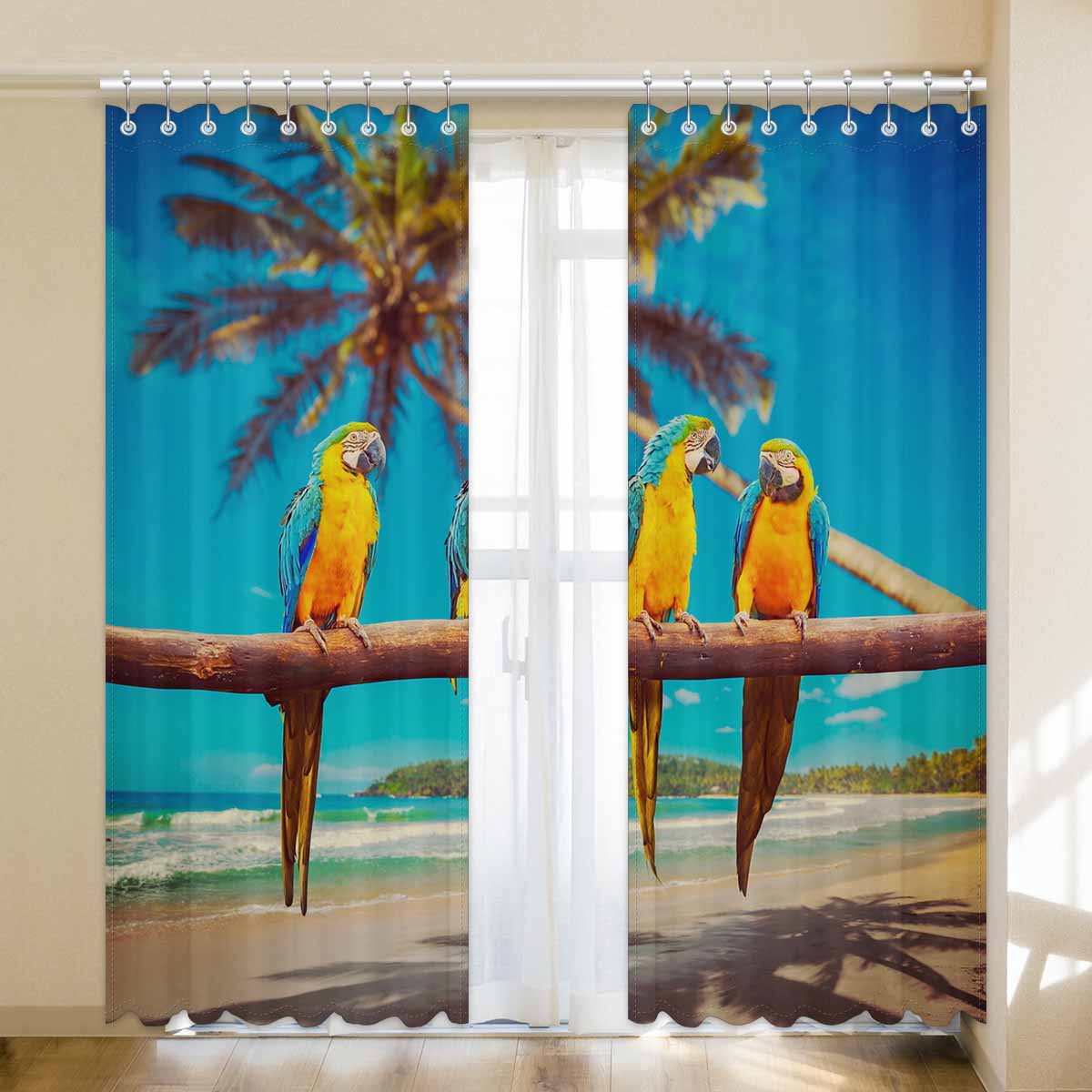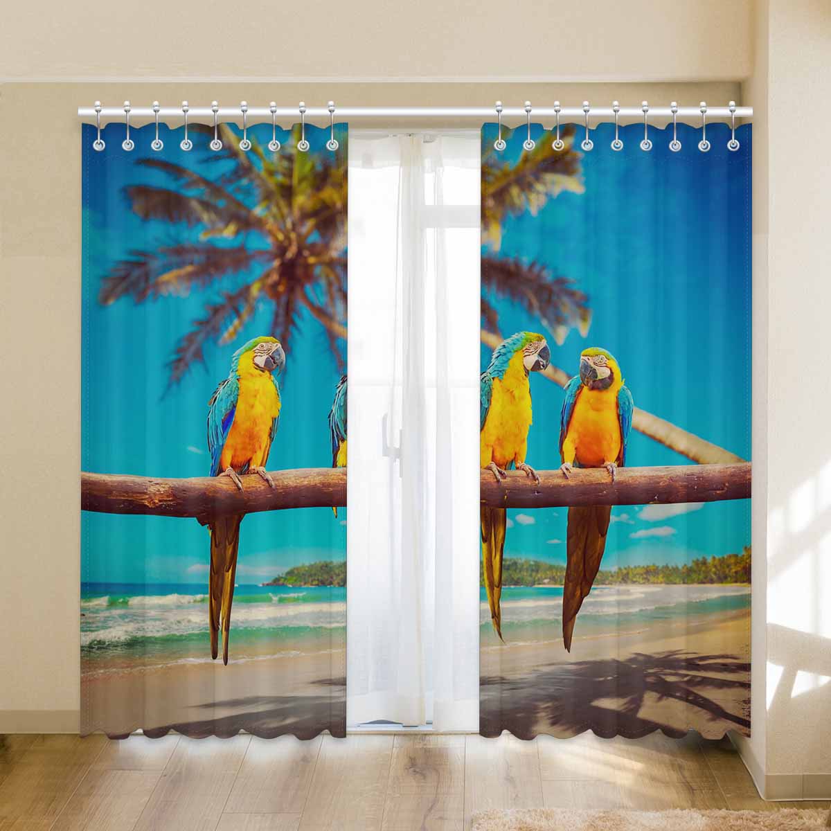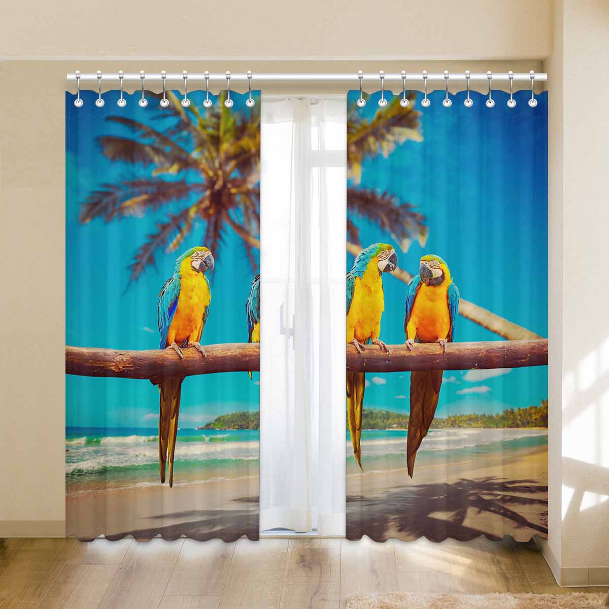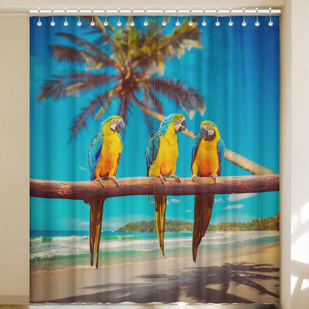 Window Curtains print Blue and Yellow Parrots on beach