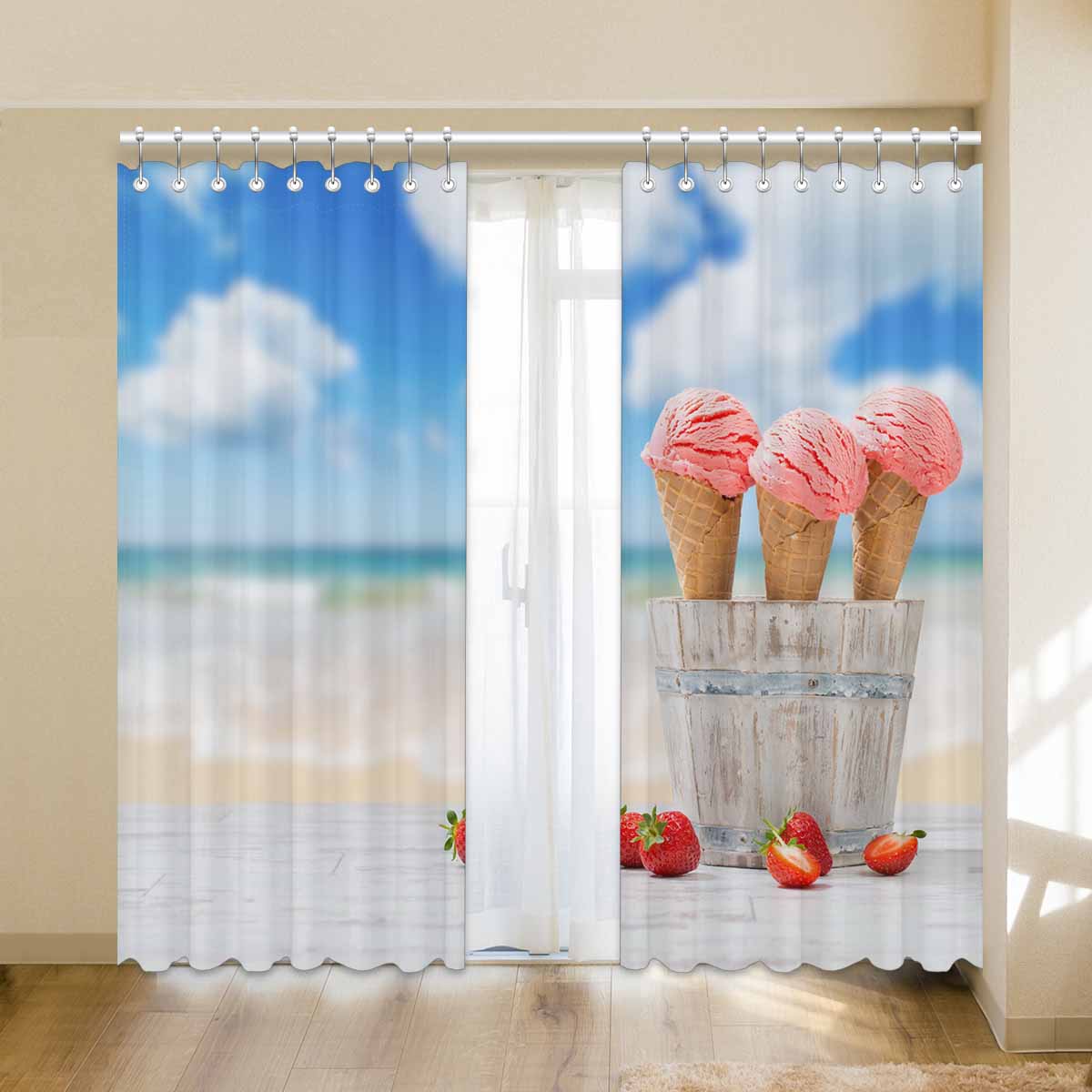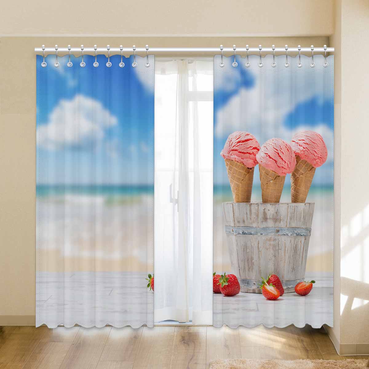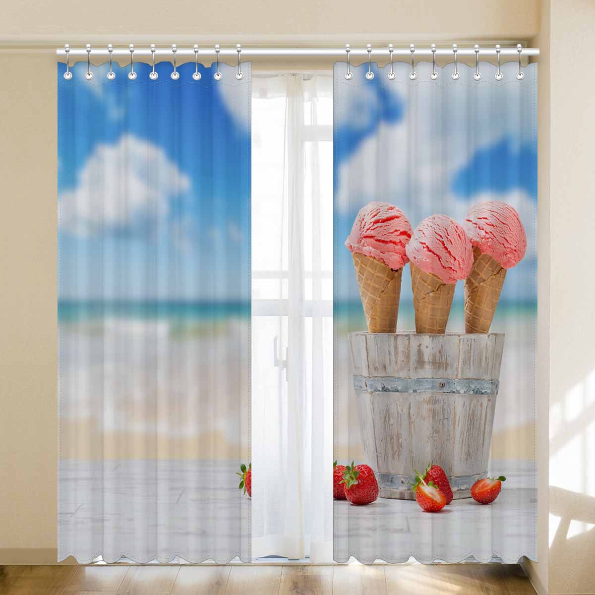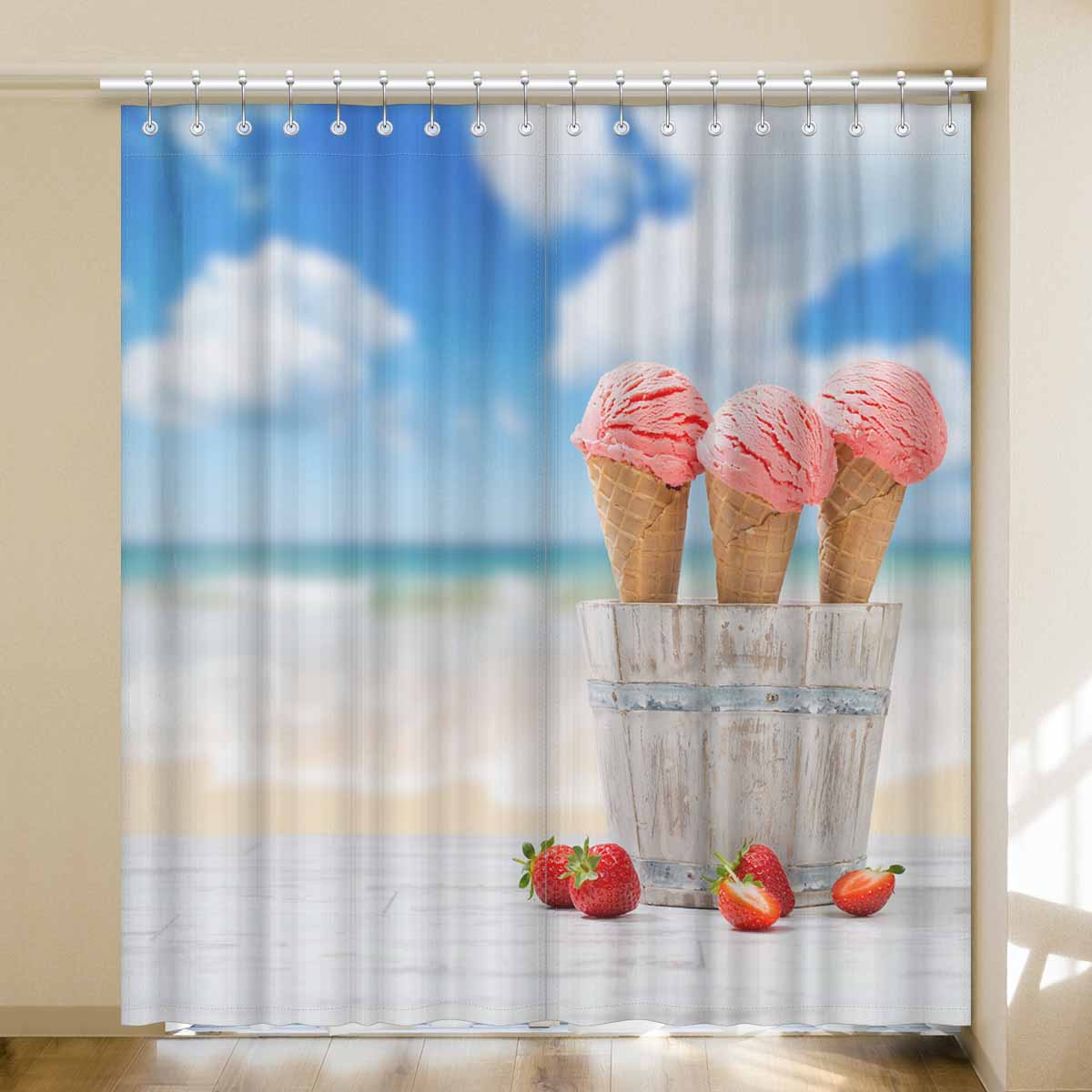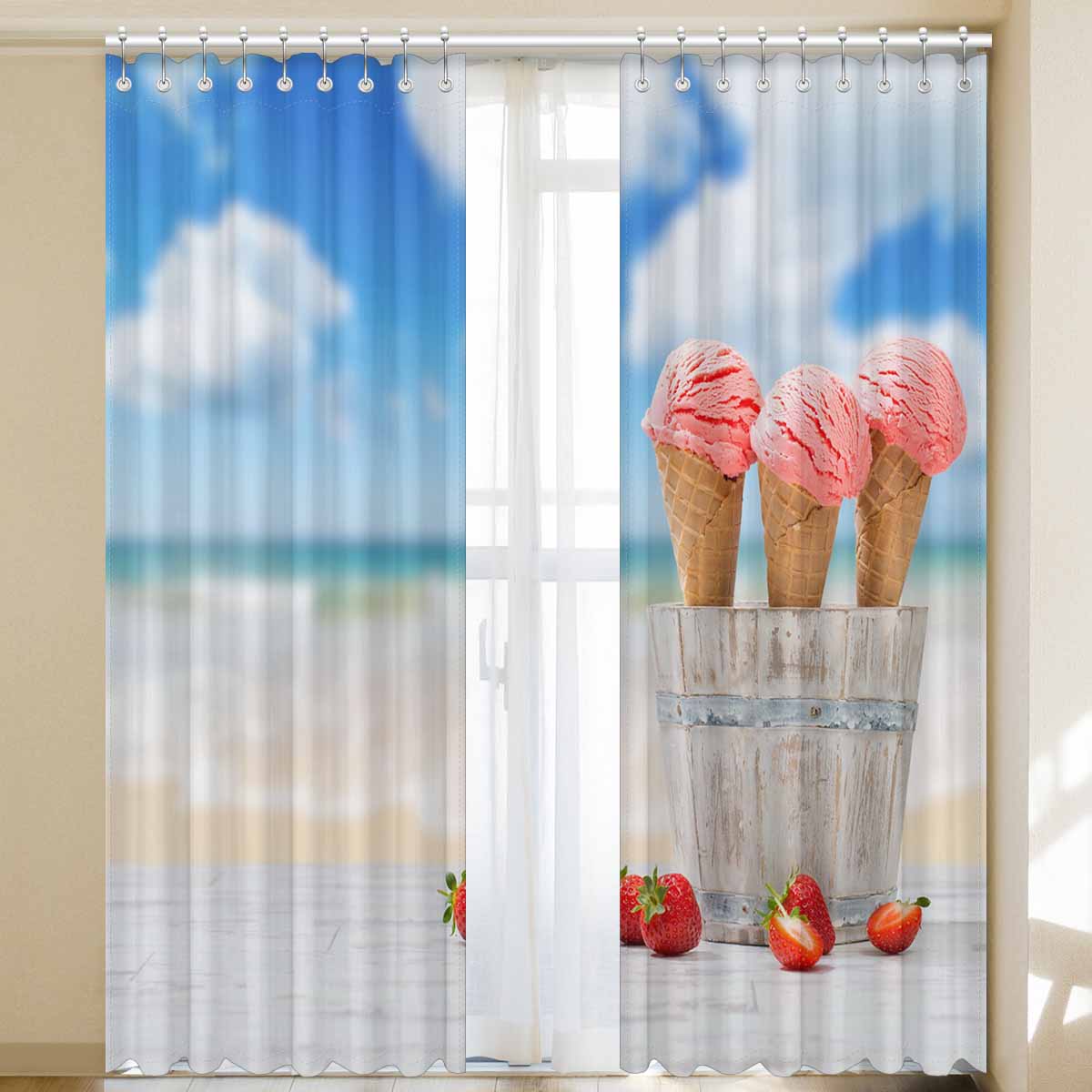 Window Curtains print Strawberry Ice Creams on beach