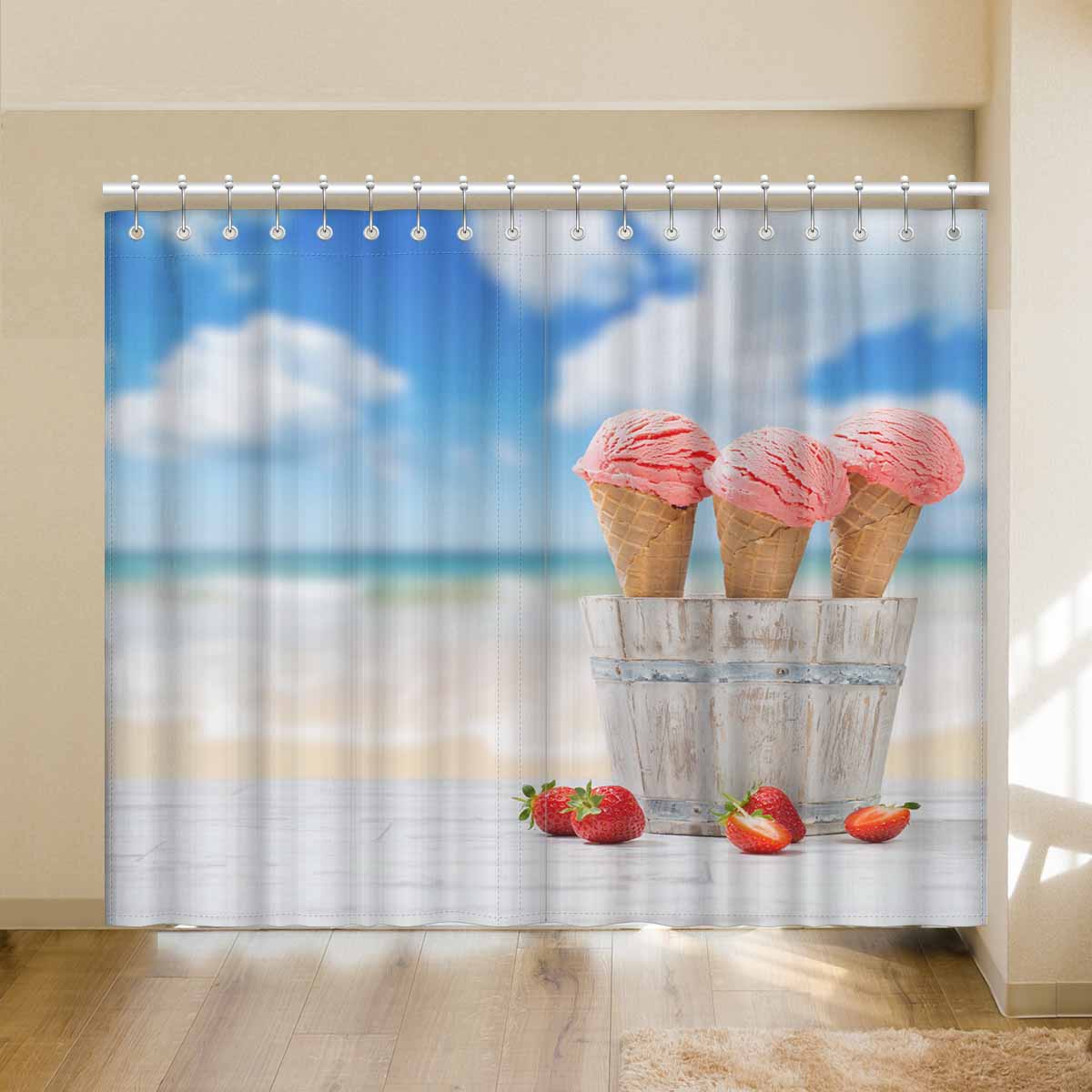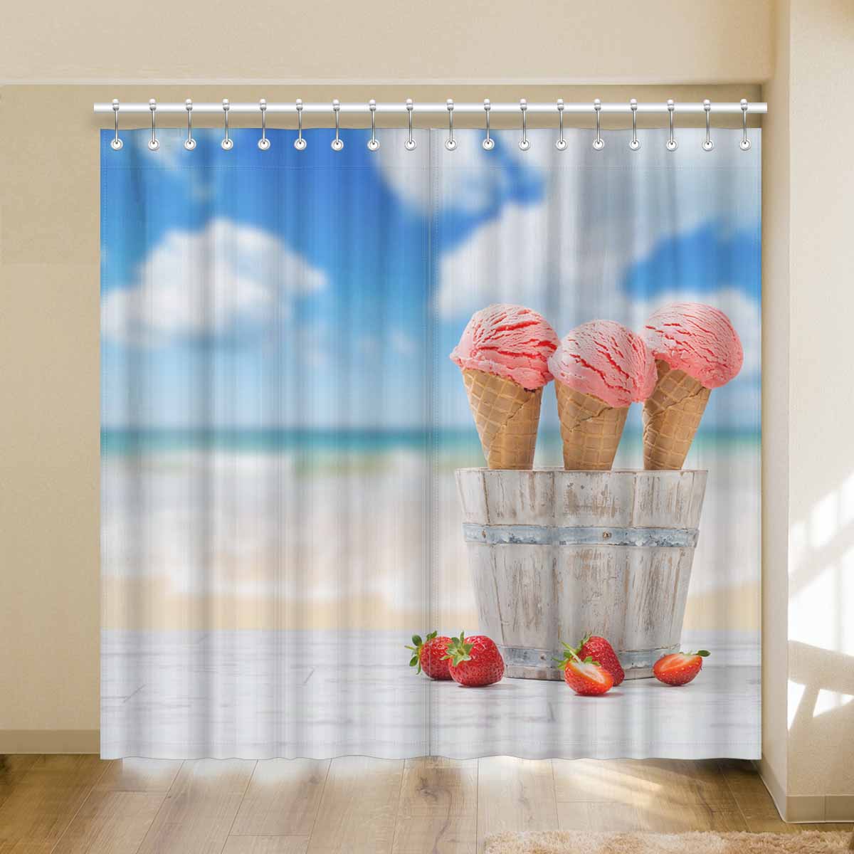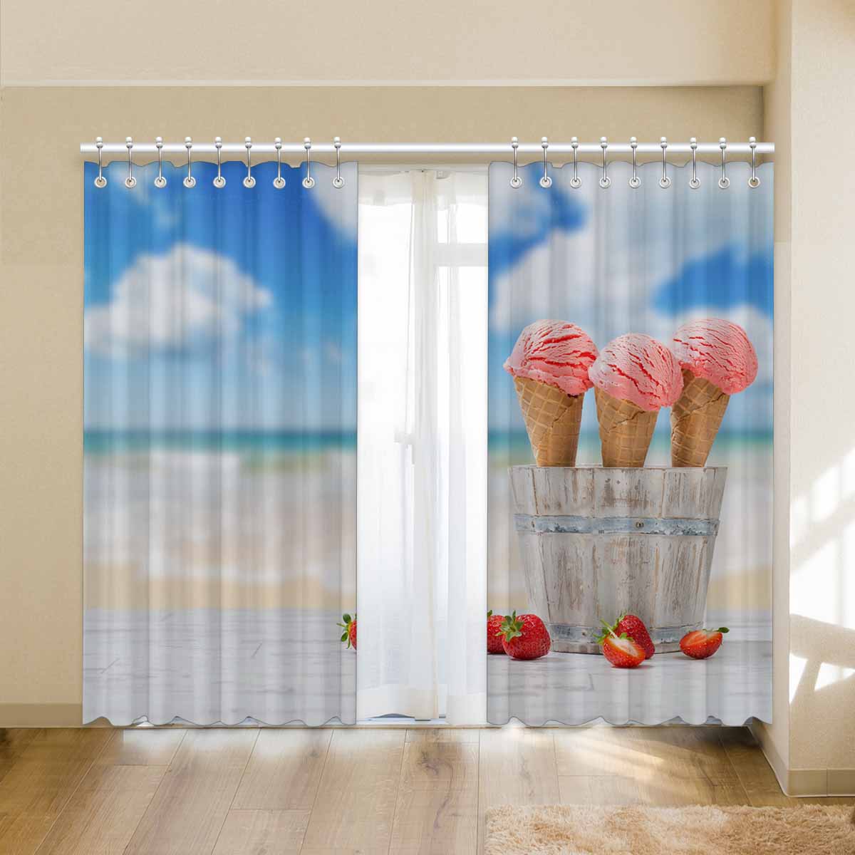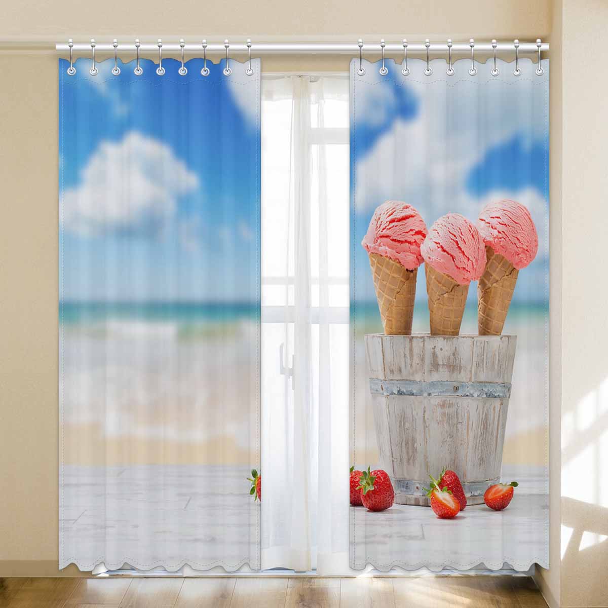 Window Curtains print Strawberry Ice Creams on beach