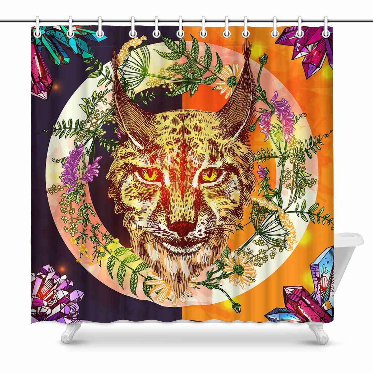Shower Curtains print with Boho style illustration with lynx wildflowers and crystal