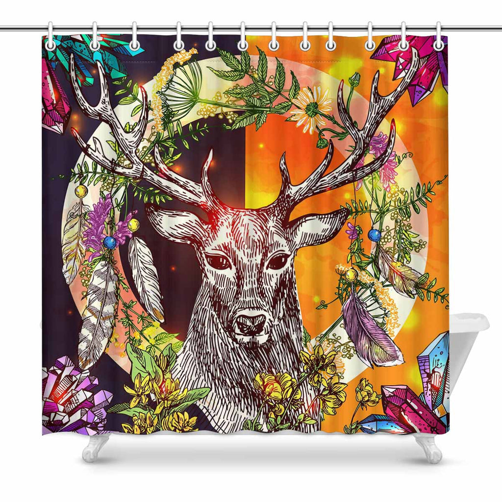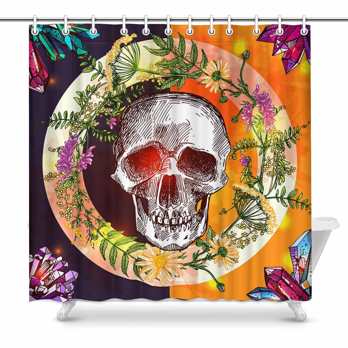 Shower Curtains print with Boho style illustration with skull wildflowers and crystal