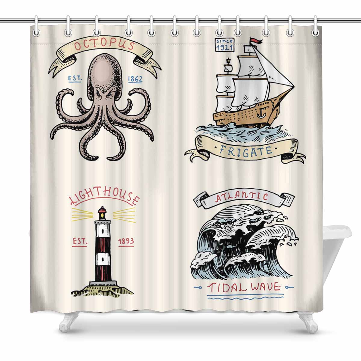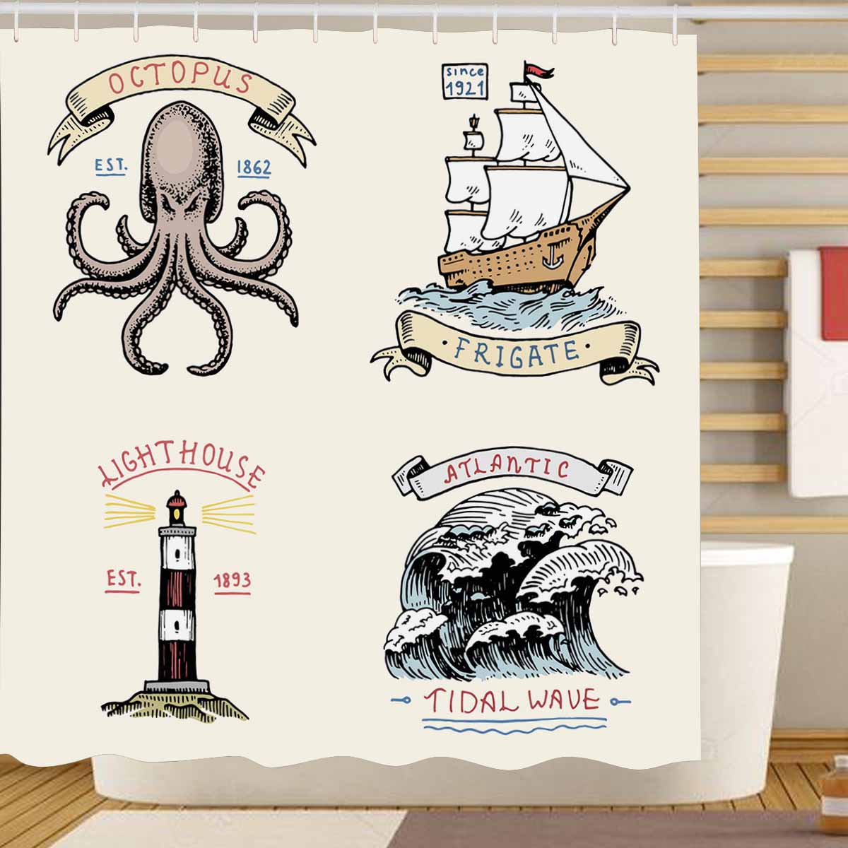 Shower Curtains print with hand drawn of atlantic tidal wave lighthouse octopus and sea creature frigate