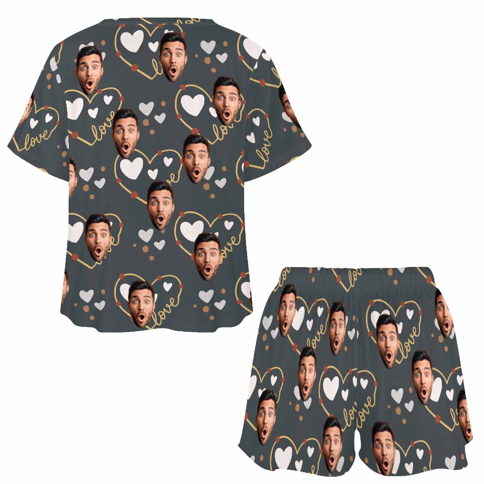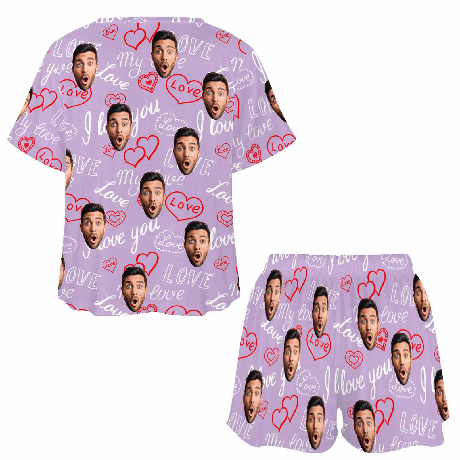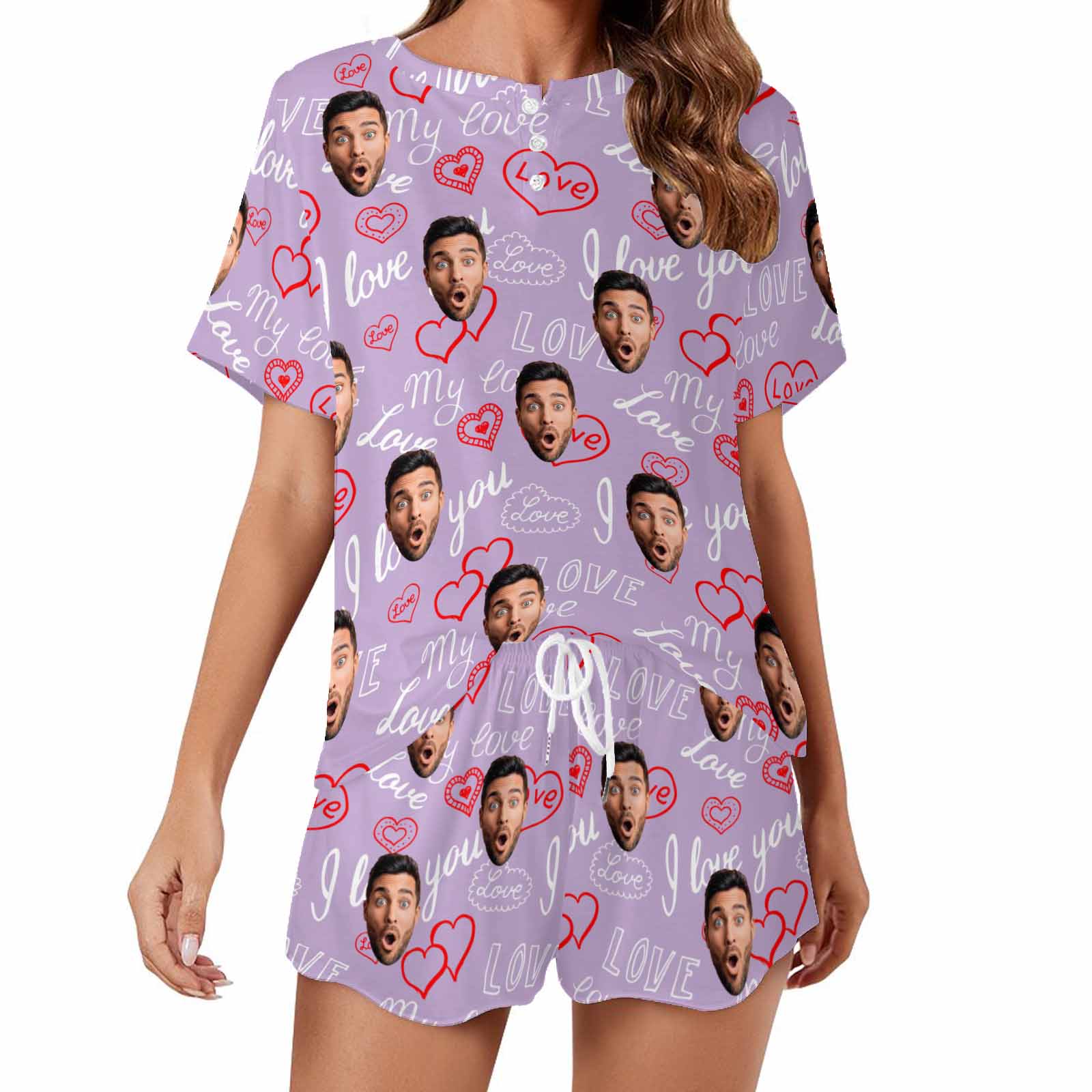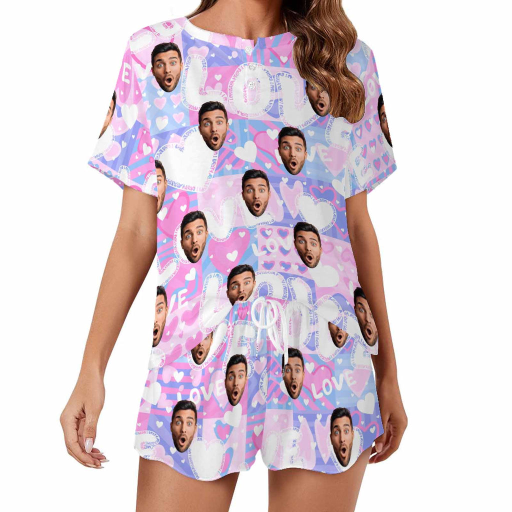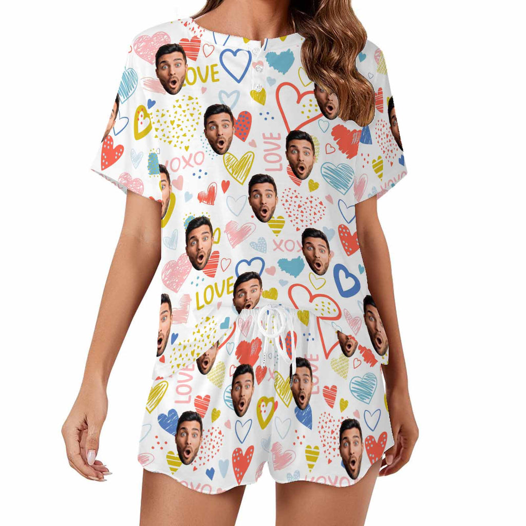 Custom Valentine Womens Short Pajama Set With Face Personalized Photo round neck Short Nightwear for GF Wife Gift