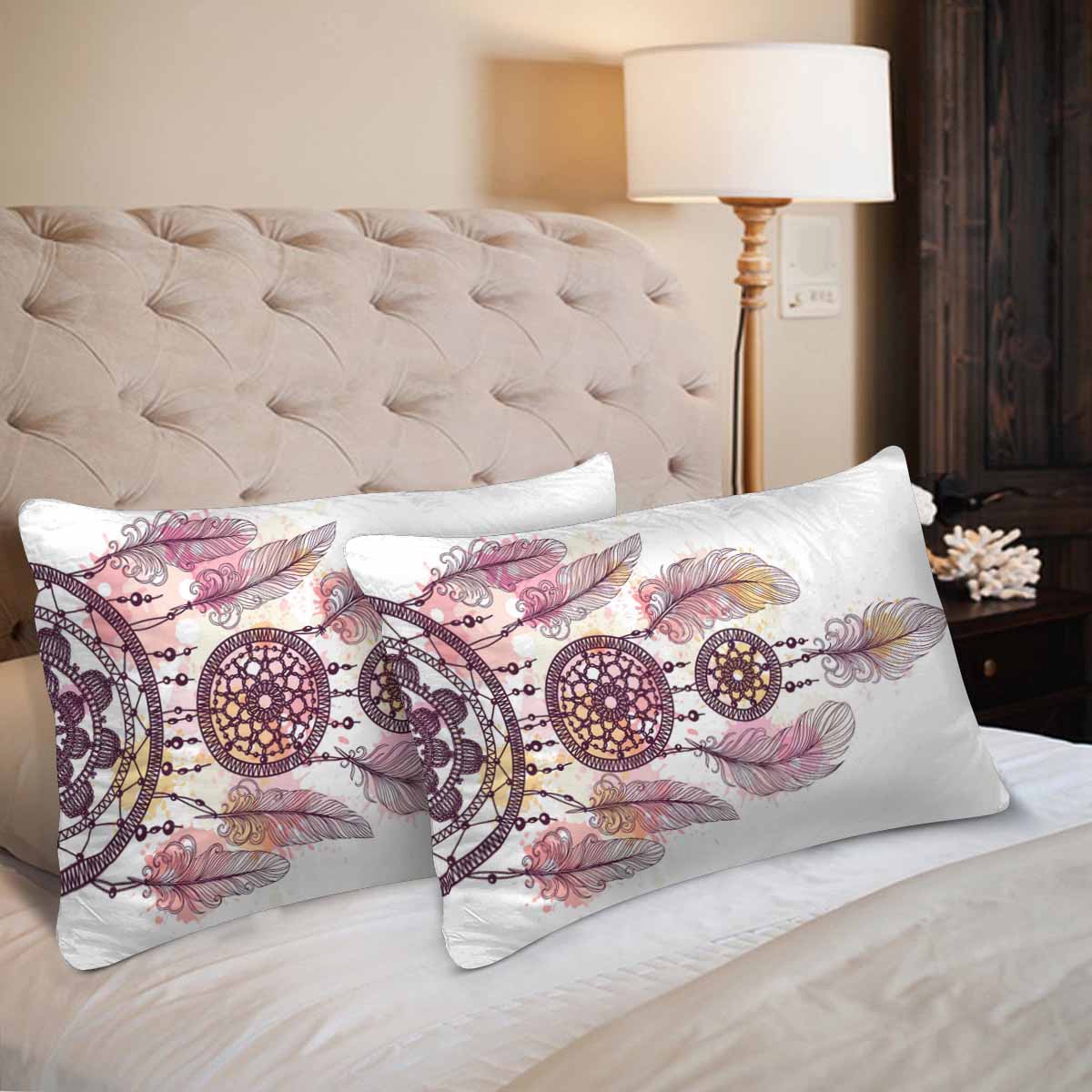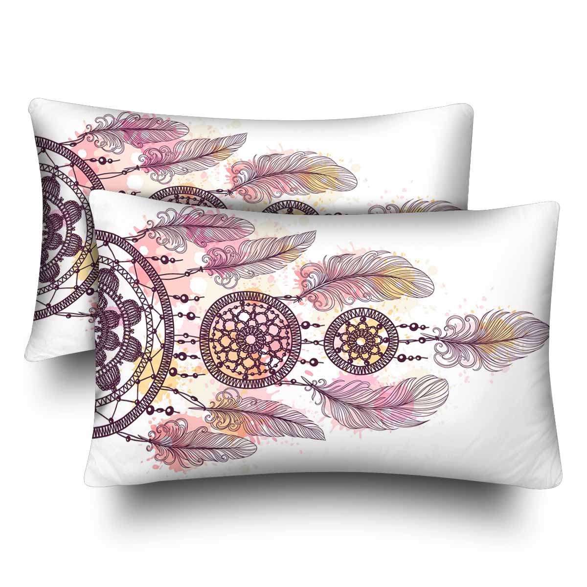 Ethnic themed Rectangle Pillow Cases printed hand drawn dream catcher with feathers and beads