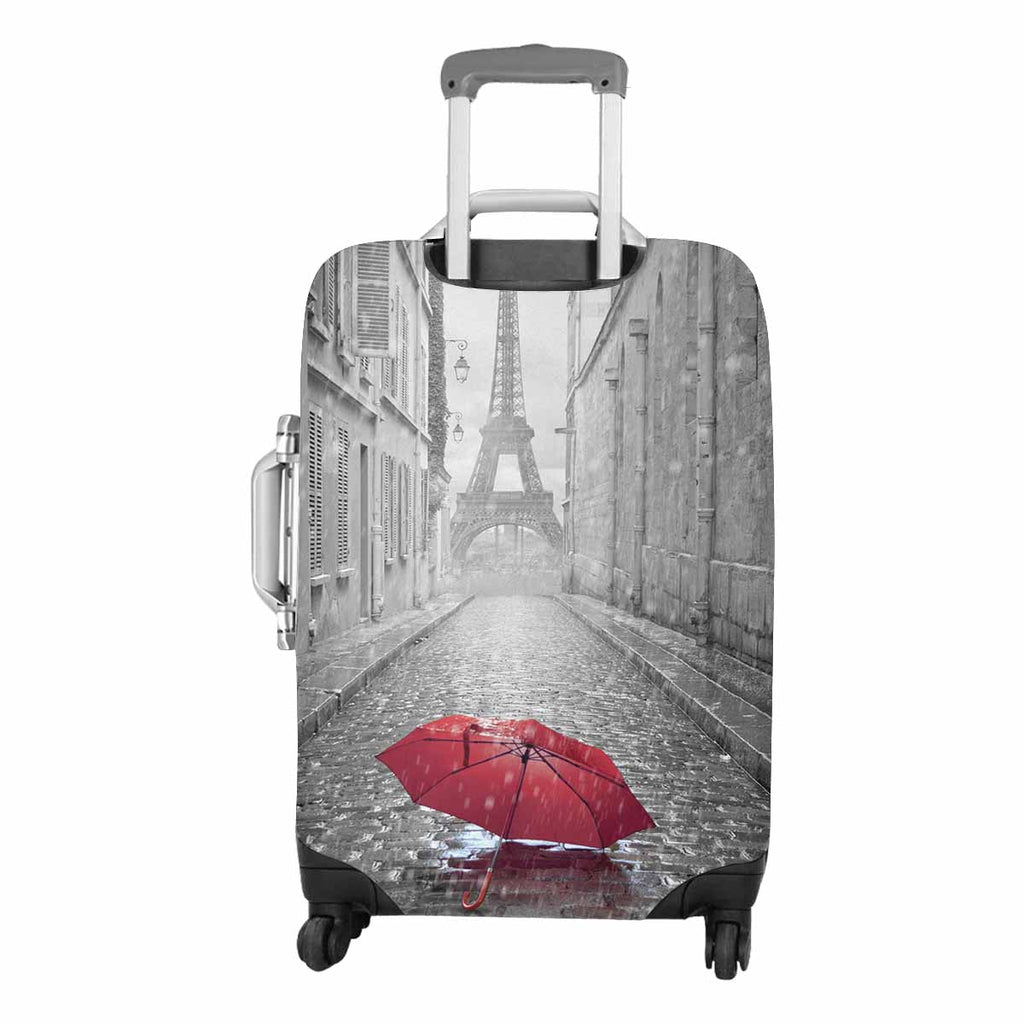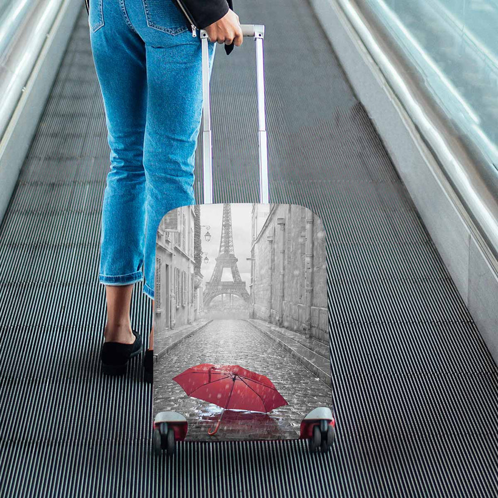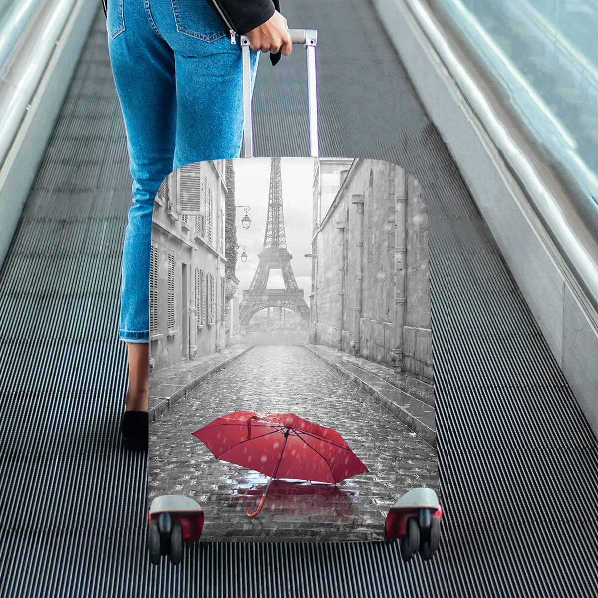Coutry themed Cover for Luggage suitcase printed Eiffel tower view from the street of Paris. Black and white photo with red umbrella.
