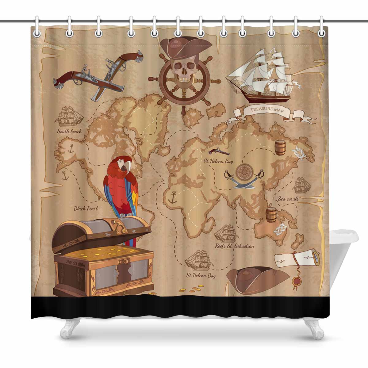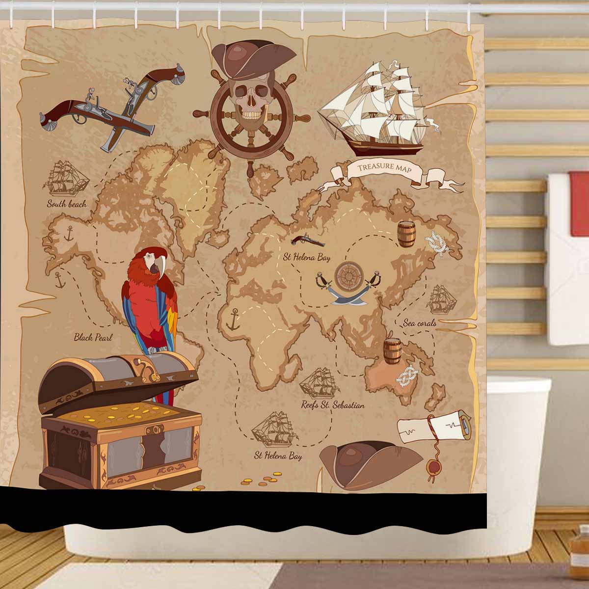 Map themed Shower Curtains print with Old pirate treasure map. Treasure chest parrot steering wheel skull rum saber pirate hat and ship