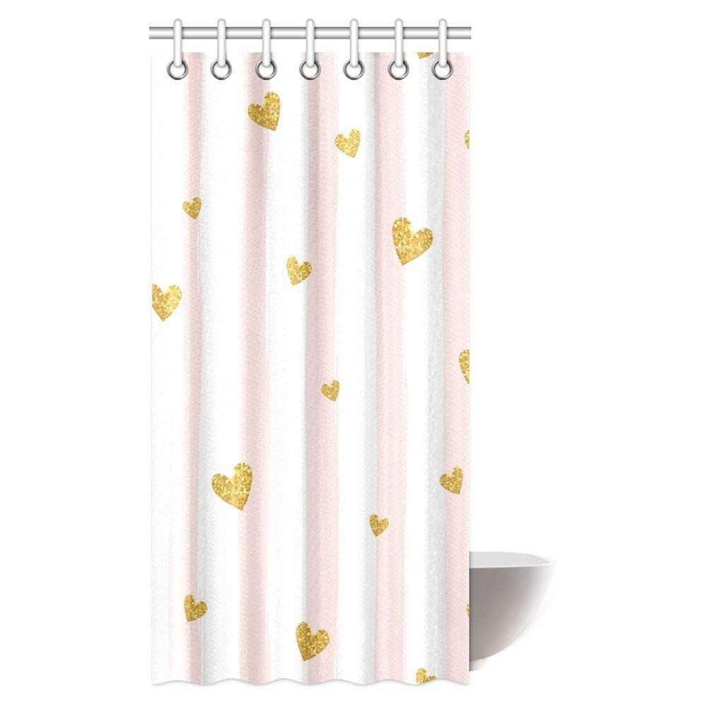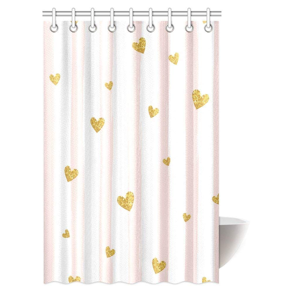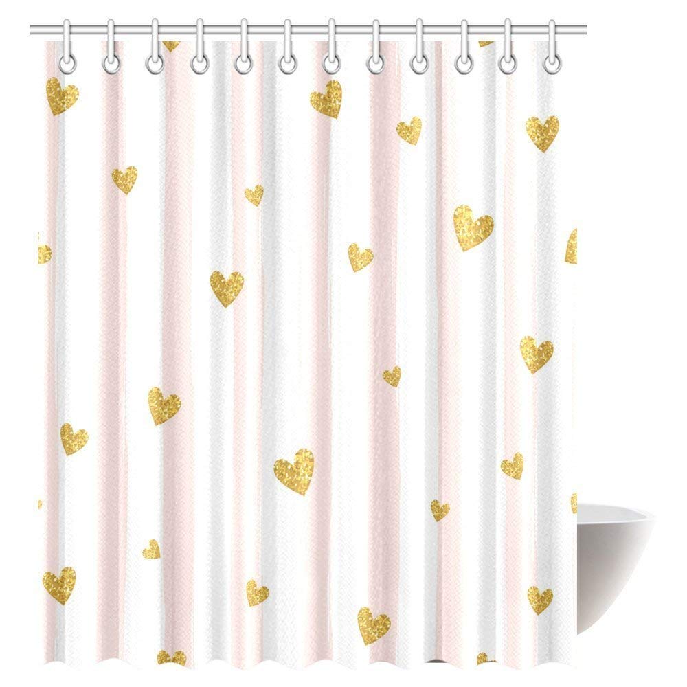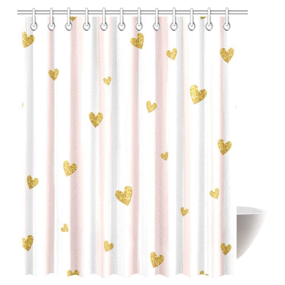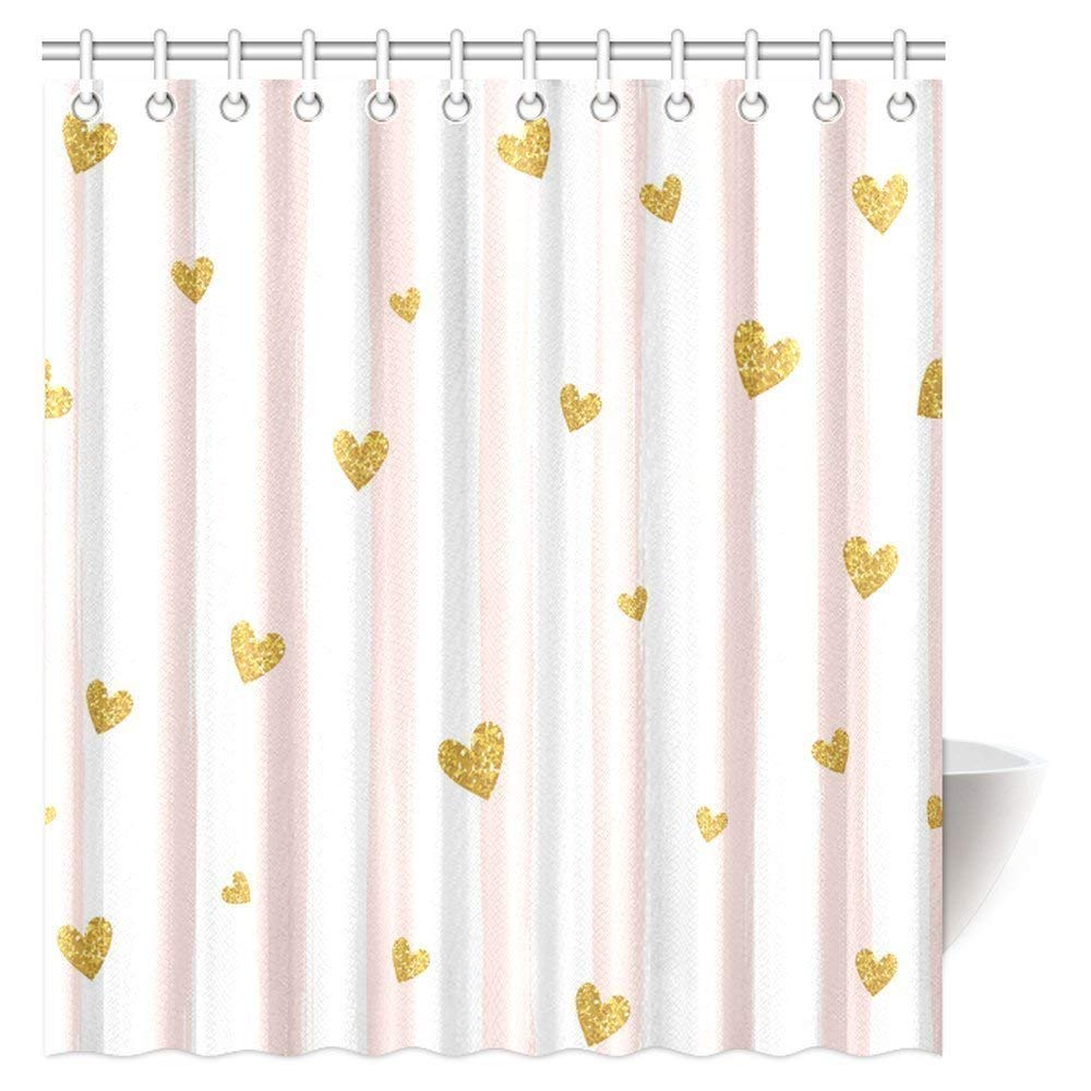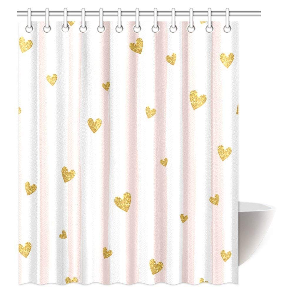 Pink White Striped Decorations Shower Curtain, Gold Glittering Heart Confetti Pattern Bathroom Decor Shower Curtain Set with Hooks