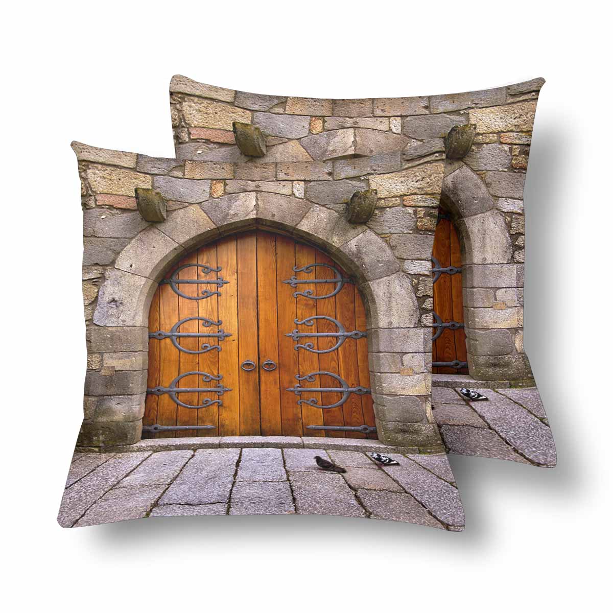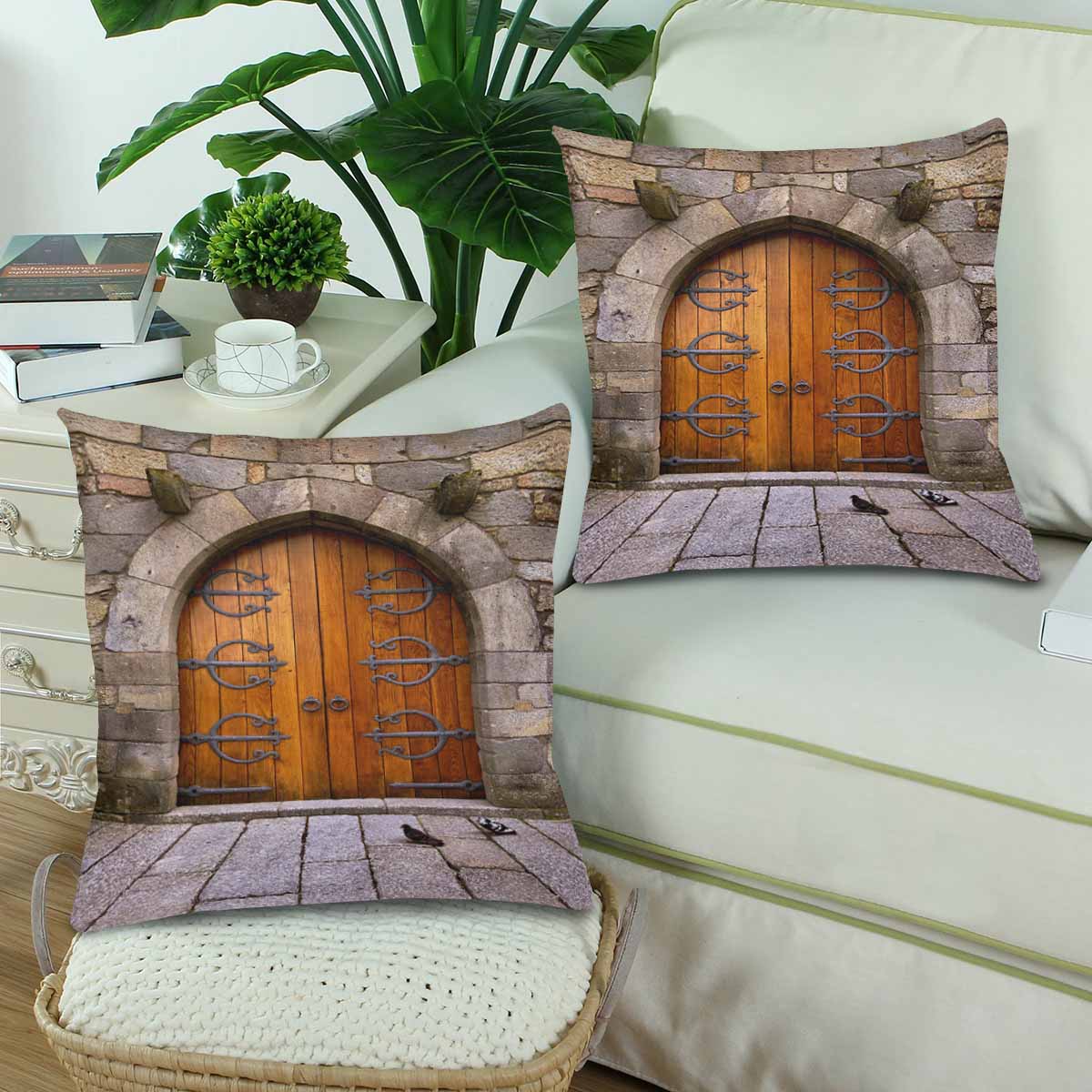 Rustic themed Pillow Cases printed with old wooden door with iron ornaments in a medieval castle