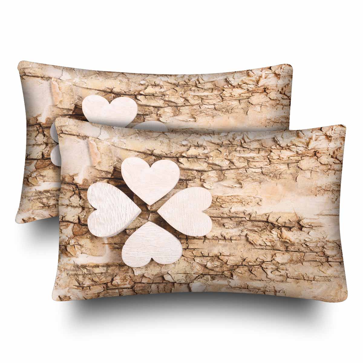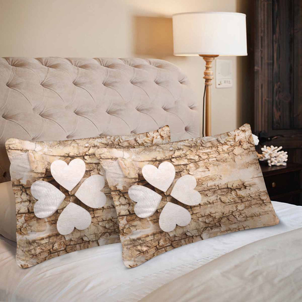 Rustic themed Rectangle Pillow Cases printed wooden hearts on bark background. Symbol of luck