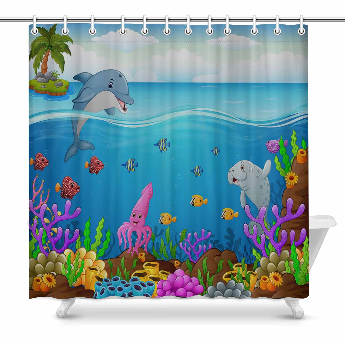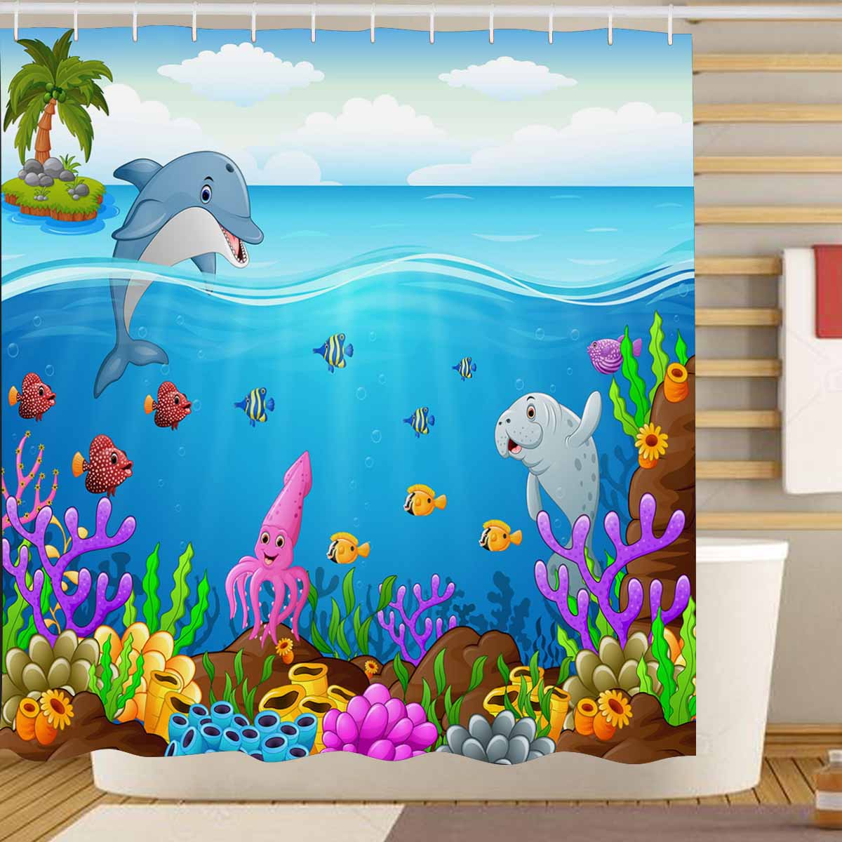 Seaworld Shower Curtains print with cartoon Dolphin walrus Octopus